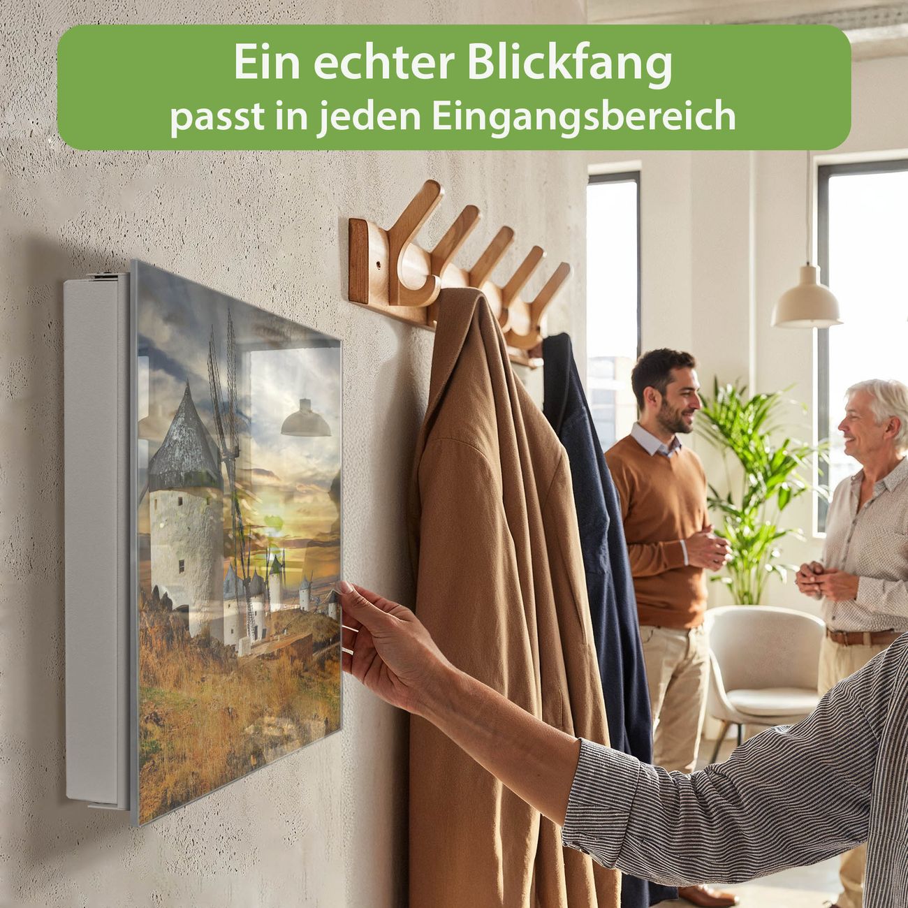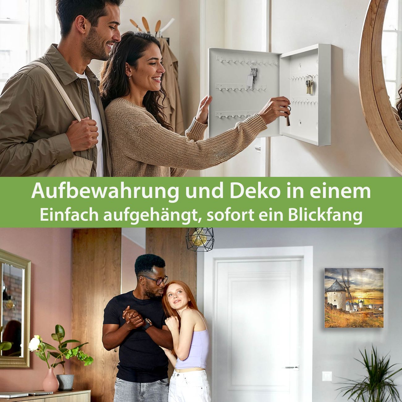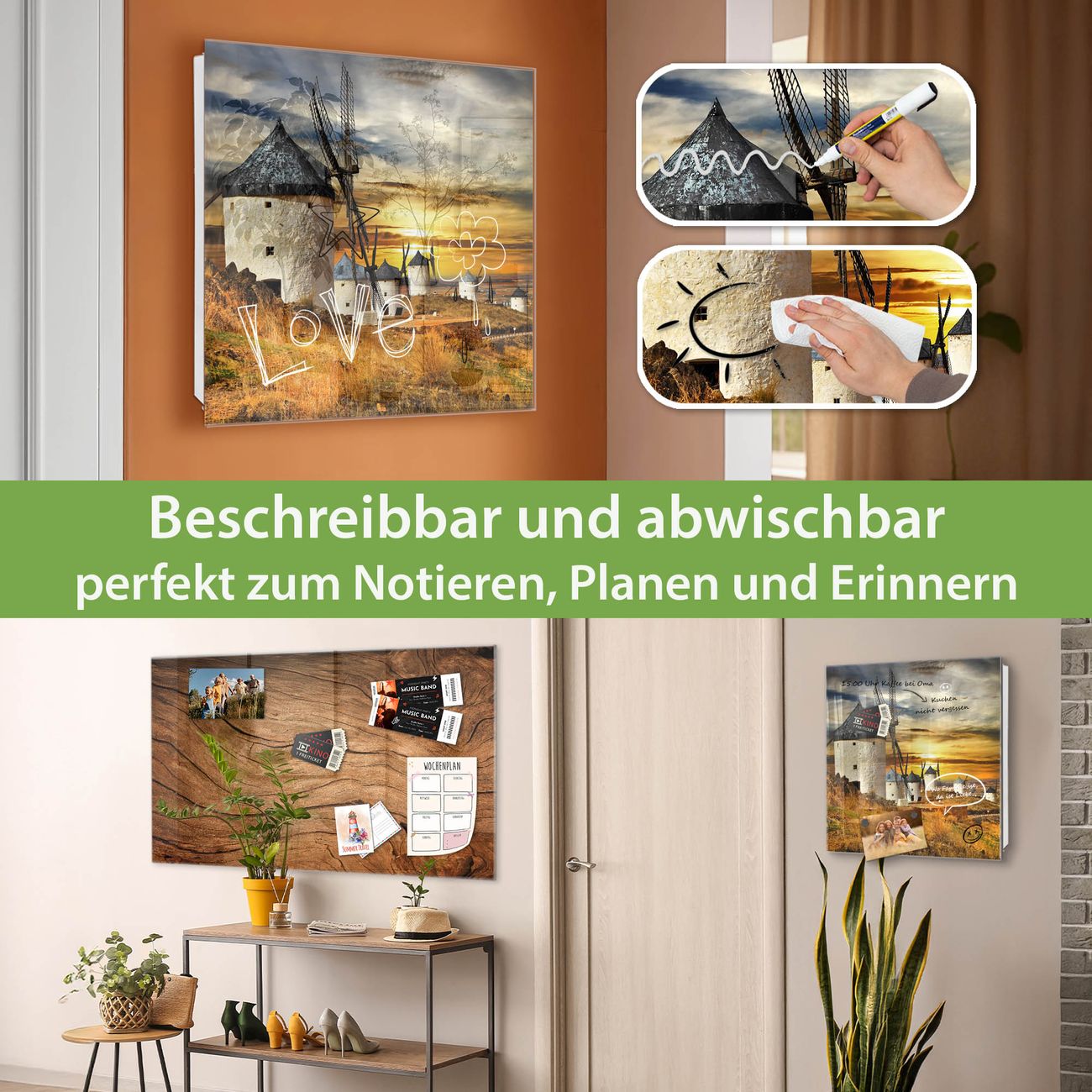 Bringe Ordnung und Eleganz in deinen Eingangsbereich mit dem banjado Schlüsselkasten Motiv Motiv Spanische Windmühlen. Die moderne Schlüsselbox kombiniert funktionales Design mit hochwertiger Verarbeitung und wird so zu einem echten Hingucker in Flur, Büro oder Ferienwohnung. ✅ Stilvolle Schlüsselaufbewahrung mit Glasfront im Motiv Motiv Spanische Windmühlen Der Design-Schlüsselkasten Motiv Motiv Spanische Windmühlen bietet Platz für bis zu 50 Schlüssel, die auf 5 stabilen Reihen mit je 10 Haken übersichtlich verstaut werden. Mit seinen kompakten Maßen von 30 x 30 x 5 cm passt die Schlüsselbox perfekt auch in kleinere Räume. Der weiß lackierte Stahlkorpus mit rechts angeschlagenem Türscharnier harmoniert mit der Glasfront und fügt sich nahtlos in jedes Wohnambiente ein. Ob als Schlüsselorganizer für Zuhause oder als praktische Lösung für Büros, Praxen und Gewerbe, der banjado Schlüsselkasten sorgt für Ordnung und Übersicht. Dank der magnetischen, mit Kreidestiften beschreibbaren Glasfront kannst du Notizen anheften oder Termine direkt auf der Oberfläche festhalten. Die Schlüsselbox Motiv Motiv Spanische Windmühlen zur Wandmontage wird inklusive Befestigungsmaterial geliefert und ist schnell angebracht. So hast du deine Schlüssel jederzeit griffbereit und zugleich stilvoll verstaut. Mit diesem banjado Schlüsselkasten Motiv Motiv Spanische Windmühlen kombinierst du praktische Aufbewahrung mit stilvollem Wohndesign. Ob privat oder geschäftlich, die Schlüsselbox sorgt für mehr Ordnung, Übersicht und ein wohnliches Ambiente.Vorteile im Überblick