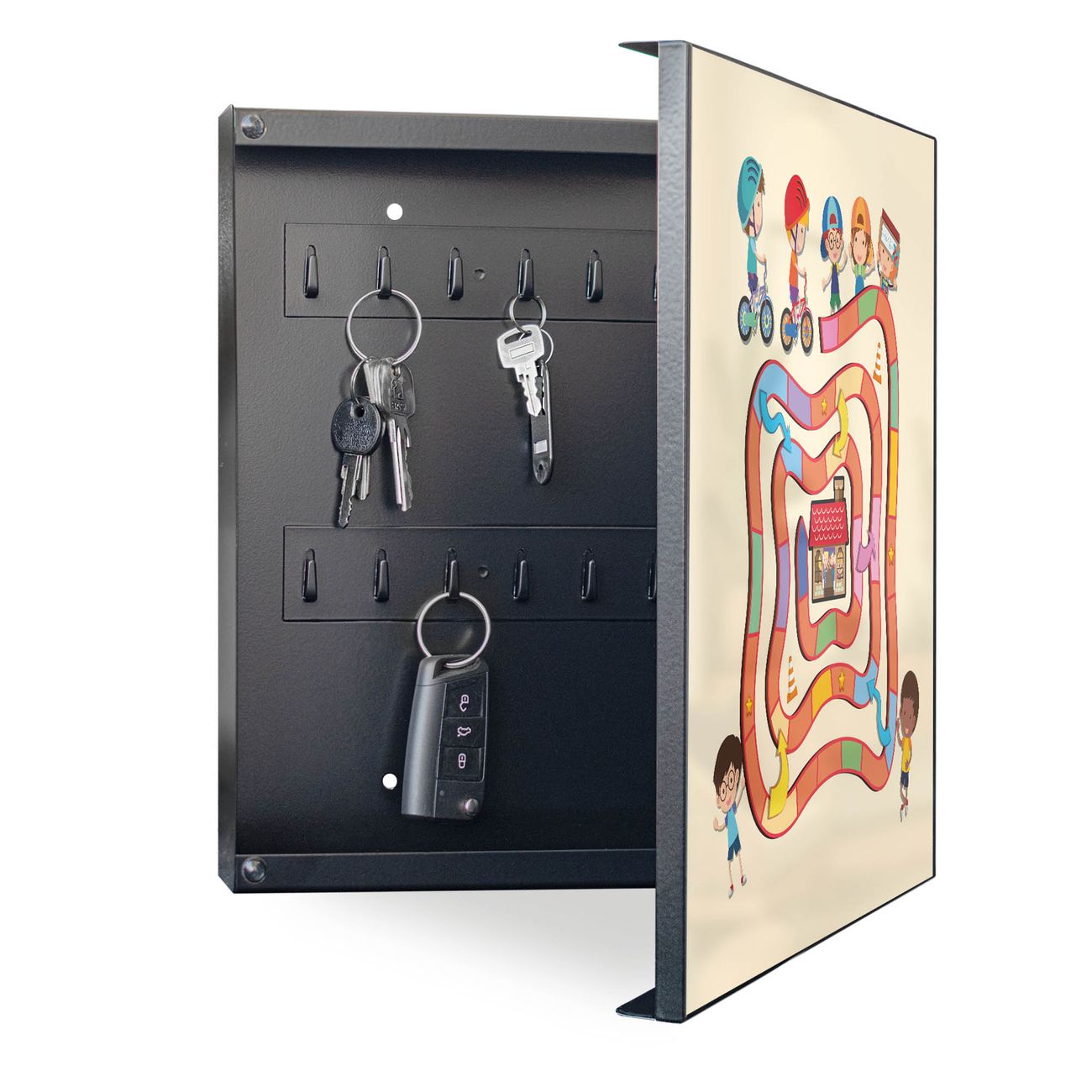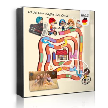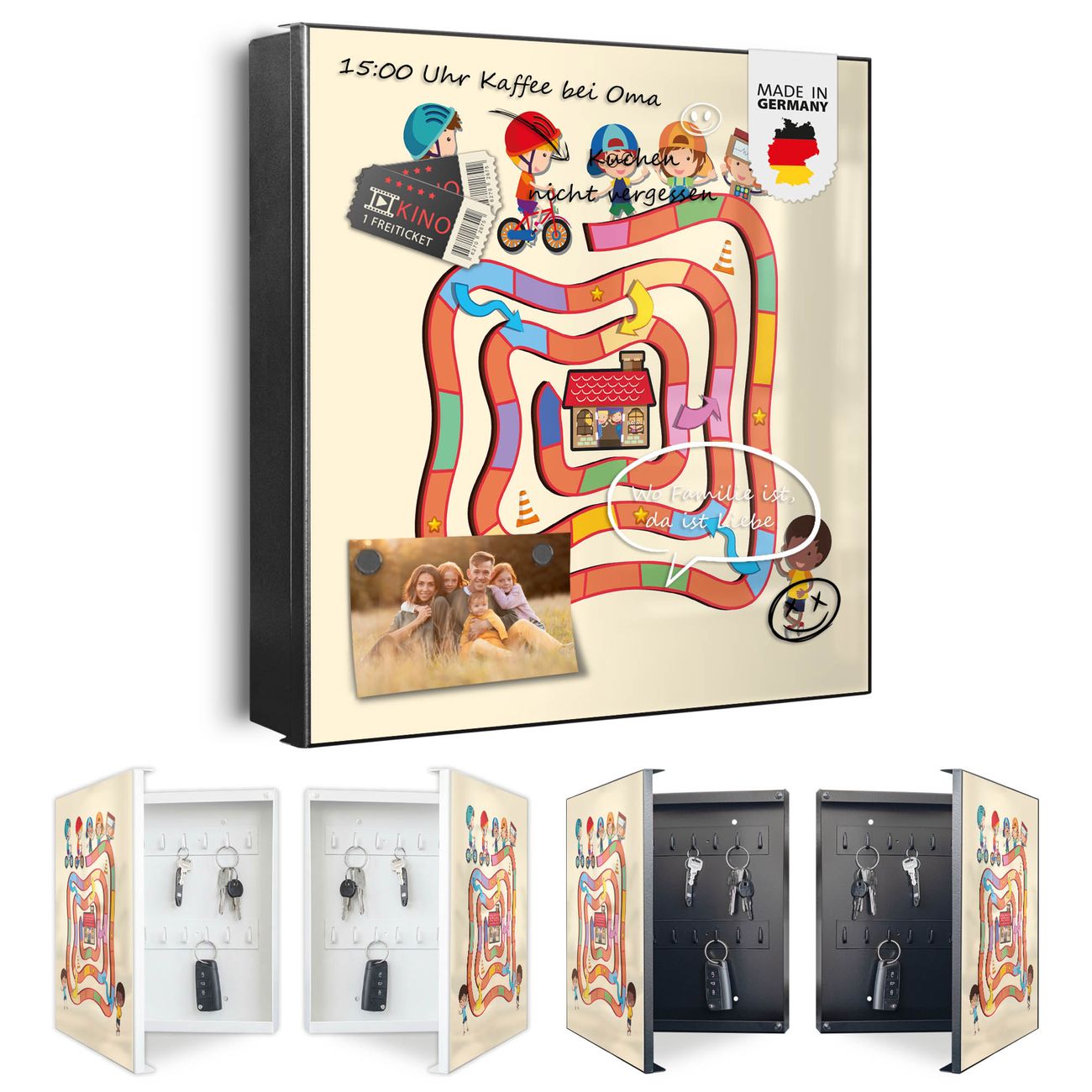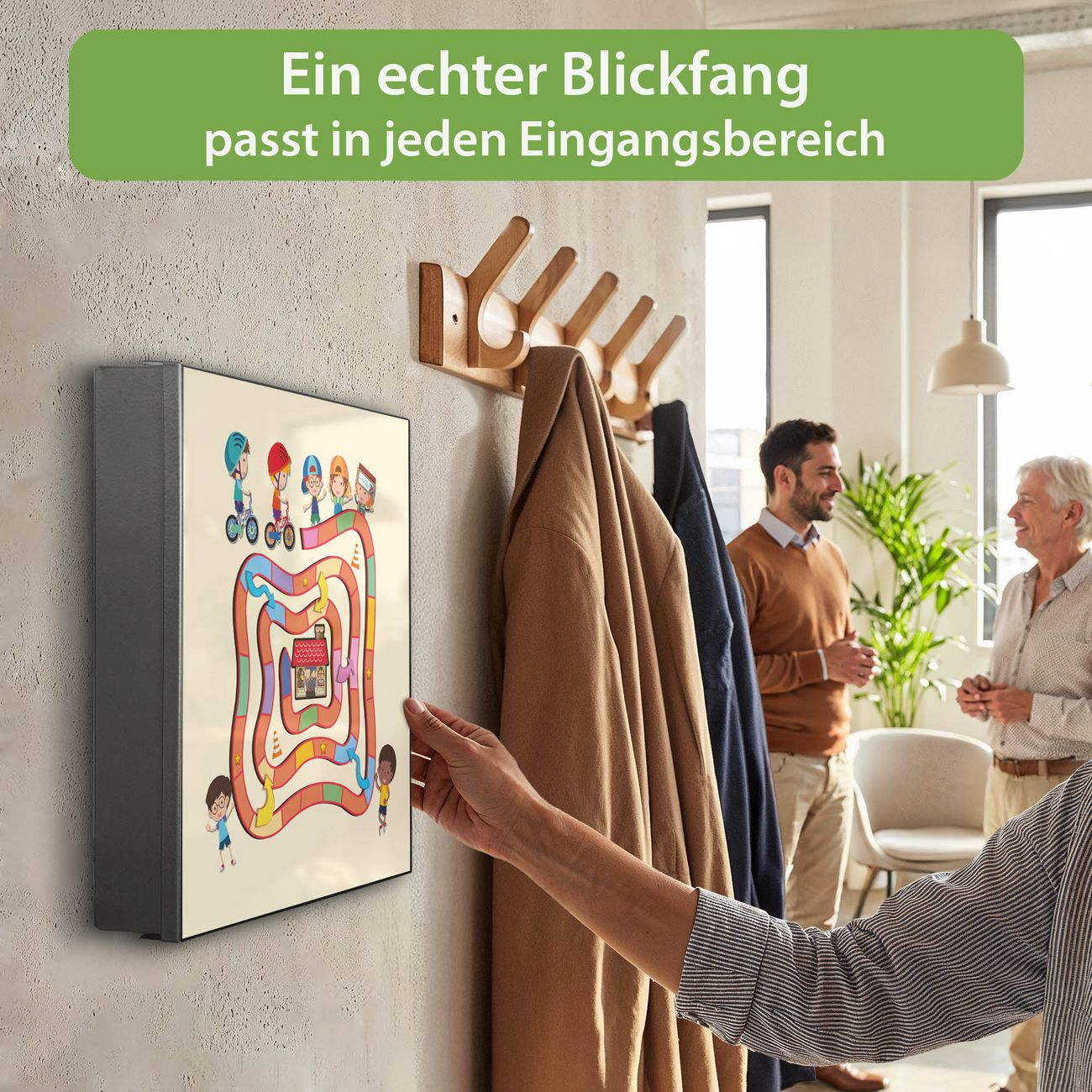Bringe Ordnung und Eleganz in deinen Eingangsbereich mit dem banjado Schlüsselkasten Motiv Motiv Spielbrett 2. Die moderne Schlüsselbox kombiniert funktionales Design mit hochwertiger Verarbeitung und wird so zu einem echten Hingucker in Flur, Büro oder Ferienwohnung. ✅ Stilvolle Schlüsselaufbewahrung mit Motiv Motiv Spielbrett 2 Der Design-Schlüsselkasten Motiv Motiv Spielbrett 2 bietet Platz für bis zu 32 Schlüssel, die auf 4 stabilen Reihen mit je 8 Haken übersichtlich verstaut werden. Mit seinen kompakten Maßen von 30 x 30 x 5 cm passt die Schlüsselbox perfekt auch in kleinere Räume. Der schwarz lackierte Stahlkorpus mit rechts angeschlagenem Türscharnier harmoniert mit gedruckten Folie auf der Front und fügt sich nahtlos in jedes Wohnambiente ein. Ob als Schlüsselorganizer für Zuhause oder als praktische Lösung für Büros, Praxen und Gewerbe, der banjado Schlüsselkasten sorgt für Ordnung und Übersicht. Dank der magnetischen, mit Kreidestiften beschreibbaren Folie auf der Front kannst du Notizen anheften oder Termine direkt auf der Oberfläche festhalten. Die Schlüsselbox Motiv Motiv Spielbrett 2 zur Wandmontage wird inklusive Befestigungsmaterial geliefert und ist schnell angebracht. So hast du deine Schlüssel jederzeit griffbereit und zugleich stilvoll verstaut. Mit diesem banjado Schlüsselkasten Motiv Motiv Spielbrett 2 kombinierst du praktische Aufbewahrung mit stilvollem Wohndesign. Ob privat oder geschäftlich, die Schlüsselbox sorgt für mehr Ordnung, Übersicht und ein wohnliches Ambiente.Vorteile im Überblick