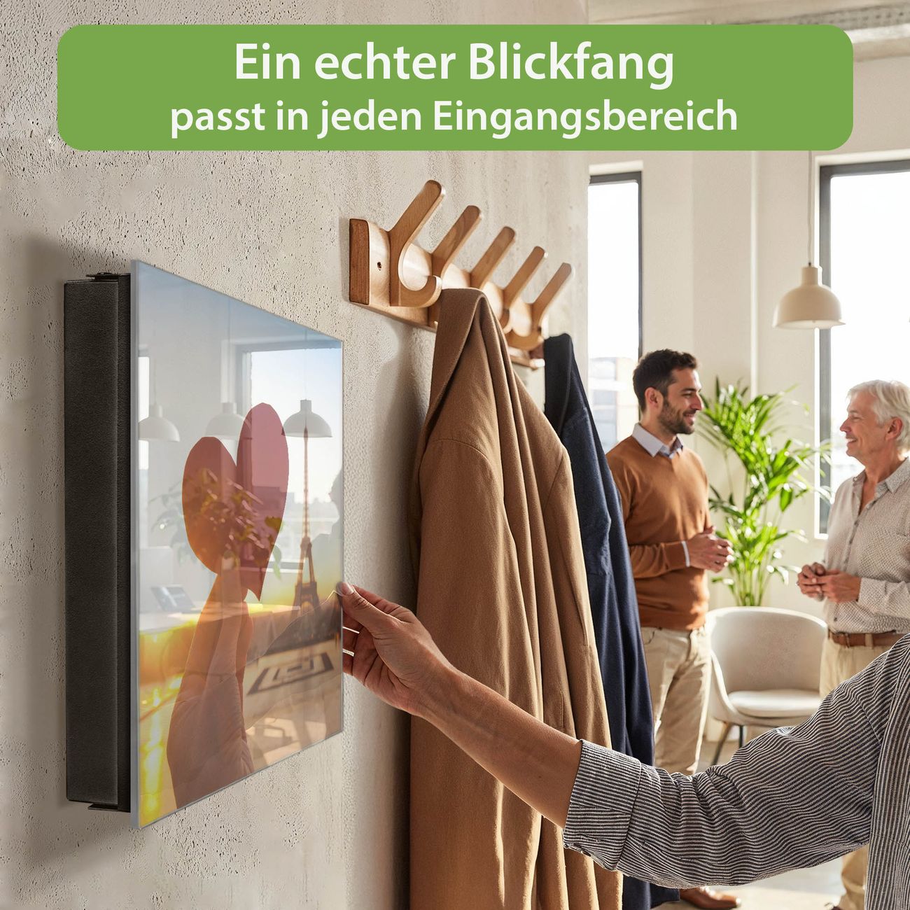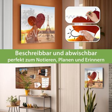 Bringe Ordnung und Eleganz in deinen Eingangsbereich mit dem banjado Schlüsselkasten Motiv Motiv Stadt Der Liebe. Die moderne Schlüsselbox kombiniert funktionales Design mit hochwertiger Verarbeitung und wird so zu einem echten Hingucker in Flur, Büro oder Ferienwohnung. ✅ Stilvolle Schlüsselaufbewahrung mit Glasfront im Motiv Motiv Stadt Der Liebe Der Design-Schlüsselkasten Motiv Motiv Stadt Der Liebe bietet Platz für bis zu 50 Schlüssel, die auf 5 stabilen Reihen mit je 10 Haken übersichtlich verstaut werden. Mit seinen kompakten Maßen von 30 x 30 x 5 cm passt die Schlüsselbox perfekt auch in kleinere Räume. Der schwarz lackierte Stahlkorpus mit rechts angeschlagenem Türscharnier harmoniert mit der Glasfront und fügt sich nahtlos in jedes Wohnambiente ein. Ob als Schlüsselorganizer für Zuhause oder als praktische Lösung für Büros, Praxen und Gewerbe, der banjado Schlüsselkasten sorgt für Ordnung und Übersicht. Dank der magnetischen, mit Kreidestiften beschreibbaren Glasfront kannst du Notizen anheften oder Termine direkt auf der Oberfläche festhalten. Die Schlüsselbox Motiv Motiv Stadt Der Liebe zur Wandmontage wird inklusive Befestigungsmaterial geliefert und ist schnell angebracht. So hast du deine Schlüssel jederzeit griffbereit und zugleich stilvoll verstaut. Mit diesem banjado Schlüsselkasten Motiv Motiv Stadt Der Liebe kombinierst du praktische Aufbewahrung mit stilvollem Wohndesign. Ob privat oder geschäftlich, die Schlüsselbox sorgt für mehr Ordnung, Übersicht und ein wohnliches Ambiente.Vorteile im Überblick