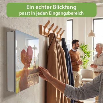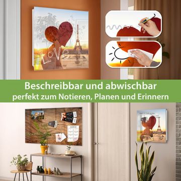 Bringe Ordnung und Eleganz in deinen Eingangsbereich mit dem banjado Schlüsselkasten Motiv Motiv Stadt Der Liebe. Die moderne Schlüsselbox kombiniert funktionales Design mit hochwertiger Verarbeitung und wird so zu einem echten Hingucker in Flur, Büro oder Ferienwohnung. ✅ Stilvolle Schlüsselaufbewahrung mit Glasfront im Motiv Motiv Stadt Der Liebe Der Design-Schlüsselkasten Motiv Motiv Stadt Der Liebe bietet Platz für bis zu 50 Schlüssel, die auf 5 stabilen Reihen mit je 10 Haken übersichtlich verstaut werden. Mit seinen kompakten Maßen von 30 x 30 x 5 cm passt die Schlüsselbox perfekt auch in kleinere Räume. Der weiß lackierte Stahlkorpus mit rechts angeschlagenem Türscharnier harmoniert mit der Glasfront und fügt sich nahtlos in jedes Wohnambiente ein. Ob als Schlüsselorganizer für Zuhause oder als praktische Lösung für Büros, Praxen und Gewerbe, der banjado Schlüsselkasten sorgt für Ordnung und Übersicht. Dank der magnetischen, mit Kreidestiften beschreibbaren Glasfront kannst du Notizen anheften oder Termine direkt auf der Oberfläche festhalten. Die Schlüsselbox Motiv Motiv Stadt Der Liebe zur Wandmontage wird inklusive Befestigungsmaterial geliefert und ist schnell angebracht. So hast du deine Schlüssel jederzeit griffbereit und zugleich stilvoll verstaut. Mit diesem banjado Schlüsselkasten Motiv Motiv Stadt Der Liebe kombinierst du praktische Aufbewahrung mit stilvollem Wohndesign. Ob privat oder geschäftlich, die Schlüsselbox sorgt für mehr Ordnung, Übersicht und ein wohnliches Ambiente.Vorteile im Überblick