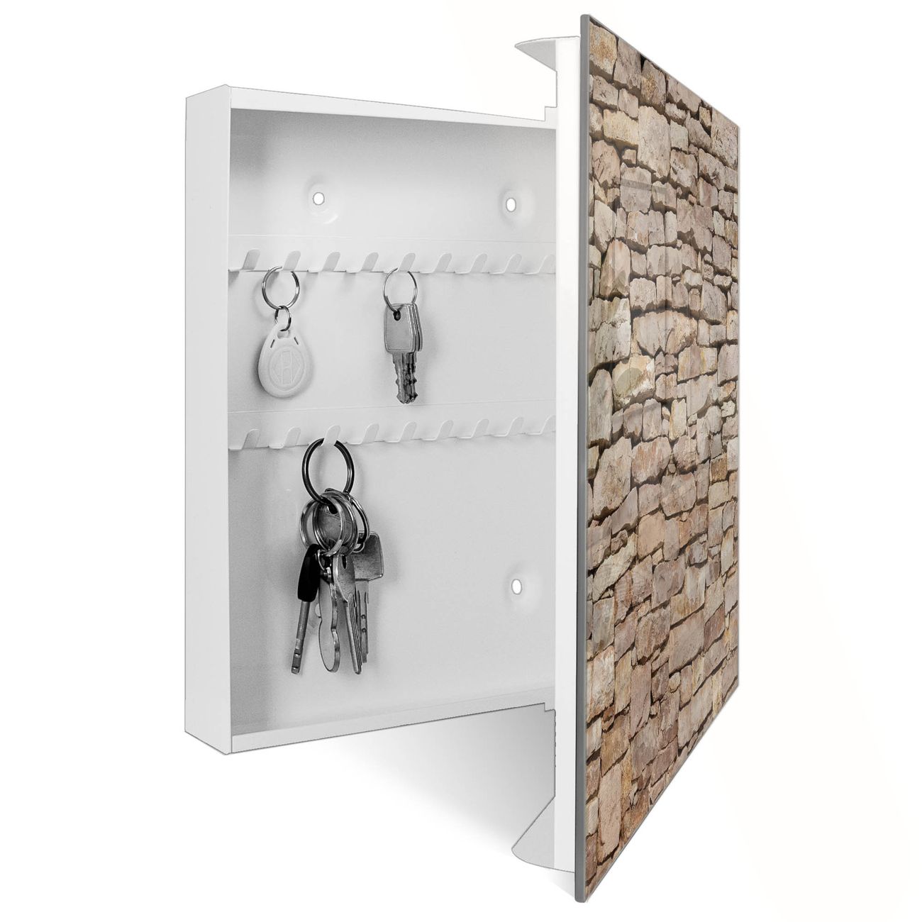 Bringe Ordnung und Eleganz in deinen Eingangsbereich mit dem banjado Schlüsselkasten Motiv Motiv Stadtmauer. Die moderne Schlüsselbox kombiniert funktionales Design mit hochwertiger Verarbeitung und wird so zu einem echten Hingucker in Flur, Büro oder Ferienwohnung. ✅ Stilvolle Schlüsselaufbewahrung mit Glasfront im Motiv Motiv Stadtmauer Der Design-Schlüsselkasten Motiv Motiv Stadtmauer bietet Platz für bis zu 50 Schlüssel, die auf 5 stabilen Reihen mit je 10 Haken übersichtlich verstaut werden. Mit seinen kompakten Maßen von 30 x 30 x 5 cm passt die Schlüsselbox perfekt auch in kleinere Räume. Der weiß lackierte Stahlkorpus mit rechts angeschlagenem Türscharnier harmoniert mit der Glasfront und fügt sich nahtlos in jedes Wohnambiente ein. Ob als Schlüsselorganizer für Zuhause oder als praktische Lösung für Büros, Praxen und Gewerbe, der banjado Schlüsselkasten sorgt für Ordnung und Übersicht. Dank der magnetischen, mit Kreidestiften beschreibbaren Glasfront kannst du Notizen anheften oder Termine direkt auf der Oberfläche festhalten. Die Schlüsselbox Motiv Motiv Stadtmauer zur Wandmontage wird inklusive Befestigungsmaterial geliefert und ist schnell angebracht. So hast du deine Schlüssel jederzeit griffbereit und zugleich stilvoll verstaut. Mit diesem banjado Schlüsselkasten Motiv Motiv Stadtmauer kombinierst du praktische Aufbewahrung mit stilvollem Wohndesign. Ob privat oder geschäftlich, die Schlüsselbox sorgt für mehr Ordnung, Übersicht und ein wohnliches Ambiente.Vorteile im Überblick