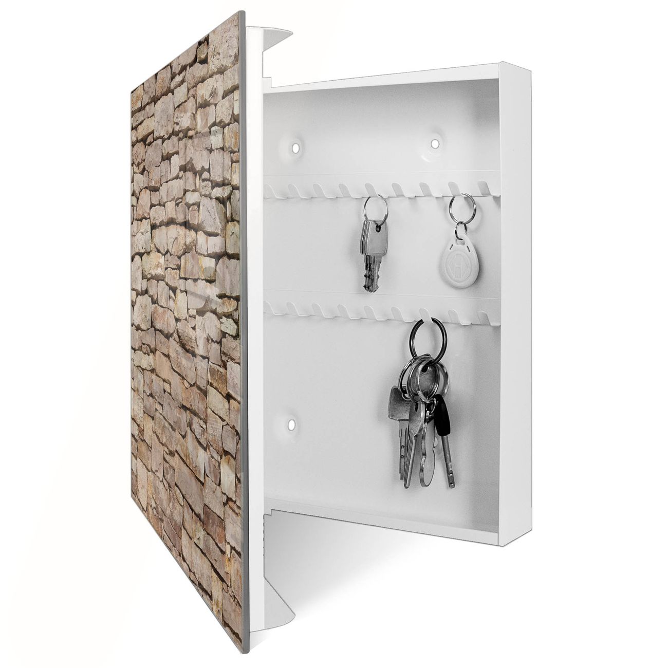 Bringe Ordnung und Eleganz in deinen Eingangsbereich mit dem banjado Schlüsselkasten Motiv Motiv Stadtmauer. Die moderne Schlüsselbox kombiniert funktionales Design mit hochwertiger Verarbeitung und wird so zu einem echten Hingucker in Flur, Büro oder Ferienwohnung. ✅ Stilvolle Schlüsselaufbewahrung mit Glasfront im Motiv Motiv Stadtmauer Der Design-Schlüsselkasten Motiv Motiv Stadtmauer bietet Platz für bis zu 50 Schlüssel, die auf 5 stabilen Reihen mit je 10 Haken übersichtlich verstaut werden. Mit seinen kompakten Maßen von 30 x 30 x 5 cm passt die Schlüsselbox perfekt auch in kleinere Räume. Der weiß lackierte Stahlkorpus mit rechts angeschlagenem Türscharnier harmoniert mit der Glasfront und fügt sich nahtlos in jedes Wohnambiente ein. Ob als Schlüsselorganizer für Zuhause oder als praktische Lösung für Büros, Praxen und Gewerbe, der banjado Schlüsselkasten sorgt für Ordnung und Übersicht. Dank der magnetischen, mit Kreidestiften beschreibbaren Glasfront kannst du Notizen anheften oder Termine direkt auf der Oberfläche festhalten. Die Schlüsselbox Motiv Motiv Stadtmauer zur Wandmontage wird inklusive Befestigungsmaterial geliefert und ist schnell angebracht. So hast du deine Schlüssel jederzeit griffbereit und zugleich stilvoll verstaut. Mit diesem banjado Schlüsselkasten Motiv Motiv Stadtmauer kombinierst du praktische Aufbewahrung mit stilvollem Wohndesign. Ob privat oder geschäftlich, die Schlüsselbox sorgt für mehr Ordnung, Übersicht und ein wohnliches Ambiente.Vorteile im Überblick