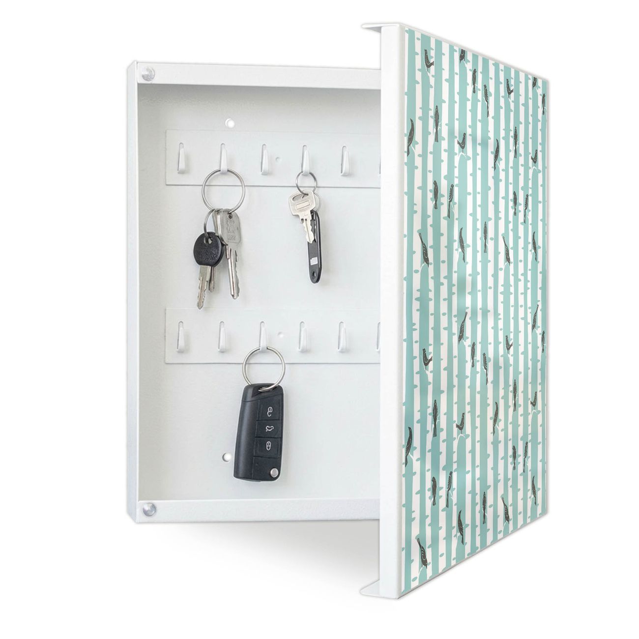 Bringe Ordnung und Eleganz in deinen Eingangsbereich mit dem banjado Schlüsselkasten Motiv Motiv Stare Und Birken. Die moderne Schlüsselbox kombiniert funktionales Design mit hochwertiger Verarbeitung und wird so zu einem echten Hingucker in Flur, Büro oder Ferienwohnung. ✅ Stilvolle Schlüsselaufbewahrung mit Motiv Motiv Stare Und Birken Der Design-Schlüsselkasten Motiv Motiv Stare Und Birken bietet Platz für bis zu 32 Schlüssel, die auf 4 stabilen Reihen mit je 8 Haken übersichtlich verstaut werden. Mit seinen kompakten Maßen von 30 x 30 x 5 cm passt die Schlüsselbox perfekt auch in kleinere Räume. Der weiß lackierte Stahlkorpus mit rechts angeschlagenem Türscharnier harmoniert mit gedruckten Folie auf der Front und fügt sich nahtlos in jedes Wohnambiente ein. Ob als Schlüsselorganizer für Zuhause oder als praktische Lösung für Büros, Praxen und Gewerbe, der banjado Schlüsselkasten sorgt für Ordnung und Übersicht. Dank der magnetischen, mit Kreidestiften beschreibbaren Folie auf der Front kannst du Notizen anheften oder Termine direkt auf der Oberfläche festhalten. Die Schlüsselbox Motiv Motiv Stare Und Birken zur Wandmontage wird inklusive Befestigungsmaterial geliefert und ist schnell angebracht. So hast du deine Schlüssel jederzeit griffbereit und zugleich stilvoll verstaut. Mit diesem banjado Schlüsselkasten Motiv Motiv Stare Und Birken kombinierst du praktische Aufbewahrung mit stilvollem Wohndesign. Ob privat oder geschäftlich, die Schlüsselbox sorgt für mehr Ordnung, Übersicht und ein wohnliches Ambiente.Vorteile im Überblick