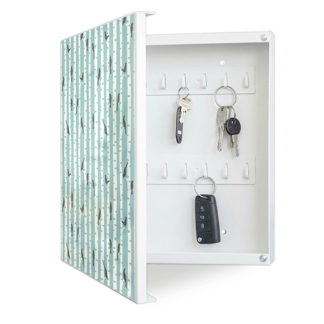 Bringe Ordnung und Eleganz in deinen Eingangsbereich mit dem banjado Schlüsselkasten Motiv Motiv Stare Und Birken. Die moderne Schlüsselbox kombiniert funktionales Design mit hochwertiger Verarbeitung und wird so zu einem echten Hingucker in Flur, Büro oder Ferienwohnung. ✅ Stilvolle Schlüsselaufbewahrung mit Motiv Motiv Stare Und Birken Der Design-Schlüsselkasten Motiv Motiv Stare Und Birken bietet Platz für bis zu 32 Schlüssel, die auf 4 stabilen Reihen mit je 8 Haken übersichtlich verstaut werden. Mit seinen kompakten Maßen von 30 x 30 x 5 cm passt die Schlüsselbox perfekt auch in kleinere Räume. Der weiß lackierte Stahlkorpus mit links angeschlagenem Türscharnier harmoniert mit gedruckten Folie auf der Front und fügt sich nahtlos in jedes Wohnambiente ein. Ob als Schlüsselorganizer für Zuhause oder als praktische Lösung für Büros, Praxen und Gewerbe, der banjado Schlüsselkasten sorgt für Ordnung und Übersicht. Dank der magnetischen, mit Kreidestiften beschreibbaren Folie auf der Front kannst du Notizen anheften oder Termine direkt auf der Oberfläche festhalten. Die Schlüsselbox Motiv Motiv Stare Und Birken zur Wandmontage wird inklusive Befestigungsmaterial geliefert und ist schnell angebracht. So hast du deine Schlüssel jederzeit griffbereit und zugleich stilvoll verstaut. Mit diesem banjado Schlüsselkasten Motiv Motiv Stare Und Birken kombinierst du praktische Aufbewahrung mit stilvollem Wohndesign. Ob privat oder geschäftlich, die Schlüsselbox sorgt für mehr Ordnung, Übersicht und ein wohnliches Ambiente.Vorteile im Überblick