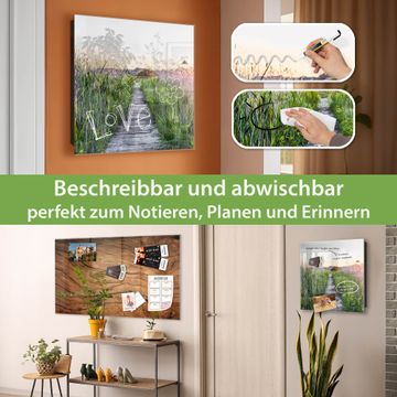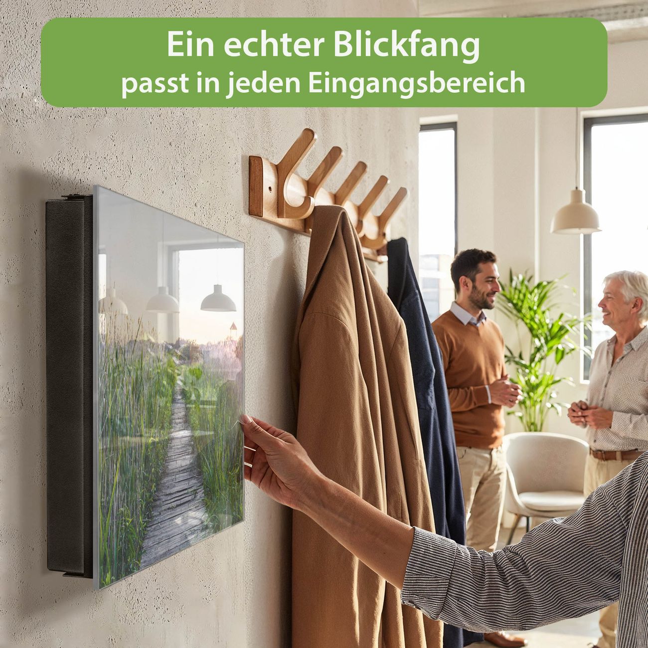 Bringe Ordnung und Eleganz in deinen Eingangsbereich mit dem banjado Schlüsselkasten Motiv Motiv Steg Durchs Schilf. Die moderne Schlüsselbox kombiniert funktionales Design mit hochwertiger Verarbeitung und wird so zu einem echten Hingucker in Flur, Büro oder Ferienwohnung. ✅ Stilvolle Schlüsselaufbewahrung mit Glasfront im Motiv Motiv Steg Durchs Schilf Der Design-Schlüsselkasten Motiv Motiv Steg Durchs Schilf bietet Platz für bis zu 50 Schlüssel, die auf 5 stabilen Reihen mit je 10 Haken übersichtlich verstaut werden. Mit seinen kompakten Maßen von 30 x 30 x 5 cm passt die Schlüsselbox perfekt auch in kleinere Räume. Der schwarz lackierte Stahlkorpus mit rechts angeschlagenem Türscharnier harmoniert mit der Glasfront und fügt sich nahtlos in jedes Wohnambiente ein. Ob als Schlüsselorganizer für Zuhause oder als praktische Lösung für Büros, Praxen und Gewerbe, der banjado Schlüsselkasten sorgt für Ordnung und Übersicht. Dank der magnetischen, mit Kreidestiften beschreibbaren Glasfront kannst du Notizen anheften oder Termine direkt auf der Oberfläche festhalten. Die Schlüsselbox Motiv Motiv Steg Durchs Schilf zur Wandmontage wird inklusive Befestigungsmaterial geliefert und ist schnell angebracht. So hast du deine Schlüssel jederzeit griffbereit und zugleich stilvoll verstaut. Mit diesem banjado Schlüsselkasten Motiv Motiv Steg Durchs Schilf kombinierst du praktische Aufbewahrung mit stilvollem Wohndesign. Ob privat oder geschäftlich, die Schlüsselbox sorgt für mehr Ordnung, Übersicht und ein wohnliches Ambiente.Vorteile im Überblick