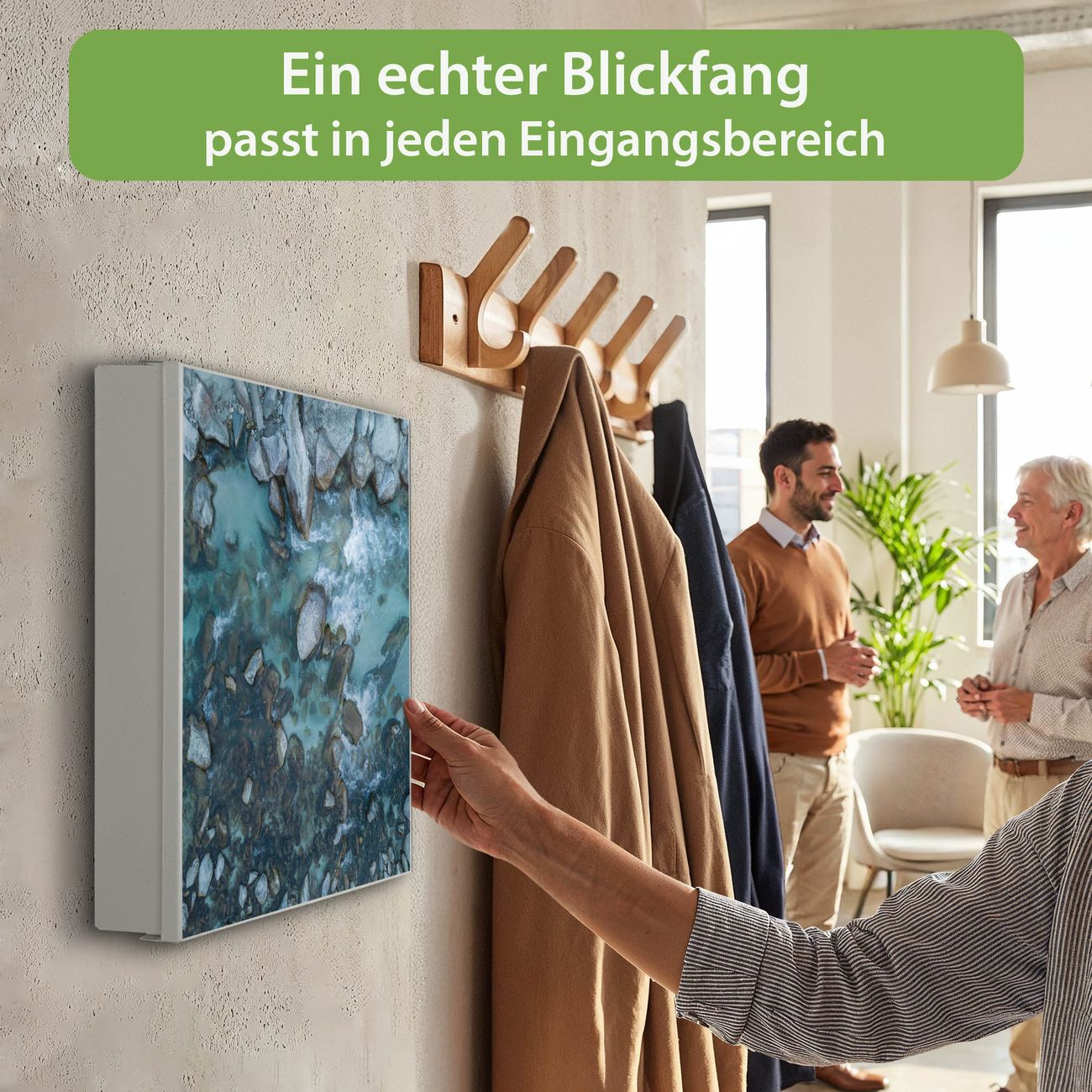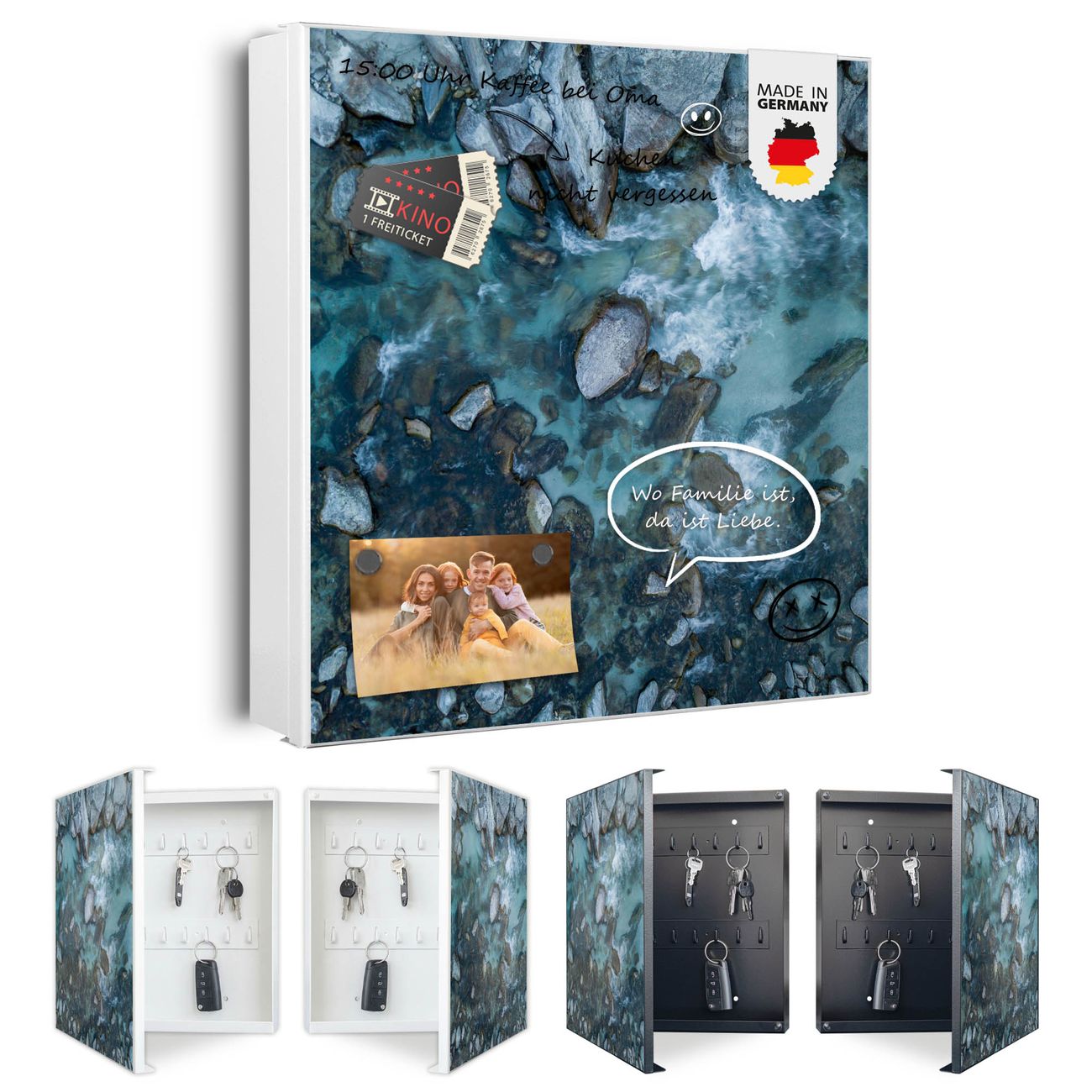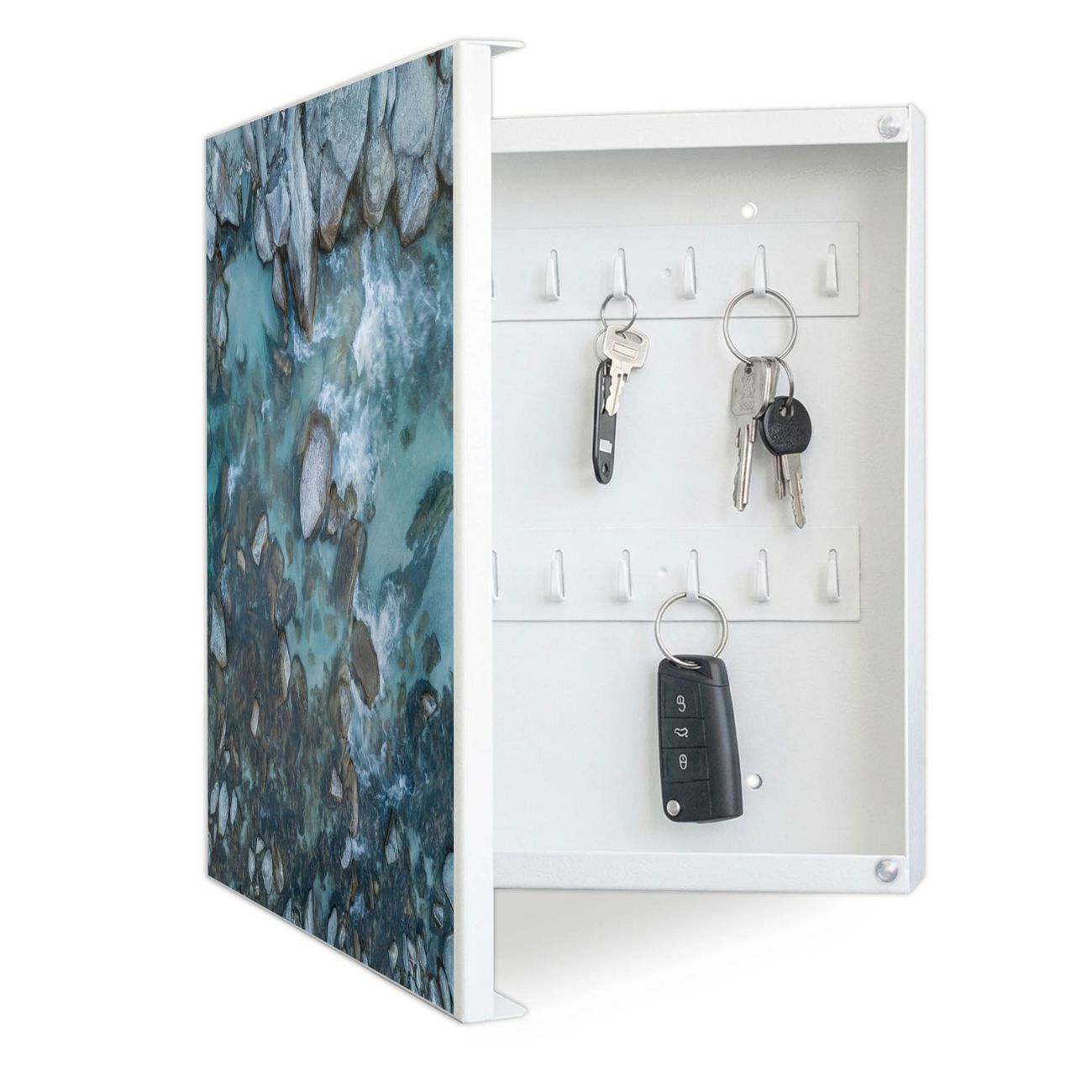 Bringe Ordnung und Eleganz in deinen Eingangsbereich mit dem banjado Schlüsselkasten Motiv Motiv Steinbucht 2. Die moderne Schlüsselbox kombiniert funktionales Design mit hochwertiger Verarbeitung und wird so zu einem echten Hingucker in Flur, Büro oder Ferienwohnung. ✅ Stilvolle Schlüsselaufbewahrung mit Motiv Motiv Steinbucht 2 Der Design-Schlüsselkasten Motiv Motiv Steinbucht 2 bietet Platz für bis zu 32 Schlüssel, die auf 4 stabilen Reihen mit je 8 Haken übersichtlich verstaut werden. Mit seinen kompakten Maßen von 30 x 30 x 5 cm passt die Schlüsselbox perfekt auch in kleinere Räume. Der weiß lackierte Stahlkorpus mit links angeschlagenem Türscharnier harmoniert mit gedruckten Folie auf der Front und fügt sich nahtlos in jedes Wohnambiente ein. Ob als Schlüsselorganizer für Zuhause oder als praktische Lösung für Büros, Praxen und Gewerbe, der banjado Schlüsselkasten sorgt für Ordnung und Übersicht. Dank der magnetischen, mit Kreidestiften beschreibbaren Folie auf der Front kannst du Notizen anheften oder Termine direkt auf der Oberfläche festhalten. Die Schlüsselbox Motiv Motiv Steinbucht 2 zur Wandmontage wird inklusive Befestigungsmaterial geliefert und ist schnell angebracht. So hast du deine Schlüssel jederzeit griffbereit und zugleich stilvoll verstaut. Mit diesem banjado Schlüsselkasten Motiv Motiv Steinbucht 2 kombinierst du praktische Aufbewahrung mit stilvollem Wohndesign. Ob privat oder geschäftlich, die Schlüsselbox sorgt für mehr Ordnung, Übersicht und ein wohnliches Ambiente.Vorteile im Überblick