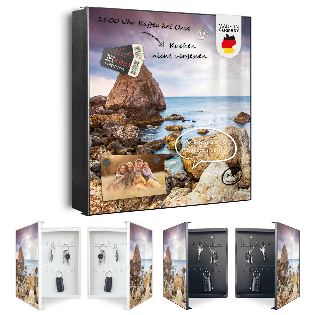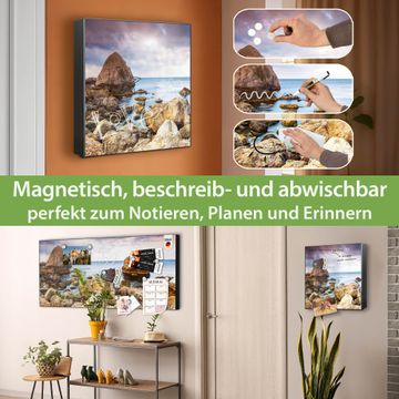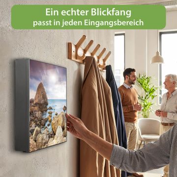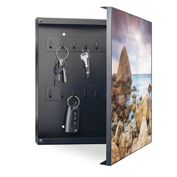 Bringe Ordnung und Eleganz in deinen Eingangsbereich mit dem banjado Schlüsselkasten Motiv Motiv Steinbucht. Die moderne Schlüsselbox kombiniert funktionales Design mit hochwertiger Verarbeitung und wird so zu einem echten Hingucker in Flur, Büro oder Ferienwohnung. ✅ Stilvolle Schlüsselaufbewahrung mit Motiv Motiv Steinbucht Der Design-Schlüsselkasten Motiv Motiv Steinbucht bietet Platz für bis zu 32 Schlüssel, die auf 4 stabilen Reihen mit je 8 Haken übersichtlich verstaut werden. Mit seinen kompakten Maßen von 30 x 30 x 5 cm passt die Schlüsselbox perfekt auch in kleinere Räume. Der schwarz lackierte Stahlkorpus mit rechts angeschlagenem Türscharnier harmoniert mit gedruckten Folie auf der Front und fügt sich nahtlos in jedes Wohnambiente ein. Ob als Schlüsselorganizer für Zuhause oder als praktische Lösung für Büros, Praxen und Gewerbe, der banjado Schlüsselkasten sorgt für Ordnung und Übersicht. Dank der magnetischen, mit Kreidestiften beschreibbaren Folie auf der Front kannst du Notizen anheften oder Termine direkt auf der Oberfläche festhalten. Die Schlüsselbox Motiv Motiv Steinbucht zur Wandmontage wird inklusive Befestigungsmaterial geliefert und ist schnell angebracht. So hast du deine Schlüssel jederzeit griffbereit und zugleich stilvoll verstaut. Mit diesem banjado Schlüsselkasten Motiv Motiv Steinbucht kombinierst du praktische Aufbewahrung mit stilvollem Wohndesign. Ob privat oder geschäftlich, die Schlüsselbox sorgt für mehr Ordnung, Übersicht und ein wohnliches Ambiente.Vorteile im Überblick