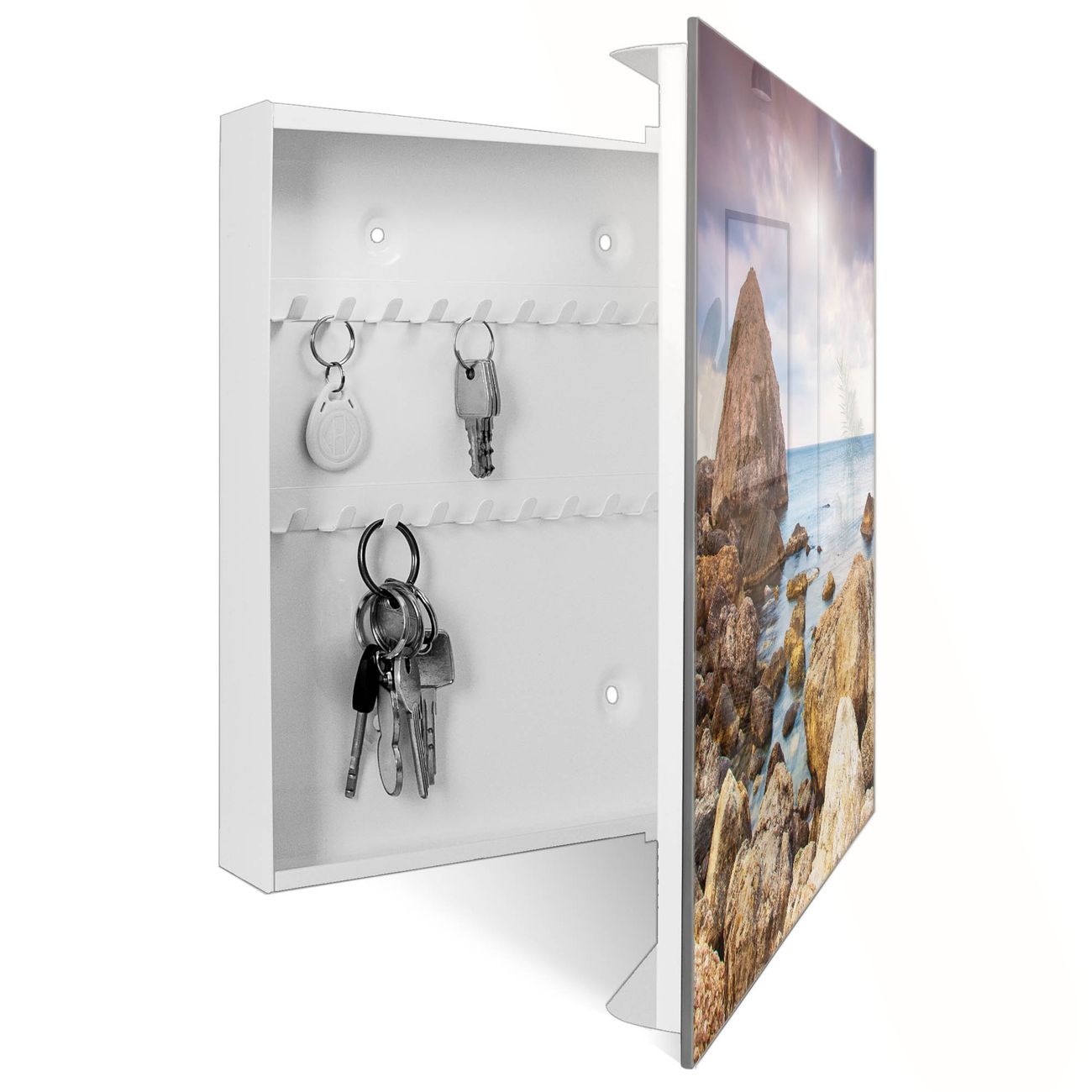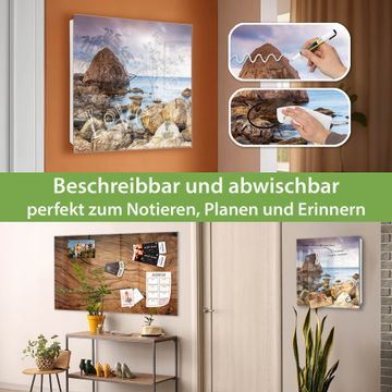 Bringe Ordnung und Eleganz in deinen Eingangsbereich mit dem banjado Schlüsselkasten Motiv Motiv Steinbucht. Die moderne Schlüsselbox kombiniert funktionales Design mit hochwertiger Verarbeitung und wird so zu einem echten Hingucker in Flur, Büro oder Ferienwohnung. ✅ Stilvolle Schlüsselaufbewahrung mit Glasfront im Motiv Motiv Steinbucht Der Design-Schlüsselkasten Motiv Motiv Steinbucht bietet Platz für bis zu 50 Schlüssel, die auf 5 stabilen Reihen mit je 10 Haken übersichtlich verstaut werden. Mit seinen kompakten Maßen von 30 x 30 x 5 cm passt die Schlüsselbox perfekt auch in kleinere Räume. Der weiß lackierte Stahlkorpus mit rechts angeschlagenem Türscharnier harmoniert mit der Glasfront und fügt sich nahtlos in jedes Wohnambiente ein. Ob als Schlüsselorganizer für Zuhause oder als praktische Lösung für Büros, Praxen und Gewerbe, der banjado Schlüsselkasten sorgt für Ordnung und Übersicht. Dank der magnetischen, mit Kreidestiften beschreibbaren Glasfront kannst du Notizen anheften oder Termine direkt auf der Oberfläche festhalten. Die Schlüsselbox Motiv Motiv Steinbucht zur Wandmontage wird inklusive Befestigungsmaterial geliefert und ist schnell angebracht. So hast du deine Schlüssel jederzeit griffbereit und zugleich stilvoll verstaut. Mit diesem banjado Schlüsselkasten Motiv Motiv Steinbucht kombinierst du praktische Aufbewahrung mit stilvollem Wohndesign. Ob privat oder geschäftlich, die Schlüsselbox sorgt für mehr Ordnung, Übersicht und ein wohnliches Ambiente.Vorteile im Überblick