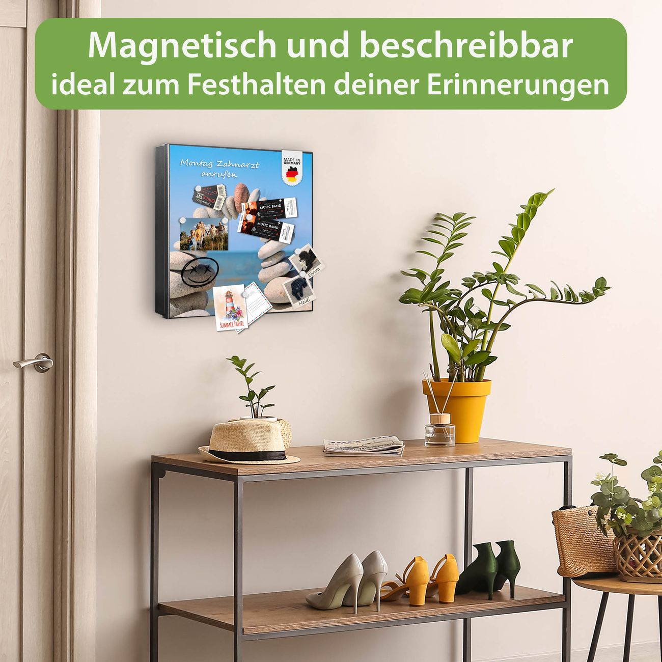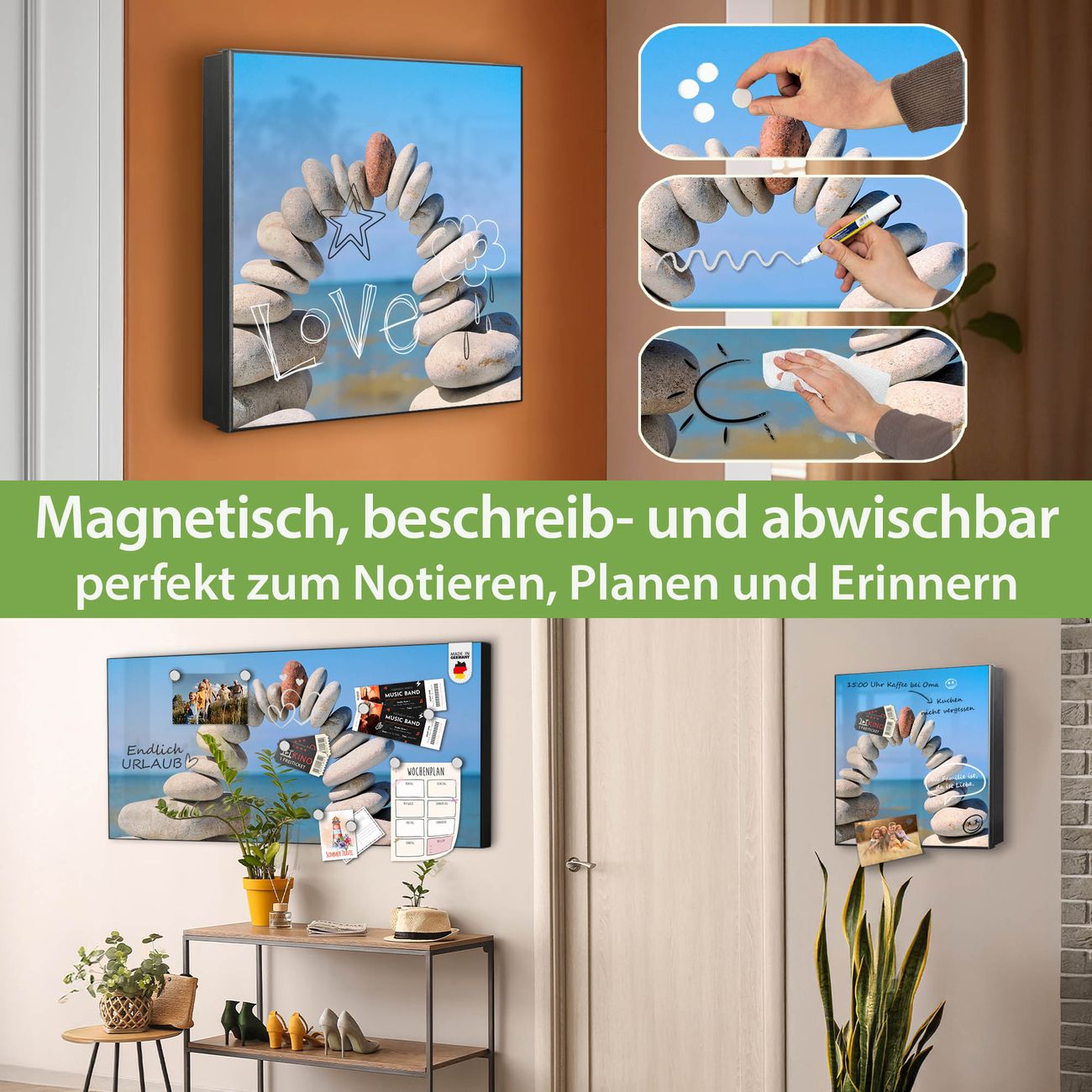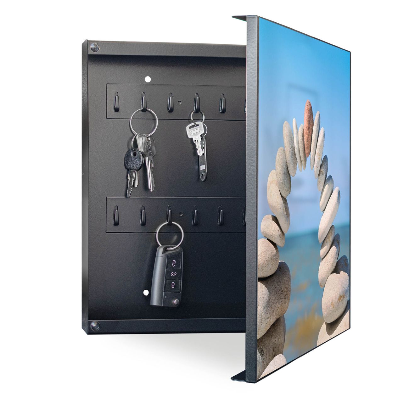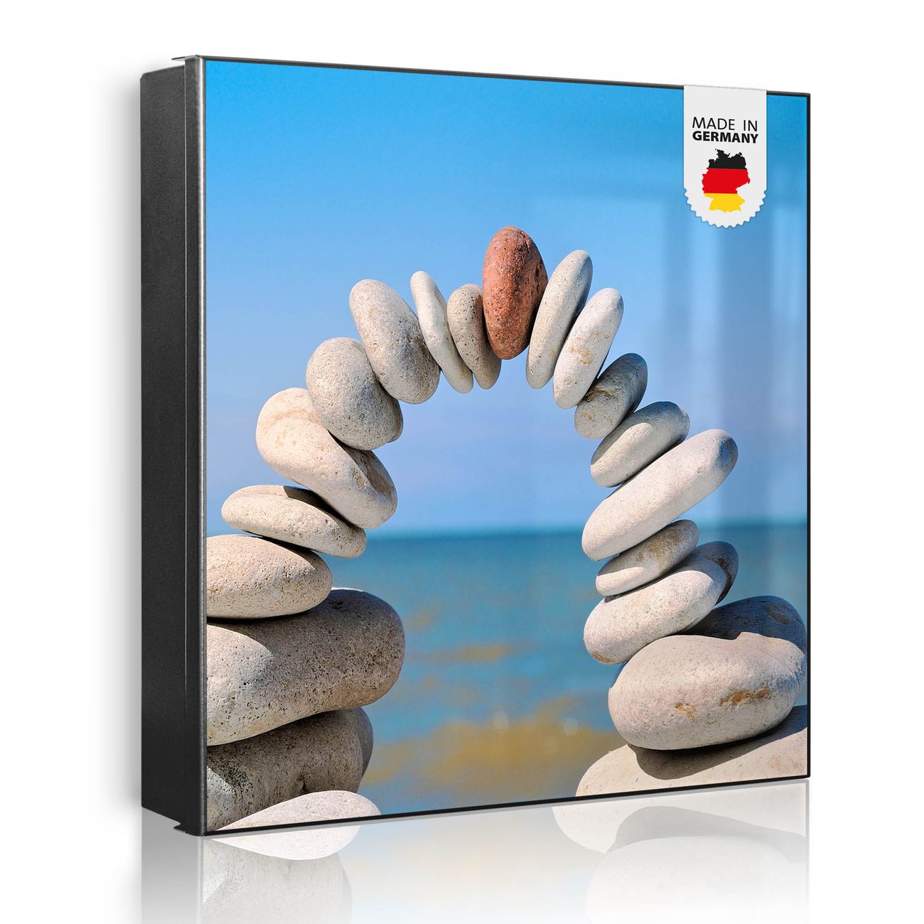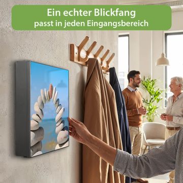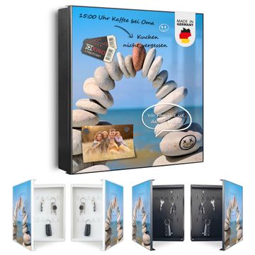 Bringe Ordnung und Eleganz in deinen Eingangsbereich mit dem banjado Schlüsselkasten Motiv Motiv Steine&Meer. Die moderne Schlüsselbox kombiniert funktionales Design mit hochwertiger Verarbeitung und wird so zu einem echten Hingucker in Flur, Büro oder Ferienwohnung. ✅ Stilvolle Schlüsselaufbewahrung mit Motiv Motiv Steine&Meer Der Design-Schlüsselkasten Motiv Motiv Steine&Meer bietet Platz für bis zu 32 Schlüssel, die auf 4 stabilen Reihen mit je 8 Haken übersichtlich verstaut werden. Mit seinen kompakten Maßen von 30 x 30 x 5 cm passt die Schlüsselbox perfekt auch in kleinere Räume. Der schwarz lackierte Stahlkorpus mit rechts angeschlagenem Türscharnier harmoniert mit gedruckten Folie auf der Front und fügt sich nahtlos in jedes Wohnambiente ein. Ob als Schlüsselorganizer für Zuhause oder als praktische Lösung für Büros, Praxen und Gewerbe, der banjado Schlüsselkasten sorgt für Ordnung und Übersicht. Dank der magnetischen, mit Kreidestiften beschreibbaren Folie auf der Front kannst du Notizen anheften oder Termine direkt auf der Oberfläche festhalten. Die Schlüsselbox Motiv Motiv Steine&Meer zur Wandmontage wird inklusive Befestigungsmaterial geliefert und ist schnell angebracht. So hast du deine Schlüssel jederzeit griffbereit und zugleich stilvoll verstaut. Mit diesem banjado Schlüsselkasten Motiv Motiv Steine&Meer kombinierst du praktische Aufbewahrung mit stilvollem Wohndesign. Ob privat oder geschäftlich, die Schlüsselbox sorgt für mehr Ordnung, Übersicht und ein wohnliches Ambiente.Vorteile im Überblick
