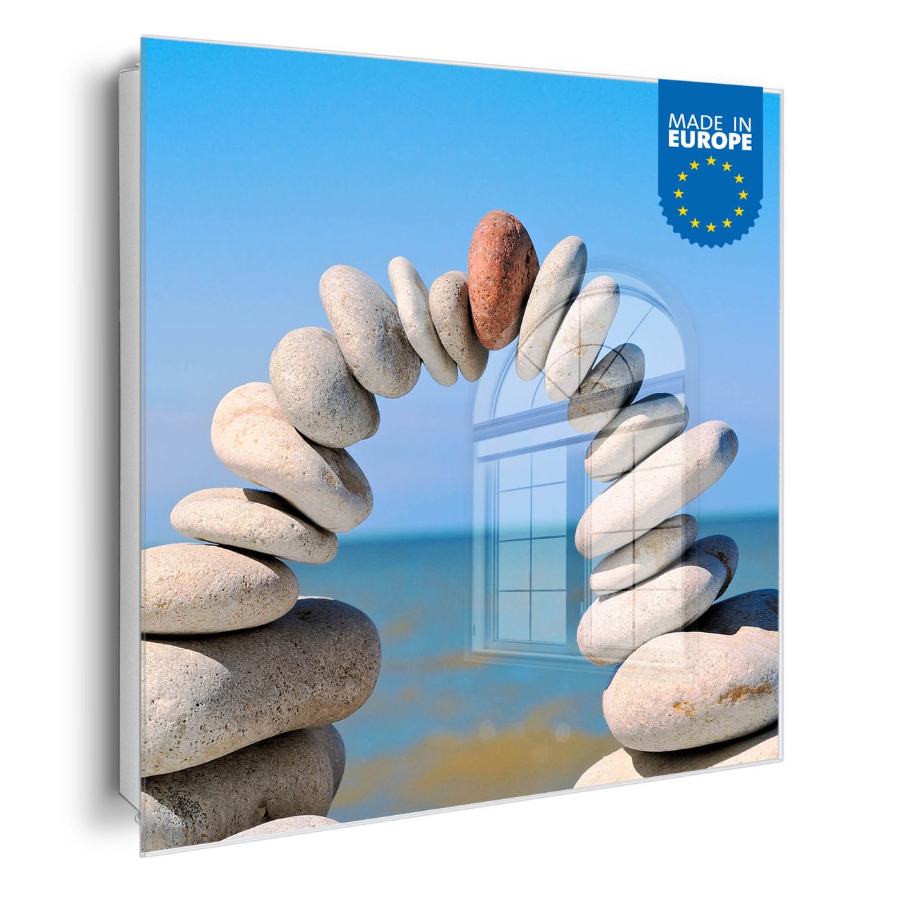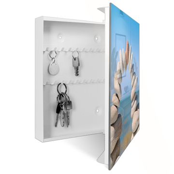 Bringe Ordnung und Eleganz in deinen Eingangsbereich mit dem banjado Schlüsselkasten Motiv Motiv Steine&Meer. Die moderne Schlüsselbox kombiniert funktionales Design mit hochwertiger Verarbeitung und wird so zu einem echten Hingucker in Flur, Büro oder Ferienwohnung. ✅ Stilvolle Schlüsselaufbewahrung mit Glasfront im Motiv Motiv Steine&Meer Der Design-Schlüsselkasten Motiv Motiv Steine&Meer bietet Platz für bis zu 50 Schlüssel, die auf 5 stabilen Reihen mit je 10 Haken übersichtlich verstaut werden. Mit seinen kompakten Maßen von 30 x 30 x 5 cm passt die Schlüsselbox perfekt auch in kleinere Räume. Der weiß lackierte Stahlkorpus mit rechts angeschlagenem Türscharnier harmoniert mit der Glasfront und fügt sich nahtlos in jedes Wohnambiente ein. Ob als Schlüsselorganizer für Zuhause oder als praktische Lösung für Büros, Praxen und Gewerbe, der banjado Schlüsselkasten sorgt für Ordnung und Übersicht. Dank der magnetischen, mit Kreidestiften beschreibbaren Glasfront kannst du Notizen anheften oder Termine direkt auf der Oberfläche festhalten. Die Schlüsselbox Motiv Motiv Steine&Meer zur Wandmontage wird inklusive Befestigungsmaterial geliefert und ist schnell angebracht. So hast du deine Schlüssel jederzeit griffbereit und zugleich stilvoll verstaut. Mit diesem banjado Schlüsselkasten Motiv Motiv Steine&Meer kombinierst du praktische Aufbewahrung mit stilvollem Wohndesign. Ob privat oder geschäftlich, die Schlüsselbox sorgt für mehr Ordnung, Übersicht und ein wohnliches Ambiente.Vorteile im Überblick