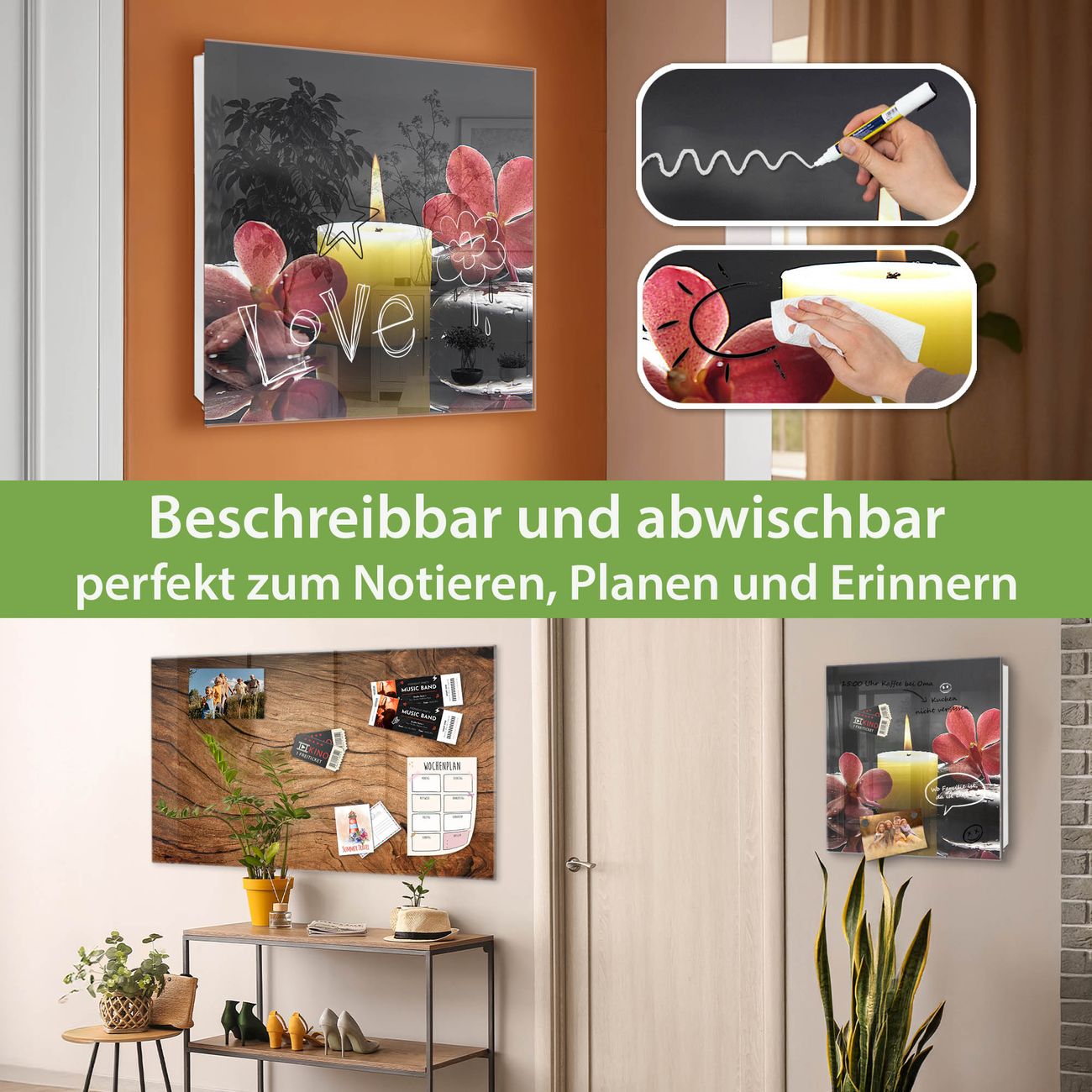 ✅ Magnetisch und mit Kreidestift beschreibbar, gehärtetes Glas, links angeschlagene TürOrdnung und Design in einem