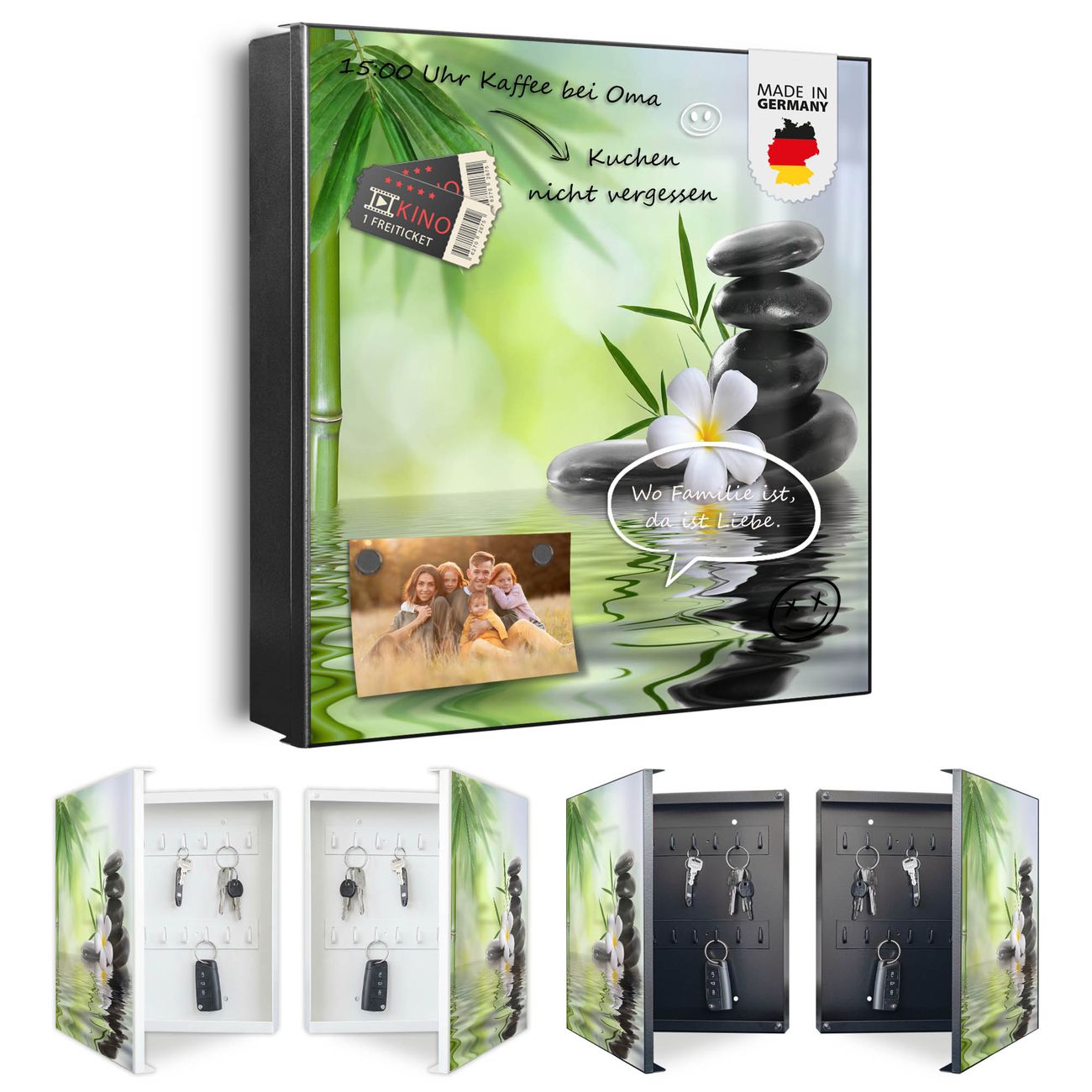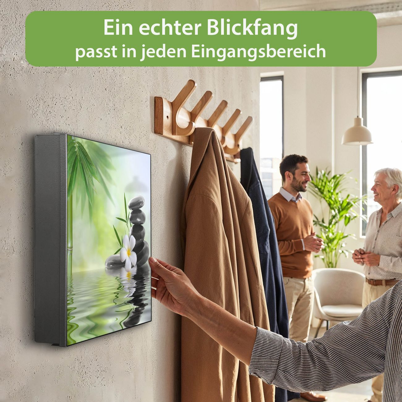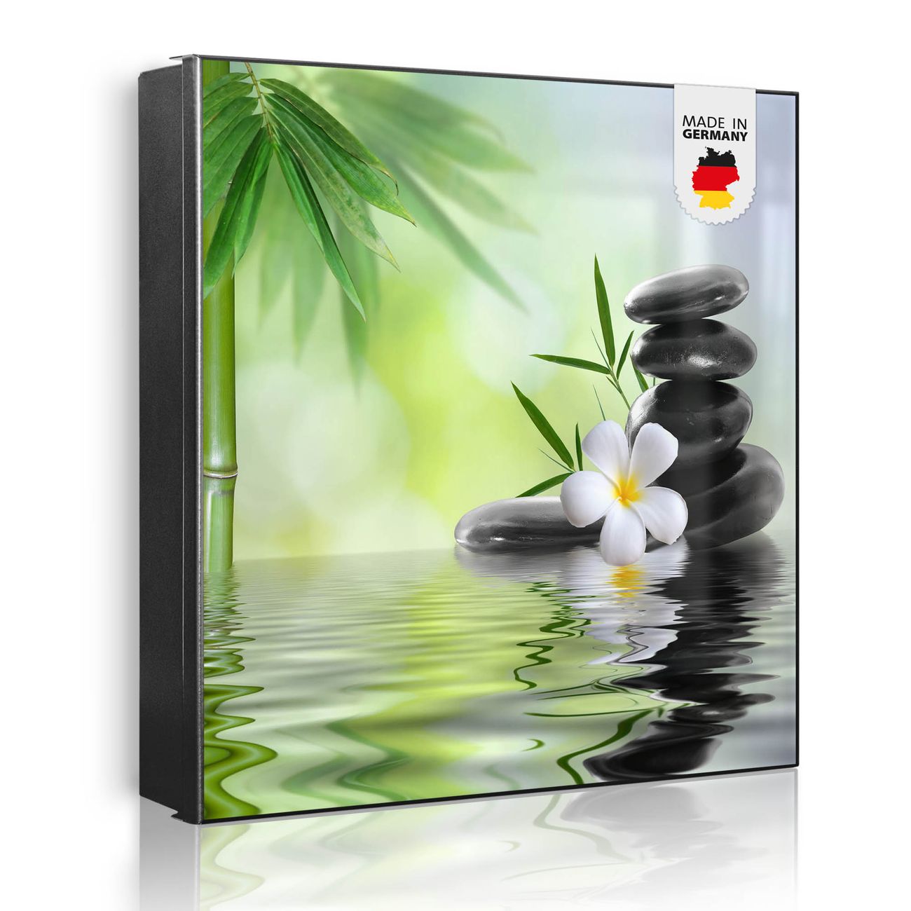 Bringe Ordnung und Eleganz in deinen Eingangsbereich mit dem banjado Schlüsselkasten Motiv Motiv Steine & Relax 6. Die moderne Schlüsselbox kombiniert funktionales Design mit hochwertiger Verarbeitung und wird so zu einem echten Hingucker in Flur, Büro oder Ferienwohnung. ✅ Stilvolle Schlüsselaufbewahrung mit Motiv Motiv Steine & Relax 6 Der Design-Schlüsselkasten Motiv Motiv Steine & Relax 6 bietet Platz für bis zu 32 Schlüssel, die auf 4 stabilen Reihen mit je 8 Haken übersichtlich verstaut werden. Mit seinen kompakten Maßen von 30 x 30 x 5 cm passt die Schlüsselbox perfekt auch in kleinere Räume. Der schwarz lackierte Stahlkorpus mit links angeschlagenem Türscharnier harmoniert mit gedruckten Folie auf der Front und fügt sich nahtlos in jedes Wohnambiente ein. Ob als Schlüsselorganizer für Zuhause oder als praktische Lösung für Büros, Praxen und Gewerbe, der banjado Schlüsselkasten sorgt für Ordnung und Übersicht. Dank der magnetischen, mit Kreidestiften beschreibbaren Folie auf der Front kannst du Notizen anheften oder Termine direkt auf der Oberfläche festhalten. Die Schlüsselbox Motiv Motiv Steine & Relax 6 zur Wandmontage wird inklusive Befestigungsmaterial geliefert und ist schnell angebracht. So hast du deine Schlüssel jederzeit griffbereit und zugleich stilvoll verstaut. Mit diesem banjado Schlüsselkasten Motiv Motiv Steine & Relax 6 kombinierst du praktische Aufbewahrung mit stilvollem Wohndesign. Ob privat oder geschäftlich, die Schlüsselbox sorgt für mehr Ordnung, Übersicht und ein wohnliches Ambiente.Vorteile im Überblick