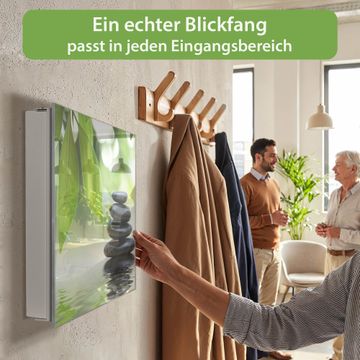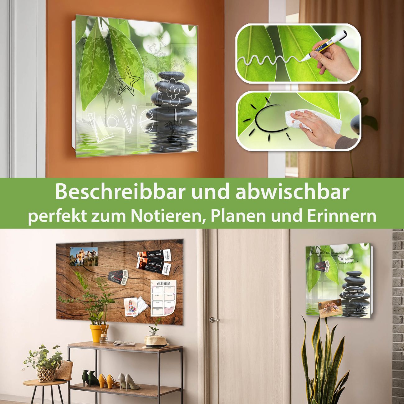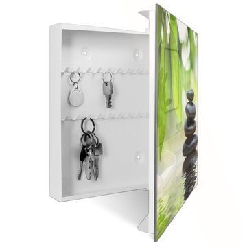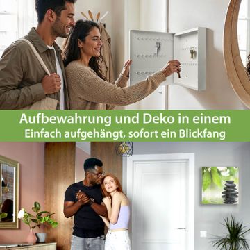 Bringe Ordnung und Eleganz in deinen Eingangsbereich mit dem banjado Schlüsselkasten Motiv Motiv Steine&Relax. Die moderne Schlüsselbox kombiniert funktionales Design mit hochwertiger Verarbeitung und wird so zu einem echten Hingucker in Flur, Büro oder Ferienwohnung. ✅ Stilvolle Schlüsselaufbewahrung mit Glasfront im Motiv Motiv Steine&Relax Der Design-Schlüsselkasten Motiv Motiv Steine&Relax bietet Platz für bis zu 50 Schlüssel, die auf 5 stabilen Reihen mit je 10 Haken übersichtlich verstaut werden. Mit seinen kompakten Maßen von 30 x 30 x 5 cm passt die Schlüsselbox perfekt auch in kleinere Räume. Der weiß lackierte Stahlkorpus mit rechts angeschlagenem Türscharnier harmoniert mit der Glasfront und fügt sich nahtlos in jedes Wohnambiente ein. Ob als Schlüsselorganizer für Zuhause oder als praktische Lösung für Büros, Praxen und Gewerbe, der banjado Schlüsselkasten sorgt für Ordnung und Übersicht. Dank der magnetischen, mit Kreidestiften beschreibbaren Glasfront kannst du Notizen anheften oder Termine direkt auf der Oberfläche festhalten. Die Schlüsselbox Motiv Motiv Steine&Relax zur Wandmontage wird inklusive Befestigungsmaterial geliefert und ist schnell angebracht. So hast du deine Schlüssel jederzeit griffbereit und zugleich stilvoll verstaut. Mit diesem banjado Schlüsselkasten Motiv Motiv Steine&Relax kombinierst du praktische Aufbewahrung mit stilvollem Wohndesign. Ob privat oder geschäftlich, die Schlüsselbox sorgt für mehr Ordnung, Übersicht und ein wohnliches Ambiente.Vorteile im Überblick