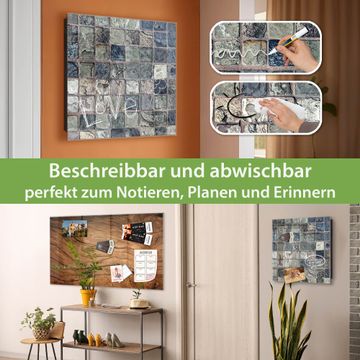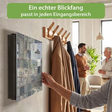 Bringe Ordnung und Eleganz in deinen Eingangsbereich mit dem banjado Schlüsselkasten Motiv Motiv Steinfliesen. Die moderne Schlüsselbox kombiniert funktionales Design mit hochwertiger Verarbeitung und wird so zu einem echten Hingucker in Flur, Büro oder Ferienwohnung. ✅ Stilvolle Schlüsselaufbewahrung mit Glasfront im Motiv Motiv Steinfliesen Der Design-Schlüsselkasten Motiv Motiv Steinfliesen bietet Platz für bis zu 50 Schlüssel, die auf 5 stabilen Reihen mit je 10 Haken übersichtlich verstaut werden. Mit seinen kompakten Maßen von 30 x 30 x 5 cm passt die Schlüsselbox perfekt auch in kleinere Räume. Der schwarz lackierte Stahlkorpus mit rechts angeschlagenem Türscharnier harmoniert mit der Glasfront und fügt sich nahtlos in jedes Wohnambiente ein. Ob als Schlüsselorganizer für Zuhause oder als praktische Lösung für Büros, Praxen und Gewerbe, der banjado Schlüsselkasten sorgt für Ordnung und Übersicht. Dank der magnetischen, mit Kreidestiften beschreibbaren Glasfront kannst du Notizen anheften oder Termine direkt auf der Oberfläche festhalten. Die Schlüsselbox Motiv Motiv Steinfliesen zur Wandmontage wird inklusive Befestigungsmaterial geliefert und ist schnell angebracht. So hast du deine Schlüssel jederzeit griffbereit und zugleich stilvoll verstaut. Mit diesem banjado Schlüsselkasten Motiv Motiv Steinfliesen kombinierst du praktische Aufbewahrung mit stilvollem Wohndesign. Ob privat oder geschäftlich, die Schlüsselbox sorgt für mehr Ordnung, Übersicht und ein wohnliches Ambiente.Vorteile im Überblick