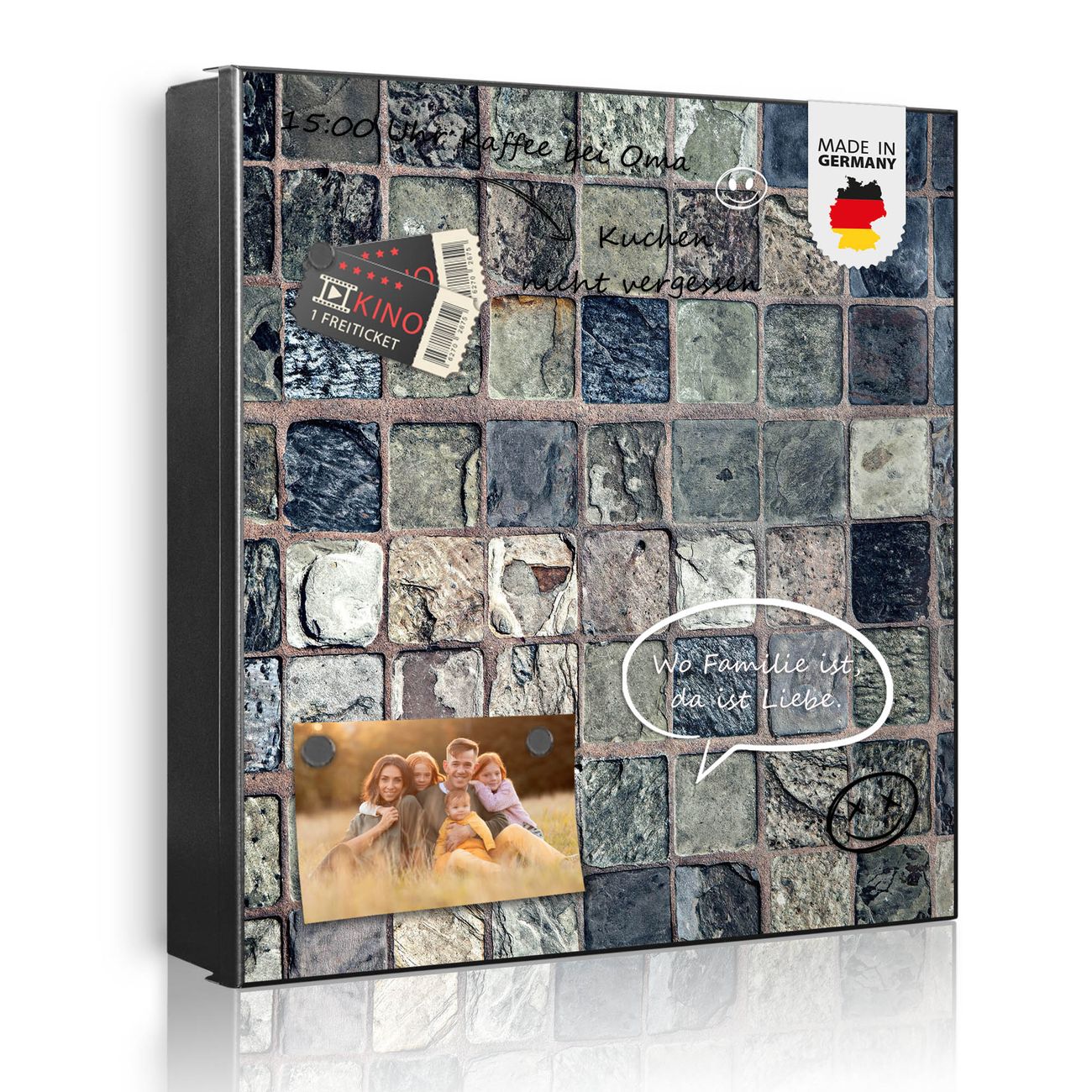 Bringe Ordnung und Eleganz in deinen Eingangsbereich mit dem banjado Schlüsselkasten Motiv Motiv Steinfliesen. Die moderne Schlüsselbox kombiniert funktionales Design mit hochwertiger Verarbeitung und wird so zu einem echten Hingucker in Flur, Büro oder Ferienwohnung. ✅ Stilvolle Schlüsselaufbewahrung mit Motiv Motiv Steinfliesen Der Design-Schlüsselkasten Motiv Motiv Steinfliesen bietet Platz für bis zu 32 Schlüssel, die auf 4 stabilen Reihen mit je 8 Haken übersichtlich verstaut werden. Mit seinen kompakten Maßen von 30 x 30 x 5 cm passt die Schlüsselbox perfekt auch in kleinere Räume. Der schwarz lackierte Stahlkorpus mit links angeschlagenem Türscharnier harmoniert mit gedruckten Folie auf der Front und fügt sich nahtlos in jedes Wohnambiente ein. Ob als Schlüsselorganizer für Zuhause oder als praktische Lösung für Büros, Praxen und Gewerbe, der banjado Schlüsselkasten sorgt für Ordnung und Übersicht. Dank der magnetischen, mit Kreidestiften beschreibbaren Folie auf der Front kannst du Notizen anheften oder Termine direkt auf der Oberfläche festhalten. Die Schlüsselbox Motiv Motiv Steinfliesen zur Wandmontage wird inklusive Befestigungsmaterial geliefert und ist schnell angebracht. So hast du deine Schlüssel jederzeit griffbereit und zugleich stilvoll verstaut. Mit diesem banjado Schlüsselkasten Motiv Motiv Steinfliesen kombinierst du praktische Aufbewahrung mit stilvollem Wohndesign. Ob privat oder geschäftlich, die Schlüsselbox sorgt für mehr Ordnung, Übersicht und ein wohnliches Ambiente.Vorteile im Überblick