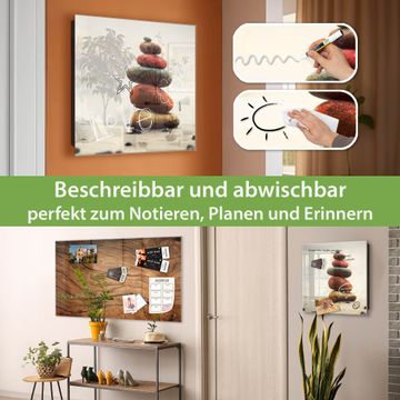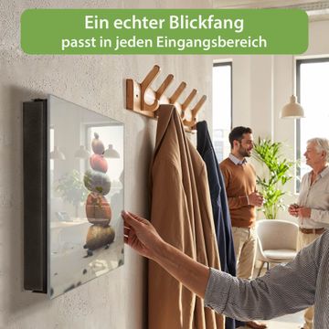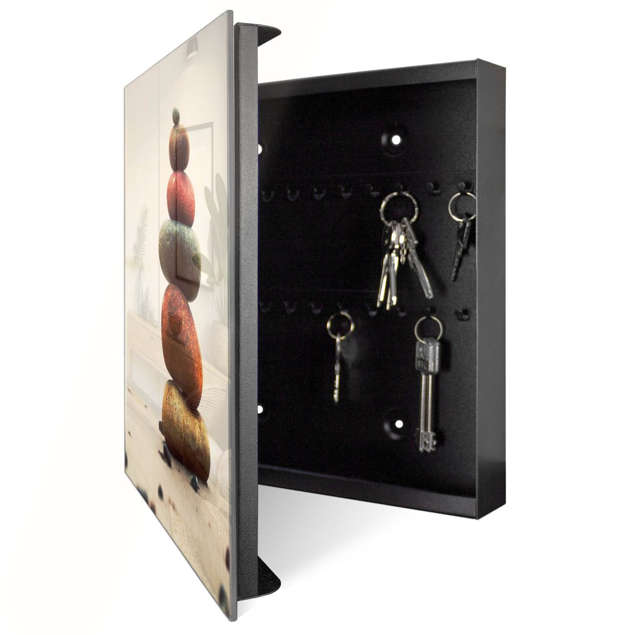 Bringe Ordnung und Eleganz in deinen Eingangsbereich mit dem banjado Schlüsselkasten Motiv Motiv Steinmännchen. Die moderne Schlüsselbox kombiniert funktionales Design mit hochwertiger Verarbeitung und wird so zu einem echten Hingucker in Flur, Büro oder Ferienwohnung. ✅ Stilvolle Schlüsselaufbewahrung mit Glasfront im Motiv Motiv Steinmännchen Der Design-Schlüsselkasten Motiv Motiv Steinmännchen bietet Platz für bis zu 50 Schlüssel, die auf 5 stabilen Reihen mit je 10 Haken übersichtlich verstaut werden. Mit seinen kompakten Maßen von 30 x 30 x 5 cm passt die Schlüsselbox perfekt auch in kleinere Räume. Der schwarz lackierte Stahlkorpus mit rechts angeschlagenem Türscharnier harmoniert mit der Glasfront und fügt sich nahtlos in jedes Wohnambiente ein. Ob als Schlüsselorganizer für Zuhause oder als praktische Lösung für Büros, Praxen und Gewerbe, der banjado Schlüsselkasten sorgt für Ordnung und Übersicht. Dank der magnetischen, mit Kreidestiften beschreibbaren Glasfront kannst du Notizen anheften oder Termine direkt auf der Oberfläche festhalten. Die Schlüsselbox Motiv Motiv Steinmännchen zur Wandmontage wird inklusive Befestigungsmaterial geliefert und ist schnell angebracht. So hast du deine Schlüssel jederzeit griffbereit und zugleich stilvoll verstaut. Mit diesem banjado Schlüsselkasten Motiv Motiv Steinmännchen kombinierst du praktische Aufbewahrung mit stilvollem Wohndesign. Ob privat oder geschäftlich, die Schlüsselbox sorgt für mehr Ordnung, Übersicht und ein wohnliches Ambiente.Vorteile im Überblick