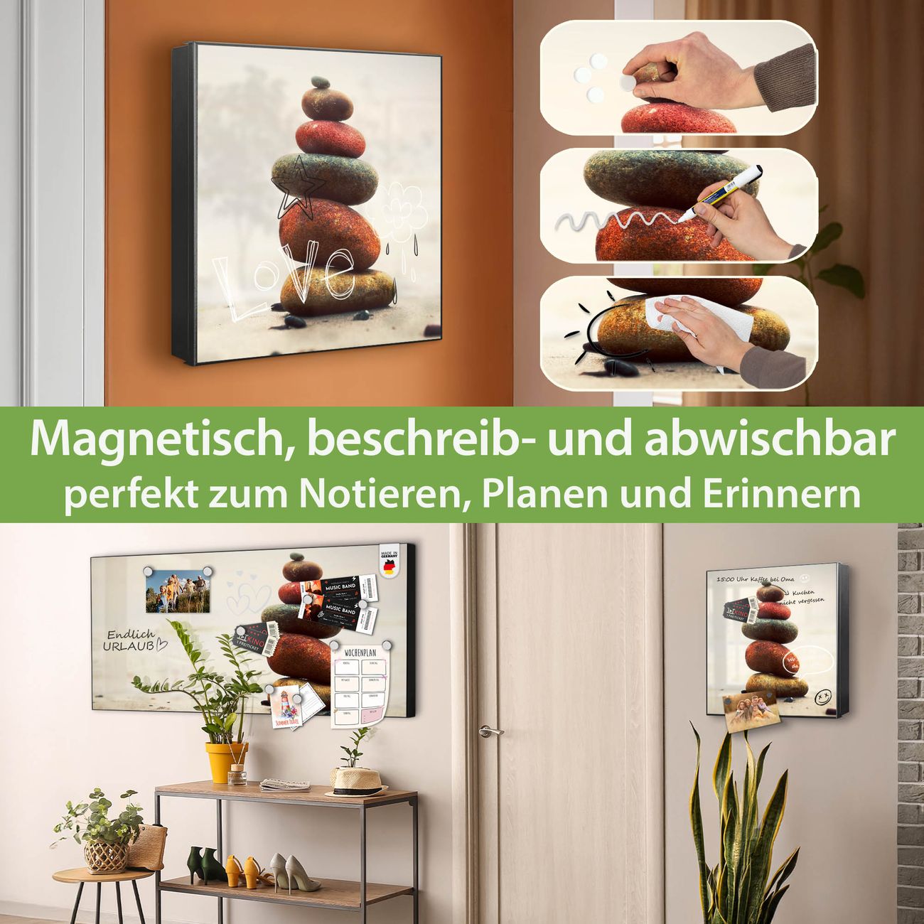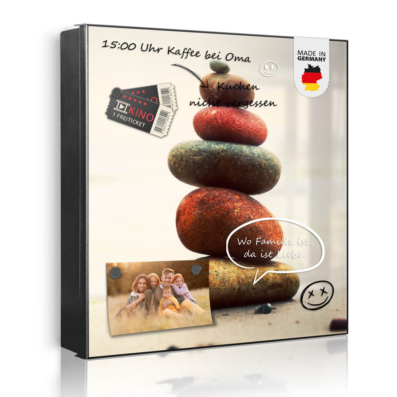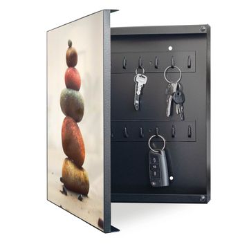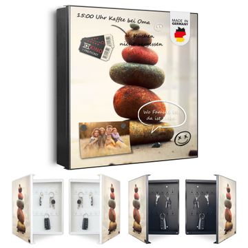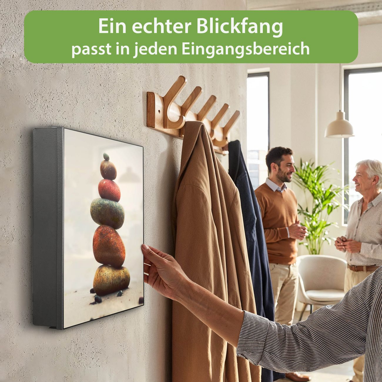 Bringe Ordnung und Eleganz in deinen Eingangsbereich mit dem banjado Schlüsselkasten Motiv Motiv Steinmännchen. Die moderne Schlüsselbox kombiniert funktionales Design mit hochwertiger Verarbeitung und wird so zu einem echten Hingucker in Flur, Büro oder Ferienwohnung. ✅ Stilvolle Schlüsselaufbewahrung mit Motiv Motiv Steinmännchen Der Design-Schlüsselkasten Motiv Motiv Steinmännchen bietet Platz für bis zu 32 Schlüssel, die auf 4 stabilen Reihen mit je 8 Haken übersichtlich verstaut werden. Mit seinen kompakten Maßen von 30 x 30 x 5 cm passt die Schlüsselbox perfekt auch in kleinere Räume. Der schwarz lackierte Stahlkorpus mit links angeschlagenem Türscharnier harmoniert mit gedruckten Folie auf der Front und fügt sich nahtlos in jedes Wohnambiente ein. Ob als Schlüsselorganizer für Zuhause oder als praktische Lösung für Büros, Praxen und Gewerbe, der banjado Schlüsselkasten sorgt für Ordnung und Übersicht. Dank der magnetischen, mit Kreidestiften beschreibbaren Folie auf der Front kannst du Notizen anheften oder Termine direkt auf der Oberfläche festhalten. Die Schlüsselbox Motiv Motiv Steinmännchen zur Wandmontage wird inklusive Befestigungsmaterial geliefert und ist schnell angebracht. So hast du deine Schlüssel jederzeit griffbereit und zugleich stilvoll verstaut. Mit diesem banjado Schlüsselkasten Motiv Motiv Steinmännchen kombinierst du praktische Aufbewahrung mit stilvollem Wohndesign. Ob privat oder geschäftlich, die Schlüsselbox sorgt für mehr Ordnung, Übersicht und ein wohnliches Ambiente.Vorteile im Überblick