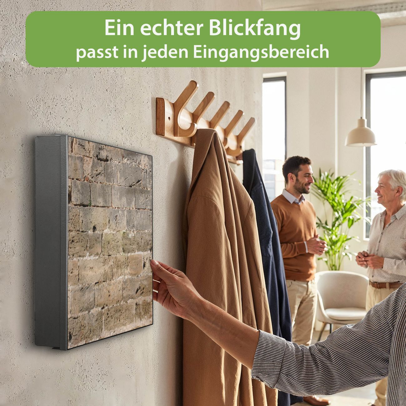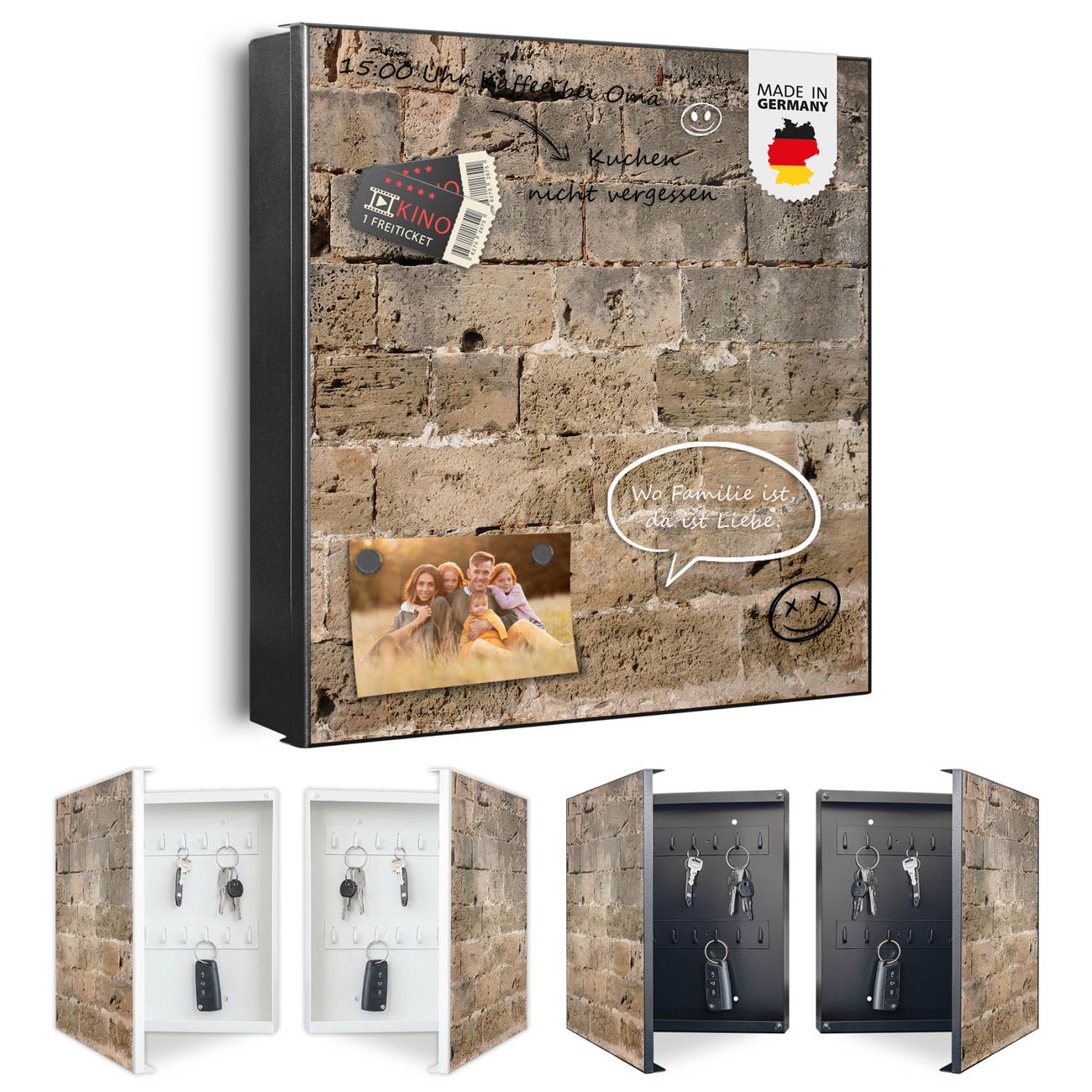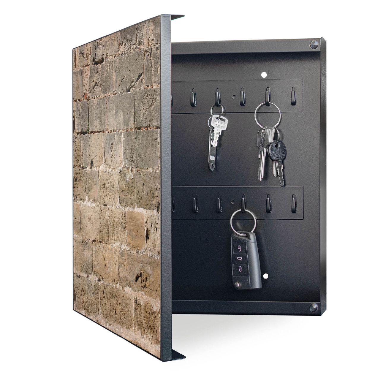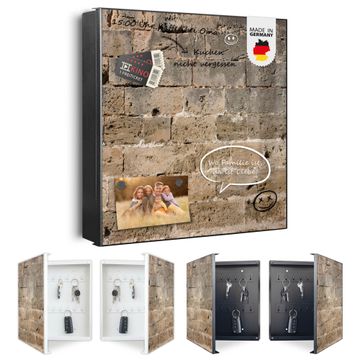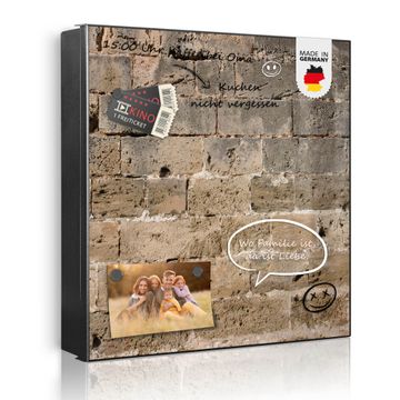 Bringe Ordnung und Eleganz in deinen Eingangsbereich mit dem banjado Schlüsselkasten Motiv Motiv Steinwand Antik. Die moderne Schlüsselbox kombiniert funktionales Design mit hochwertiger Verarbeitung und wird so zu einem echten Hingucker in Flur, Büro oder Ferienwohnung. ✅ Stilvolle Schlüsselaufbewahrung mit Motiv Motiv Steinwand Antik Der Design-Schlüsselkasten Motiv Motiv Steinwand Antik bietet Platz für bis zu 32 Schlüssel, die auf 4 stabilen Reihen mit je 8 Haken übersichtlich verstaut werden. Mit seinen kompakten Maßen von 30 x 30 x 5 cm passt die Schlüsselbox perfekt auch in kleinere Räume. Der schwarz lackierte Stahlkorpus mit links angeschlagenem Türscharnier harmoniert mit gedruckten Folie auf der Front und fügt sich nahtlos in jedes Wohnambiente ein. Ob als Schlüsselorganizer für Zuhause oder als praktische Lösung für Büros, Praxen und Gewerbe, der banjado Schlüsselkasten sorgt für Ordnung und Übersicht. Dank der magnetischen, mit Kreidestiften beschreibbaren Folie auf der Front kannst du Notizen anheften oder Termine direkt auf der Oberfläche festhalten. Die Schlüsselbox Motiv Motiv Steinwand Antik zur Wandmontage wird inklusive Befestigungsmaterial geliefert und ist schnell angebracht. So hast du deine Schlüssel jederzeit griffbereit und zugleich stilvoll verstaut. Mit diesem banjado Schlüsselkasten Motiv Motiv Steinwand Antik kombinierst du praktische Aufbewahrung mit stilvollem Wohndesign. Ob privat oder geschäftlich, die Schlüsselbox sorgt für mehr Ordnung, Übersicht und ein wohnliches Ambiente.Vorteile im Überblick