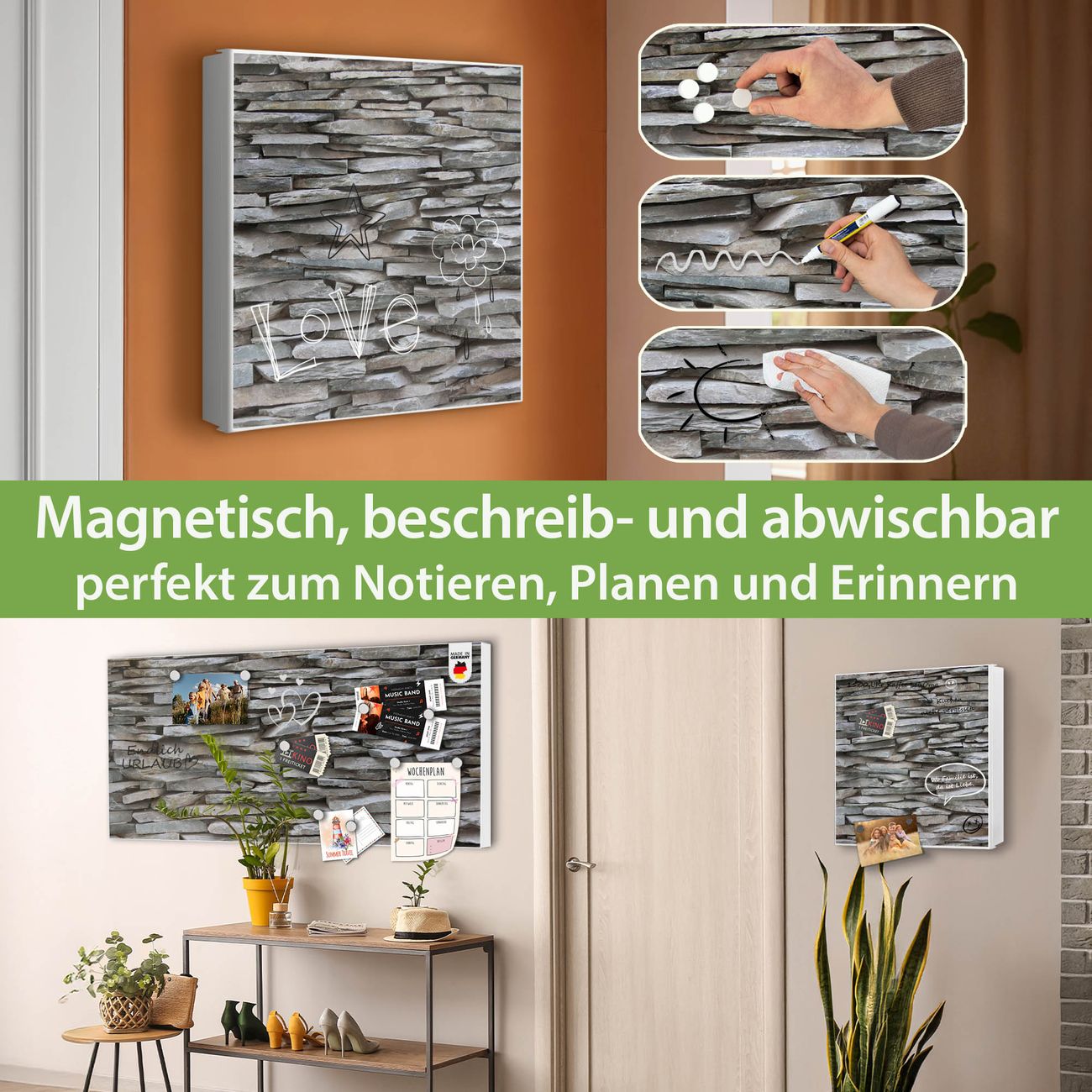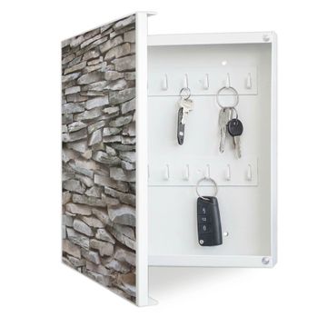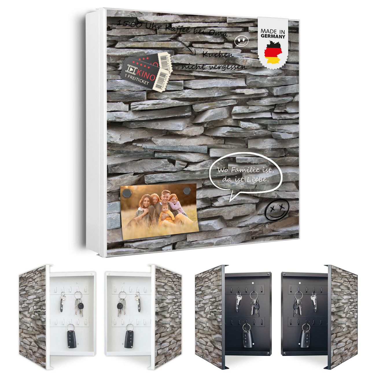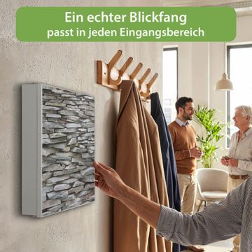 Bringe Ordnung und Eleganz in deinen Eingangsbereich mit dem banjado Schlüsselkasten Motiv Motiv Steinwand. Die moderne Schlüsselbox kombiniert funktionales Design mit hochwertiger Verarbeitung und wird so zu einem echten Hingucker in Flur, Büro oder Ferienwohnung. ✅ Stilvolle Schlüsselaufbewahrung mit Motiv Motiv Steinwand Der Design-Schlüsselkasten Motiv Motiv Steinwand bietet Platz für bis zu 32 Schlüssel, die auf 4 stabilen Reihen mit je 8 Haken übersichtlich verstaut werden. Mit seinen kompakten Maßen von 30 x 30 x 5 cm passt die Schlüsselbox perfekt auch in kleinere Räume. Der weiß lackierte Stahlkorpus mit links angeschlagenem Türscharnier harmoniert mit gedruckten Folie auf der Front und fügt sich nahtlos in jedes Wohnambiente ein. Ob als Schlüsselorganizer für Zuhause oder als praktische Lösung für Büros, Praxen und Gewerbe, der banjado Schlüsselkasten sorgt für Ordnung und Übersicht. Dank der magnetischen, mit Kreidestiften beschreibbaren Folie auf der Front kannst du Notizen anheften oder Termine direkt auf der Oberfläche festhalten. Die Schlüsselbox Motiv Motiv Steinwand zur Wandmontage wird inklusive Befestigungsmaterial geliefert und ist schnell angebracht. So hast du deine Schlüssel jederzeit griffbereit und zugleich stilvoll verstaut. Mit diesem banjado Schlüsselkasten Motiv Motiv Steinwand kombinierst du praktische Aufbewahrung mit stilvollem Wohndesign. Ob privat oder geschäftlich, die Schlüsselbox sorgt für mehr Ordnung, Übersicht und ein wohnliches Ambiente.Vorteile im Überblick