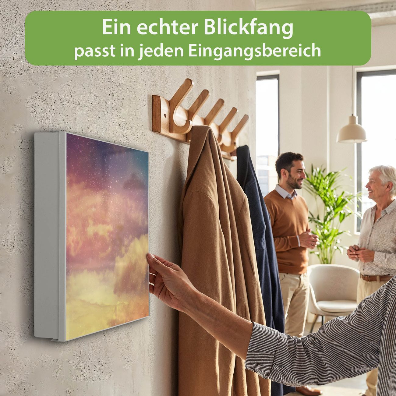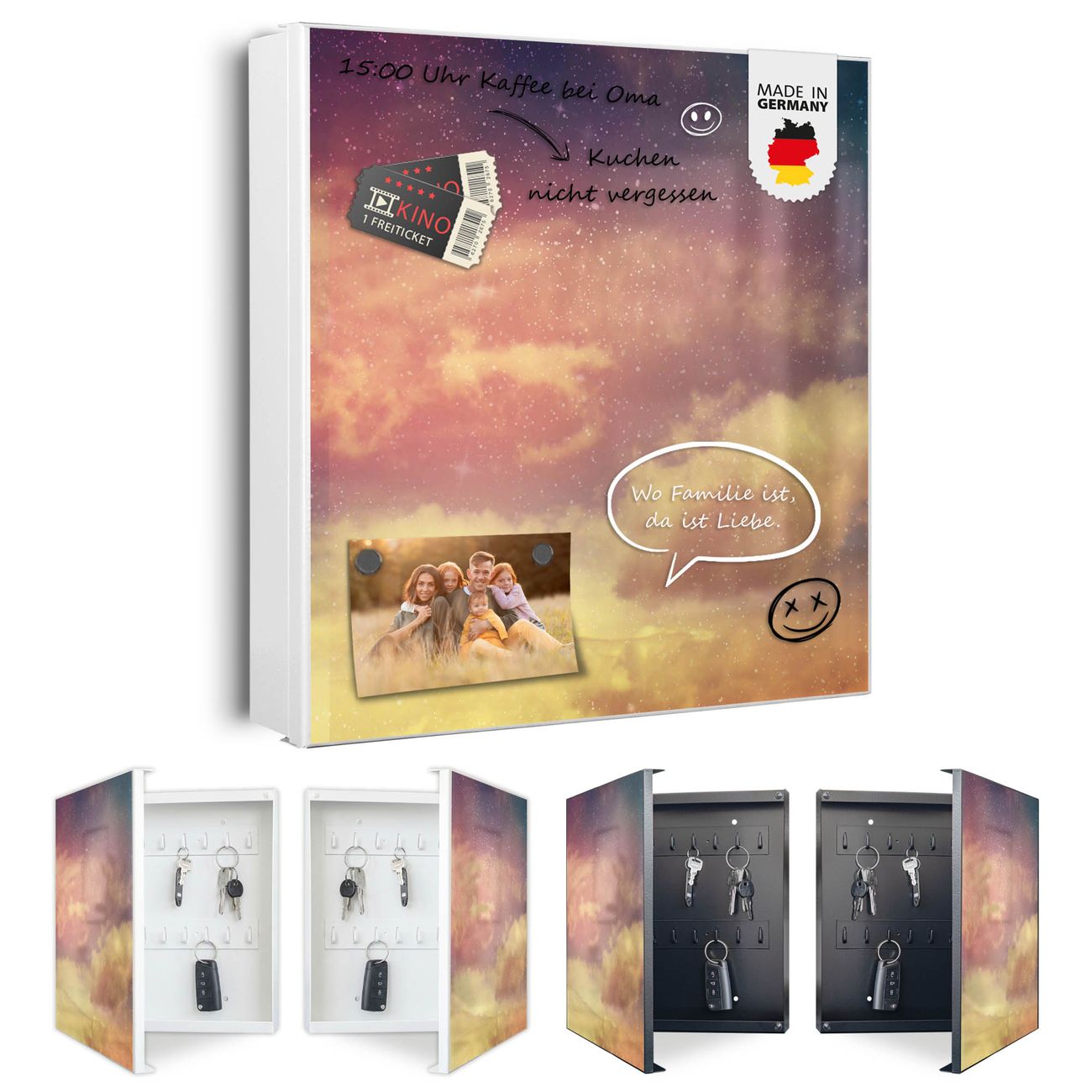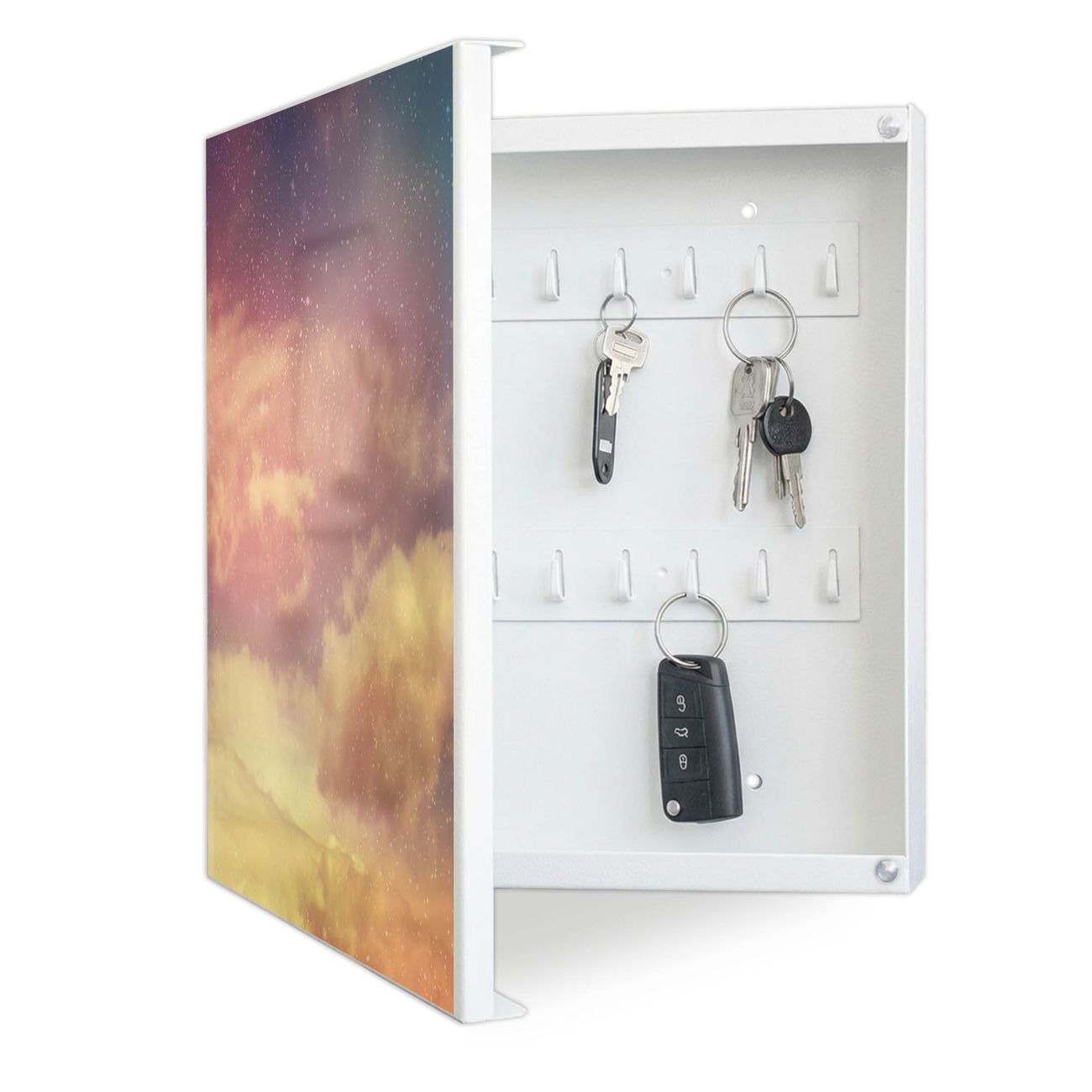 Bringe Ordnung und Eleganz in deinen Eingangsbereich mit dem banjado Schlüsselkasten Motiv Motiv Sternenhimmel. Die moderne Schlüsselbox kombiniert funktionales Design mit hochwertiger Verarbeitung und wird so zu einem echten Hingucker in Flur, Büro oder Ferienwohnung. ✅ Stilvolle Schlüsselaufbewahrung mit Motiv Motiv Sternenhimmel Der Design-Schlüsselkasten Motiv Motiv Sternenhimmel bietet Platz für bis zu 32 Schlüssel, die auf 4 stabilen Reihen mit je 8 Haken übersichtlich verstaut werden. Mit seinen kompakten Maßen von 30 x 30 x 5 cm passt die Schlüsselbox perfekt auch in kleinere Räume. Der weiß lackierte Stahlkorpus mit links angeschlagenem Türscharnier harmoniert mit gedruckten Folie auf der Front und fügt sich nahtlos in jedes Wohnambiente ein. Ob als Schlüsselorganizer für Zuhause oder als praktische Lösung für Büros, Praxen und Gewerbe, der banjado Schlüsselkasten sorgt für Ordnung und Übersicht. Dank der magnetischen, mit Kreidestiften beschreibbaren Folie auf der Front kannst du Notizen anheften oder Termine direkt auf der Oberfläche festhalten. Die Schlüsselbox Motiv Motiv Sternenhimmel zur Wandmontage wird inklusive Befestigungsmaterial geliefert und ist schnell angebracht. So hast du deine Schlüssel jederzeit griffbereit und zugleich stilvoll verstaut. Mit diesem banjado Schlüsselkasten Motiv Motiv Sternenhimmel kombinierst du praktische Aufbewahrung mit stilvollem Wohndesign. Ob privat oder geschäftlich, die Schlüsselbox sorgt für mehr Ordnung, Übersicht und ein wohnliches Ambiente.Vorteile im Überblick