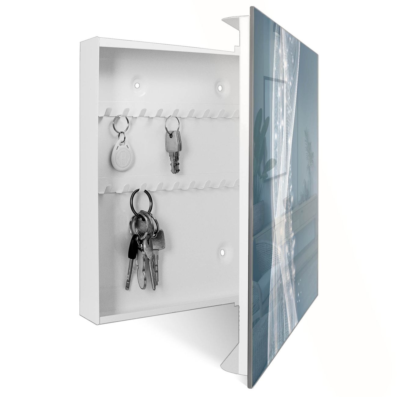 Bringe Ordnung und Eleganz in deinen Eingangsbereich mit dem banjado Schlüsselkasten Motiv Motiv Sternenstaub. Die moderne Schlüsselbox kombiniert funktionales Design mit hochwertiger Verarbeitung und wird so zu einem echten Hingucker in Flur, Büro oder Ferienwohnung. ✅ Stilvolle Schlüsselaufbewahrung mit Glasfront im Motiv Motiv Sternenstaub Der Design-Schlüsselkasten Motiv Motiv Sternenstaub bietet Platz für bis zu 50 Schlüssel, die auf 5 stabilen Reihen mit je 10 Haken übersichtlich verstaut werden. Mit seinen kompakten Maßen von 30 x 30 x 5 cm passt die Schlüsselbox perfekt auch in kleinere Räume. Der weiß lackierte Stahlkorpus mit rechts angeschlagenem Türscharnier harmoniert mit der Glasfront und fügt sich nahtlos in jedes Wohnambiente ein. Ob als Schlüsselorganizer für Zuhause oder als praktische Lösung für Büros, Praxen und Gewerbe, der banjado Schlüsselkasten sorgt für Ordnung und Übersicht. Dank der magnetischen, mit Kreidestiften beschreibbaren Glasfront kannst du Notizen anheften oder Termine direkt auf der Oberfläche festhalten. Die Schlüsselbox Motiv Motiv Sternenstaub zur Wandmontage wird inklusive Befestigungsmaterial geliefert und ist schnell angebracht. So hast du deine Schlüssel jederzeit griffbereit und zugleich stilvoll verstaut. Mit diesem banjado Schlüsselkasten Motiv Motiv Sternenstaub kombinierst du praktische Aufbewahrung mit stilvollem Wohndesign. Ob privat oder geschäftlich, die Schlüsselbox sorgt für mehr Ordnung, Übersicht und ein wohnliches Ambiente.Vorteile im Überblick