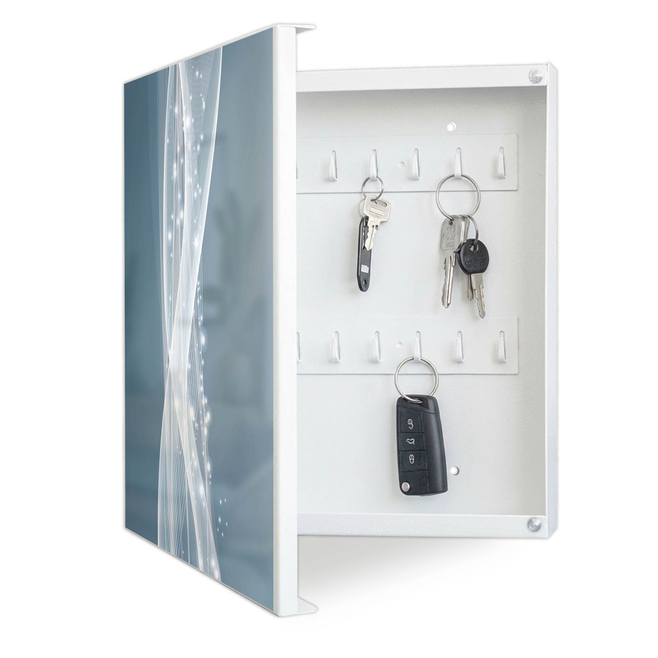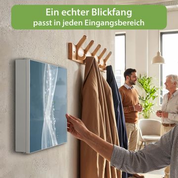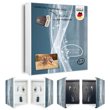 Bringe Ordnung und Eleganz in deinen Eingangsbereich mit dem banjado Schlüsselkasten Motiv Motiv Sternenstaub. Die moderne Schlüsselbox kombiniert funktionales Design mit hochwertiger Verarbeitung und wird so zu einem echten Hingucker in Flur, Büro oder Ferienwohnung. ✅ Stilvolle Schlüsselaufbewahrung mit Motiv Motiv Sternenstaub Der Design-Schlüsselkasten Motiv Motiv Sternenstaub bietet Platz für bis zu 32 Schlüssel, die auf 4 stabilen Reihen mit je 8 Haken übersichtlich verstaut werden. Mit seinen kompakten Maßen von 30 x 30 x 5 cm passt die Schlüsselbox perfekt auch in kleinere Räume. Der weiß lackierte Stahlkorpus mit links angeschlagenem Türscharnier harmoniert mit gedruckten Folie auf der Front und fügt sich nahtlos in jedes Wohnambiente ein. Ob als Schlüsselorganizer für Zuhause oder als praktische Lösung für Büros, Praxen und Gewerbe, der banjado Schlüsselkasten sorgt für Ordnung und Übersicht. Dank der magnetischen, mit Kreidestiften beschreibbaren Folie auf der Front kannst du Notizen anheften oder Termine direkt auf der Oberfläche festhalten. Die Schlüsselbox Motiv Motiv Sternenstaub zur Wandmontage wird inklusive Befestigungsmaterial geliefert und ist schnell angebracht. So hast du deine Schlüssel jederzeit griffbereit und zugleich stilvoll verstaut. Mit diesem banjado Schlüsselkasten Motiv Motiv Sternenstaub kombinierst du praktische Aufbewahrung mit stilvollem Wohndesign. Ob privat oder geschäftlich, die Schlüsselbox sorgt für mehr Ordnung, Übersicht und ein wohnliches Ambiente.Vorteile im Überblick