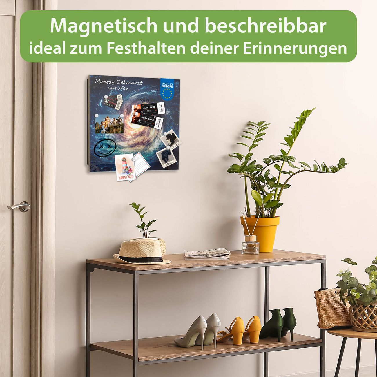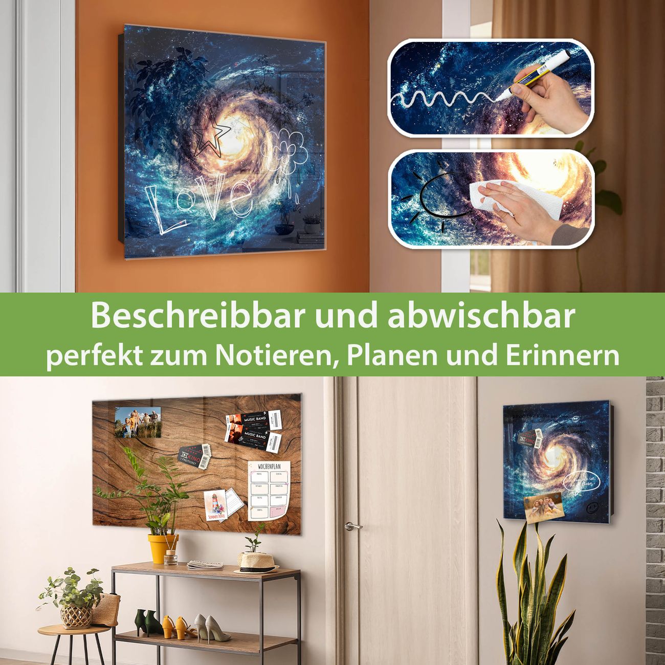 Bringe Ordnung und Eleganz in deinen Eingangsbereich mit dem banjado Schlüsselkasten Motiv Motiv Sternenwirbel. Die moderne Schlüsselbox kombiniert funktionales Design mit hochwertiger Verarbeitung und wird so zu einem echten Hingucker in Flur, Büro oder Ferienwohnung. ✅ Stilvolle Schlüsselaufbewahrung mit Glasfront im Motiv Motiv Sternenwirbel Der Design-Schlüsselkasten Motiv Motiv Sternenwirbel bietet Platz für bis zu 50 Schlüssel, die auf 5 stabilen Reihen mit je 10 Haken übersichtlich verstaut werden. Mit seinen kompakten Maßen von 30 x 30 x 5 cm passt die Schlüsselbox perfekt auch in kleinere Räume. Der schwarz lackierte Stahlkorpus mit rechts angeschlagenem Türscharnier harmoniert mit der Glasfront und fügt sich nahtlos in jedes Wohnambiente ein. Ob als Schlüsselorganizer für Zuhause oder als praktische Lösung für Büros, Praxen und Gewerbe, der banjado Schlüsselkasten sorgt für Ordnung und Übersicht. Dank der magnetischen, mit Kreidestiften beschreibbaren Glasfront kannst du Notizen anheften oder Termine direkt auf der Oberfläche festhalten. Die Schlüsselbox Motiv Motiv Sternenwirbel zur Wandmontage wird inklusive Befestigungsmaterial geliefert und ist schnell angebracht. So hast du deine Schlüssel jederzeit griffbereit und zugleich stilvoll verstaut. Mit diesem banjado Schlüsselkasten Motiv Motiv Sternenwirbel kombinierst du praktische Aufbewahrung mit stilvollem Wohndesign. Ob privat oder geschäftlich, die Schlüsselbox sorgt für mehr Ordnung, Übersicht und ein wohnliches Ambiente.Vorteile im Überblick