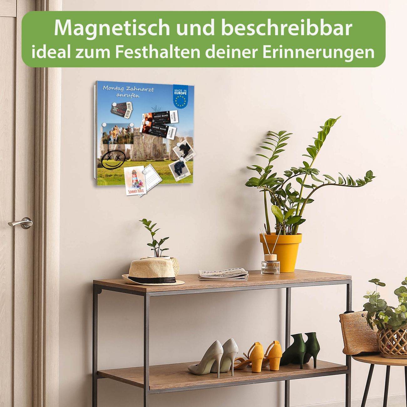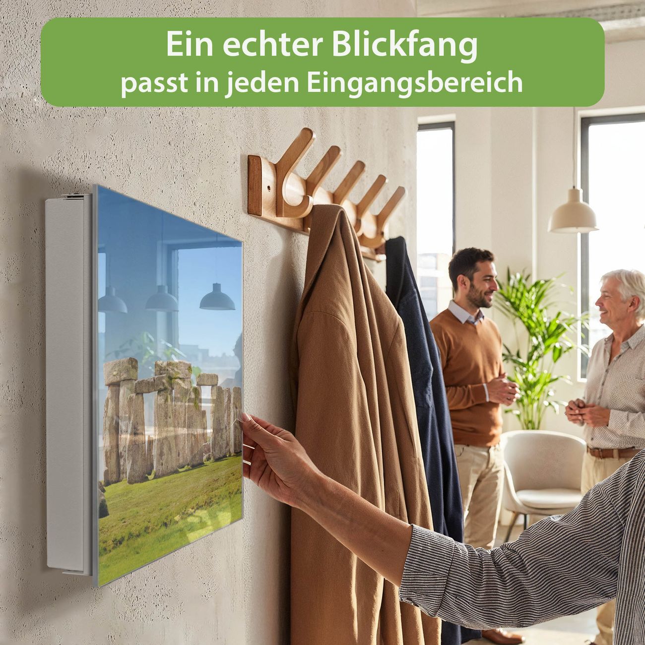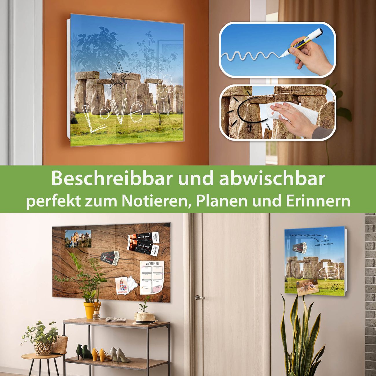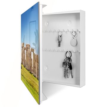 Bringe Ordnung und Eleganz in deinen Eingangsbereich mit dem banjado Schlüsselkasten Motiv Motiv Stonehenge. Die moderne Schlüsselbox kombiniert funktionales Design mit hochwertiger Verarbeitung und wird so zu einem echten Hingucker in Flur, Büro oder Ferienwohnung. ✅ Stilvolle Schlüsselaufbewahrung mit Glasfront im Motiv Motiv Stonehenge Der Design-Schlüsselkasten Motiv Motiv Stonehenge bietet Platz für bis zu 50 Schlüssel, die auf 5 stabilen Reihen mit je 10 Haken übersichtlich verstaut werden. Mit seinen kompakten Maßen von 30 x 30 x 5 cm passt die Schlüsselbox perfekt auch in kleinere Räume. Der weiß lackierte Stahlkorpus mit rechts angeschlagenem Türscharnier harmoniert mit der Glasfront und fügt sich nahtlos in jedes Wohnambiente ein. Ob als Schlüsselorganizer für Zuhause oder als praktische Lösung für Büros, Praxen und Gewerbe, der banjado Schlüsselkasten sorgt für Ordnung und Übersicht. Dank der magnetischen, mit Kreidestiften beschreibbaren Glasfront kannst du Notizen anheften oder Termine direkt auf der Oberfläche festhalten. Die Schlüsselbox Motiv Motiv Stonehenge zur Wandmontage wird inklusive Befestigungsmaterial geliefert und ist schnell angebracht. So hast du deine Schlüssel jederzeit griffbereit und zugleich stilvoll verstaut. Mit diesem banjado Schlüsselkasten Motiv Motiv Stonehenge kombinierst du praktische Aufbewahrung mit stilvollem Wohndesign. Ob privat oder geschäftlich, die Schlüsselbox sorgt für mehr Ordnung, Übersicht und ein wohnliches Ambiente.Vorteile im Überblick