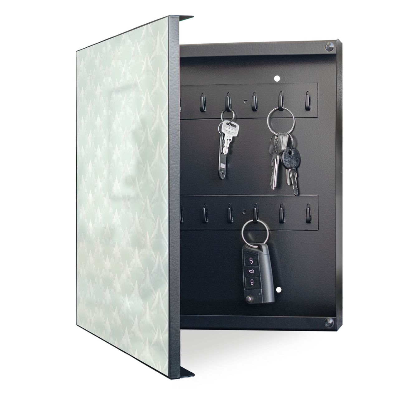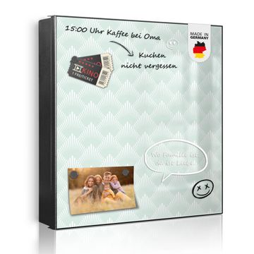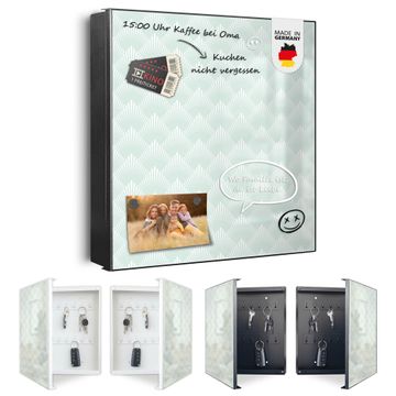 Bringe Ordnung und Eleganz in deinen Eingangsbereich mit dem banjado Schlüsselkasten Motiv Motiv Strahlen Mint. Die moderne Schlüsselbox kombiniert funktionales Design mit hochwertiger Verarbeitung und wird so zu einem echten Hingucker in Flur, Büro oder Ferienwohnung. ✅ Stilvolle Schlüsselaufbewahrung mit Motiv Motiv Strahlen Mint Der Design-Schlüsselkasten Motiv Motiv Strahlen Mint bietet Platz für bis zu 32 Schlüssel, die auf 4 stabilen Reihen mit je 8 Haken übersichtlich verstaut werden. Mit seinen kompakten Maßen von 30 x 30 x 5 cm passt die Schlüsselbox perfekt auch in kleinere Räume. Der schwarz lackierte Stahlkorpus mit links angeschlagenem Türscharnier harmoniert mit gedruckten Folie auf der Front und fügt sich nahtlos in jedes Wohnambiente ein. Ob als Schlüsselorganizer für Zuhause oder als praktische Lösung für Büros, Praxen und Gewerbe, der banjado Schlüsselkasten sorgt für Ordnung und Übersicht. Dank der magnetischen, mit Kreidestiften beschreibbaren Folie auf der Front kannst du Notizen anheften oder Termine direkt auf der Oberfläche festhalten. Die Schlüsselbox Motiv Motiv Strahlen Mint zur Wandmontage wird inklusive Befestigungsmaterial geliefert und ist schnell angebracht. So hast du deine Schlüssel jederzeit griffbereit und zugleich stilvoll verstaut. Mit diesem banjado Schlüsselkasten Motiv Motiv Strahlen Mint kombinierst du praktische Aufbewahrung mit stilvollem Wohndesign. Ob privat oder geschäftlich, die Schlüsselbox sorgt für mehr Ordnung, Übersicht und ein wohnliches Ambiente.Vorteile im Überblick