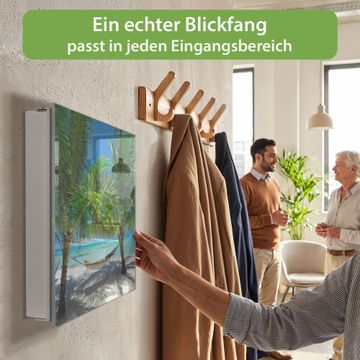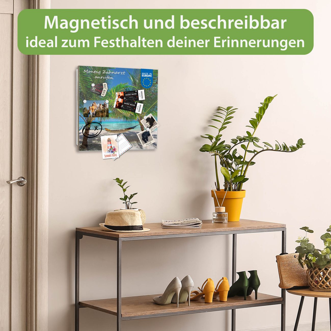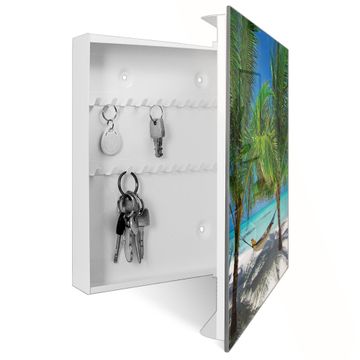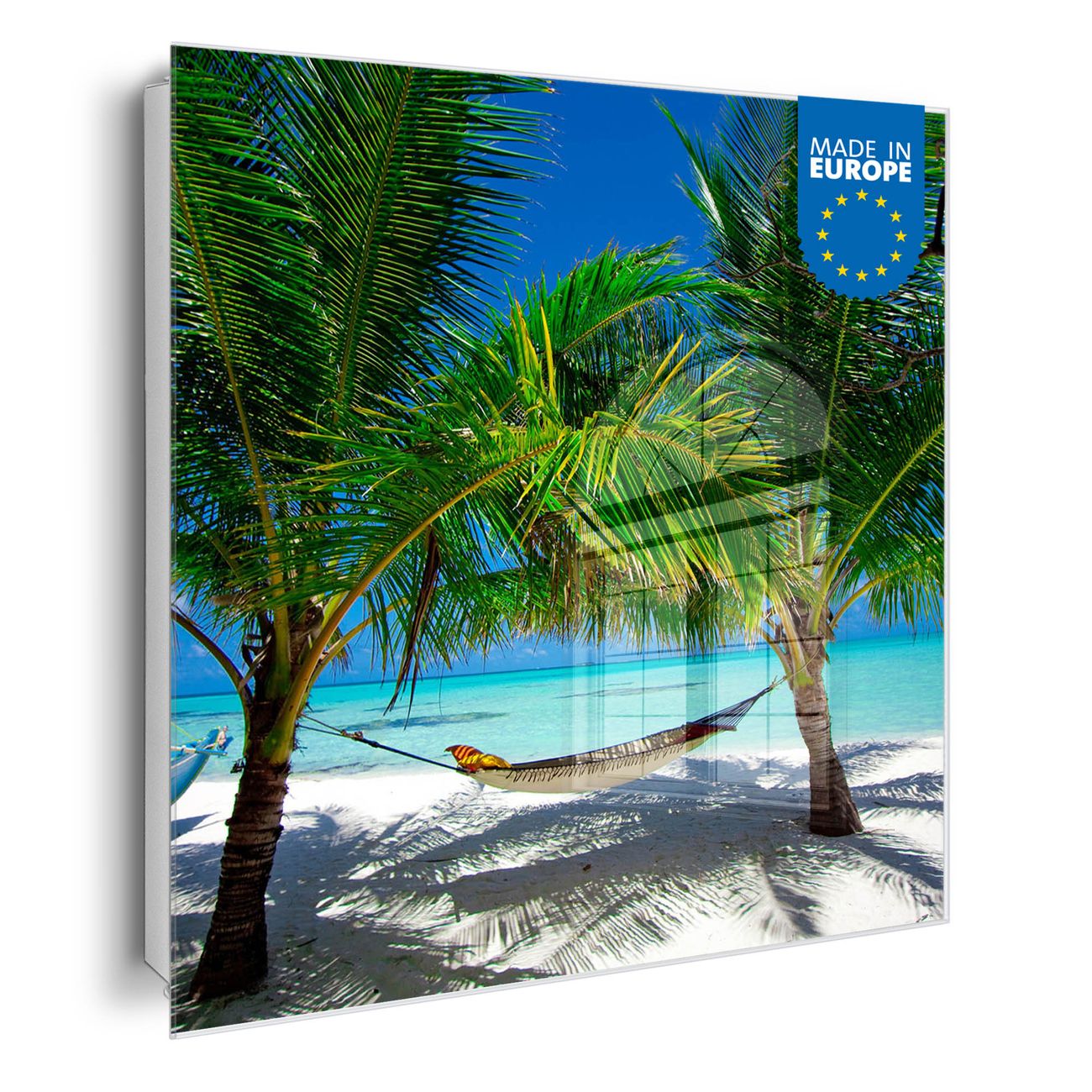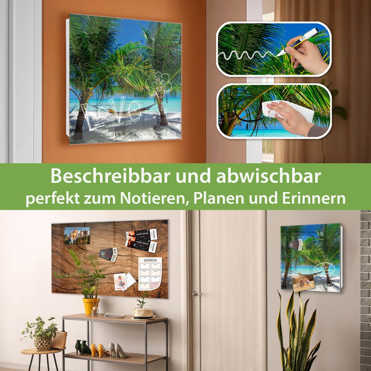 Bringe Ordnung und Eleganz in deinen Eingangsbereich mit dem banjado Schlüsselkasten Motiv Motiv Strand. Die moderne Schlüsselbox kombiniert funktionales Design mit hochwertiger Verarbeitung und wird so zu einem echten Hingucker in Flur, Büro oder Ferienwohnung. ✅ Stilvolle Schlüsselaufbewahrung mit Glasfront im Motiv Motiv Strand Der Design-Schlüsselkasten Motiv Motiv Strand bietet Platz für bis zu 50 Schlüssel, die auf 5 stabilen Reihen mit je 10 Haken übersichtlich verstaut werden. Mit seinen kompakten Maßen von 30 x 30 x 5 cm passt die Schlüsselbox perfekt auch in kleinere Räume. Der weiß lackierte Stahlkorpus mit rechts angeschlagenem Türscharnier harmoniert mit der Glasfront und fügt sich nahtlos in jedes Wohnambiente ein. Ob als Schlüsselorganizer für Zuhause oder als praktische Lösung für Büros, Praxen und Gewerbe, der banjado Schlüsselkasten sorgt für Ordnung und Übersicht. Dank der magnetischen, mit Kreidestiften beschreibbaren Glasfront kannst du Notizen anheften oder Termine direkt auf der Oberfläche festhalten. Die Schlüsselbox Motiv Motiv Strand zur Wandmontage wird inklusive Befestigungsmaterial geliefert und ist schnell angebracht. So hast du deine Schlüssel jederzeit griffbereit und zugleich stilvoll verstaut. Mit diesem banjado Schlüsselkasten Motiv Motiv Strand kombinierst du praktische Aufbewahrung mit stilvollem Wohndesign. Ob privat oder geschäftlich, die Schlüsselbox sorgt für mehr Ordnung, Übersicht und ein wohnliches Ambiente.Vorteile im Überblick