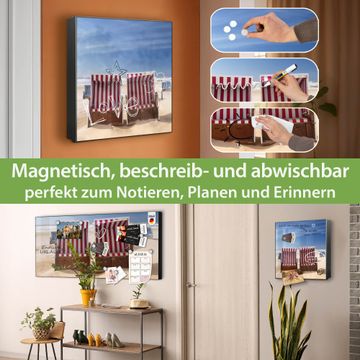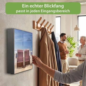 Bringe Ordnung und Eleganz in deinen Eingangsbereich mit dem banjado Schlüsselkasten Motiv Motiv Strandkörbe. Die moderne Schlüsselbox kombiniert funktionales Design mit hochwertiger Verarbeitung und wird so zu einem echten Hingucker in Flur, Büro oder Ferienwohnung. ✅ Stilvolle Schlüsselaufbewahrung mit Motiv Motiv Strandkörbe Der Design-Schlüsselkasten Motiv Motiv Strandkörbe bietet Platz für bis zu 32 Schlüssel, die auf 4 stabilen Reihen mit je 8 Haken übersichtlich verstaut werden. Mit seinen kompakten Maßen von 30 x 30 x 5 cm passt die Schlüsselbox perfekt auch in kleinere Räume. Der schwarz lackierte Stahlkorpus mit rechts angeschlagenem Türscharnier harmoniert mit gedruckten Folie auf der Front und fügt sich nahtlos in jedes Wohnambiente ein. Ob als Schlüsselorganizer für Zuhause oder als praktische Lösung für Büros, Praxen und Gewerbe, der banjado Schlüsselkasten sorgt für Ordnung und Übersicht. Dank der magnetischen, mit Kreidestiften beschreibbaren Folie auf der Front kannst du Notizen anheften oder Termine direkt auf der Oberfläche festhalten. Die Schlüsselbox Motiv Motiv Strandkörbe zur Wandmontage wird inklusive Befestigungsmaterial geliefert und ist schnell angebracht. So hast du deine Schlüssel jederzeit griffbereit und zugleich stilvoll verstaut. Mit diesem banjado Schlüsselkasten Motiv Motiv Strandkörbe kombinierst du praktische Aufbewahrung mit stilvollem Wohndesign. Ob privat oder geschäftlich, die Schlüsselbox sorgt für mehr Ordnung, Übersicht und ein wohnliches Ambiente.Vorteile im Überblick