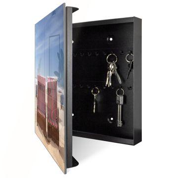 Bringe Ordnung und Eleganz in deinen Eingangsbereich mit dem banjado Schlüsselkasten Motiv Motiv Strandkörbe. Die moderne Schlüsselbox kombiniert funktionales Design mit hochwertiger Verarbeitung und wird so zu einem echten Hingucker in Flur, Büro oder Ferienwohnung. ✅ Stilvolle Schlüsselaufbewahrung mit Glasfront im Motiv Motiv Strandkörbe Der Design-Schlüsselkasten Motiv Motiv Strandkörbe bietet Platz für bis zu 50 Schlüssel, die auf 5 stabilen Reihen mit je 10 Haken übersichtlich verstaut werden. Mit seinen kompakten Maßen von 30 x 30 x 5 cm passt die Schlüsselbox perfekt auch in kleinere Räume. Der schwarz lackierte Stahlkorpus mit rechts angeschlagenem Türscharnier harmoniert mit der Glasfront und fügt sich nahtlos in jedes Wohnambiente ein. Ob als Schlüsselorganizer für Zuhause oder als praktische Lösung für Büros, Praxen und Gewerbe, der banjado Schlüsselkasten sorgt für Ordnung und Übersicht. Dank der magnetischen, mit Kreidestiften beschreibbaren Glasfront kannst du Notizen anheften oder Termine direkt auf der Oberfläche festhalten. Die Schlüsselbox Motiv Motiv Strandkörbe zur Wandmontage wird inklusive Befestigungsmaterial geliefert und ist schnell angebracht. So hast du deine Schlüssel jederzeit griffbereit und zugleich stilvoll verstaut. Mit diesem banjado Schlüsselkasten Motiv Motiv Strandkörbe kombinierst du praktische Aufbewahrung mit stilvollem Wohndesign. Ob privat oder geschäftlich, die Schlüsselbox sorgt für mehr Ordnung, Übersicht und ein wohnliches Ambiente.Vorteile im Überblick
