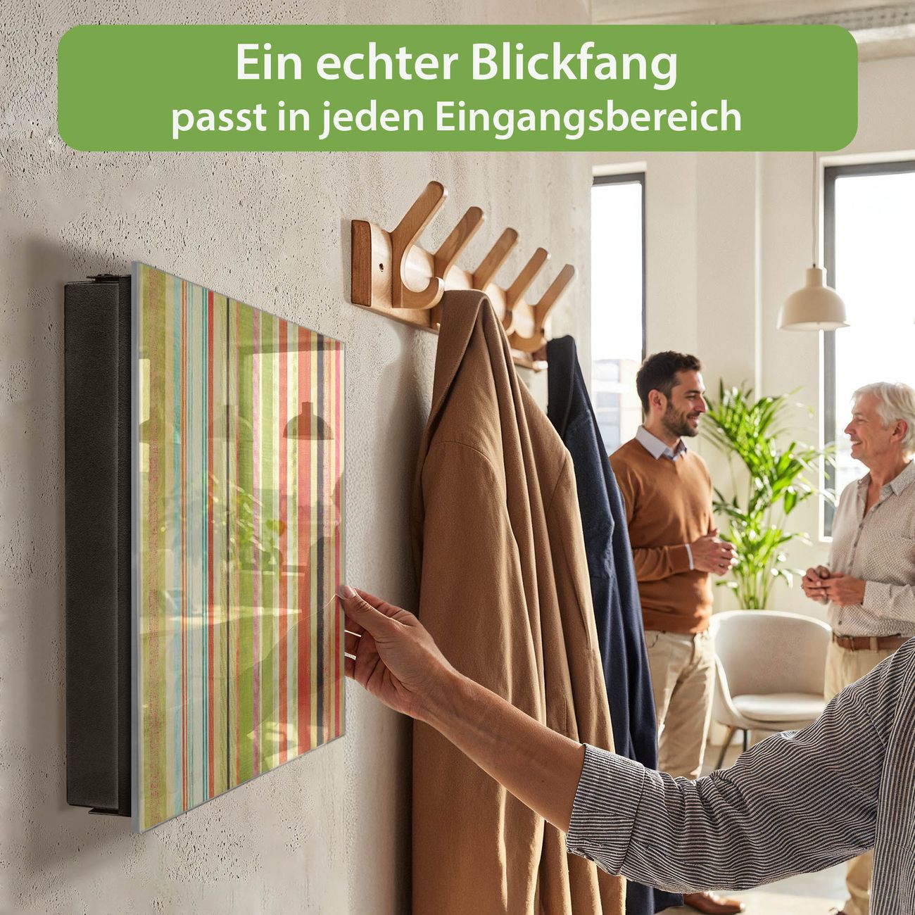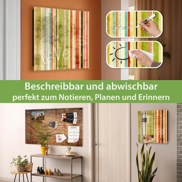 Bringe Ordnung und Eleganz in deinen Eingangsbereich mit dem banjado Schlüsselkasten Motiv Motiv Streifen. Die moderne Schlüsselbox kombiniert funktionales Design mit hochwertiger Verarbeitung und wird so zu einem echten Hingucker in Flur, Büro oder Ferienwohnung. ✅ Stilvolle Schlüsselaufbewahrung mit Glasfront im Motiv Motiv Streifen Der Design-Schlüsselkasten Motiv Motiv Streifen bietet Platz für bis zu 50 Schlüssel, die auf 5 stabilen Reihen mit je 10 Haken übersichtlich verstaut werden. Mit seinen kompakten Maßen von 30 x 30 x 5 cm passt die Schlüsselbox perfekt auch in kleinere Räume. Der schwarz lackierte Stahlkorpus mit rechts angeschlagenem Türscharnier harmoniert mit der Glasfront und fügt sich nahtlos in jedes Wohnambiente ein. Ob als Schlüsselorganizer für Zuhause oder als praktische Lösung für Büros, Praxen und Gewerbe, der banjado Schlüsselkasten sorgt für Ordnung und Übersicht. Dank der magnetischen, mit Kreidestiften beschreibbaren Glasfront kannst du Notizen anheften oder Termine direkt auf der Oberfläche festhalten. Die Schlüsselbox Motiv Motiv Streifen zur Wandmontage wird inklusive Befestigungsmaterial geliefert und ist schnell angebracht. So hast du deine Schlüssel jederzeit griffbereit und zugleich stilvoll verstaut. Mit diesem banjado Schlüsselkasten Motiv Motiv Streifen kombinierst du praktische Aufbewahrung mit stilvollem Wohndesign. Ob privat oder geschäftlich, die Schlüsselbox sorgt für mehr Ordnung, Übersicht und ein wohnliches Ambiente.Vorteile im Überblick