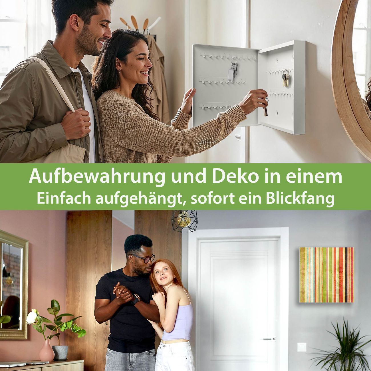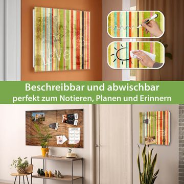 Bringe Ordnung und Eleganz in deinen Eingangsbereich mit dem banjado Schlüsselkasten Motiv Motiv Streifen. Die moderne Schlüsselbox kombiniert funktionales Design mit hochwertiger Verarbeitung und wird so zu einem echten Hingucker in Flur, Büro oder Ferienwohnung. ✅ Stilvolle Schlüsselaufbewahrung mit Glasfront im Motiv Motiv Streifen Der Design-Schlüsselkasten Motiv Motiv Streifen bietet Platz für bis zu 50 Schlüssel, die auf 5 stabilen Reihen mit je 10 Haken übersichtlich verstaut werden. Mit seinen kompakten Maßen von 30 x 30 x 5 cm passt die Schlüsselbox perfekt auch in kleinere Räume. Der weiß lackierte Stahlkorpus mit rechts angeschlagenem Türscharnier harmoniert mit der Glasfront und fügt sich nahtlos in jedes Wohnambiente ein. Ob als Schlüsselorganizer für Zuhause oder als praktische Lösung für Büros, Praxen und Gewerbe, der banjado Schlüsselkasten sorgt für Ordnung und Übersicht. Dank der magnetischen, mit Kreidestiften beschreibbaren Glasfront kannst du Notizen anheften oder Termine direkt auf der Oberfläche festhalten. Die Schlüsselbox Motiv Motiv Streifen zur Wandmontage wird inklusive Befestigungsmaterial geliefert und ist schnell angebracht. So hast du deine Schlüssel jederzeit griffbereit und zugleich stilvoll verstaut. Mit diesem banjado Schlüsselkasten Motiv Motiv Streifen kombinierst du praktische Aufbewahrung mit stilvollem Wohndesign. Ob privat oder geschäftlich, die Schlüsselbox sorgt für mehr Ordnung, Übersicht und ein wohnliches Ambiente.Vorteile im Überblick