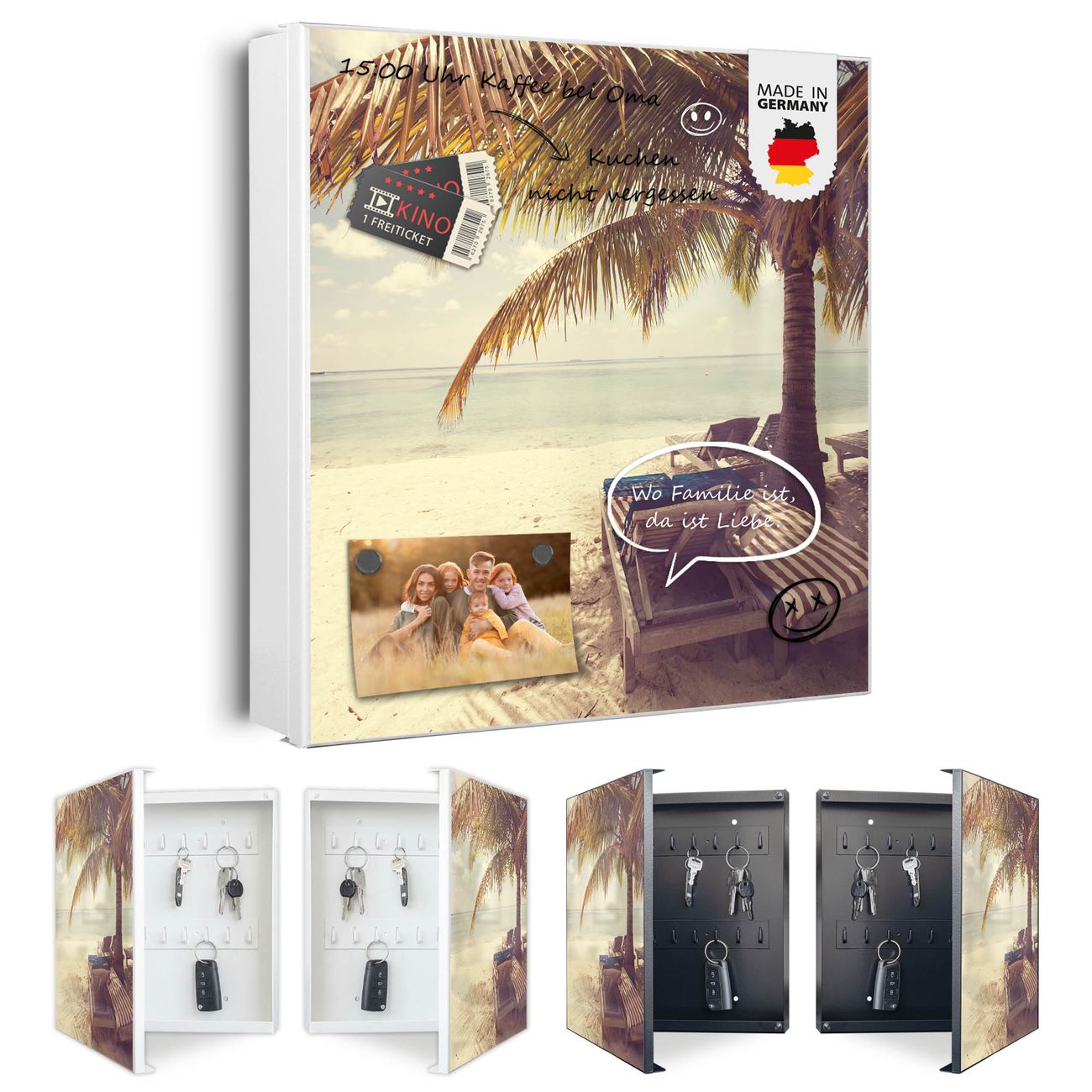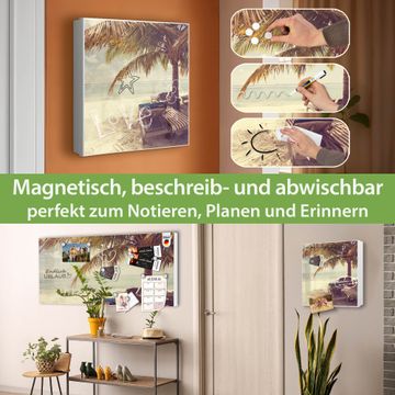 Bringe Ordnung und Eleganz in deinen Eingangsbereich mit dem banjado Schlüsselkasten Motiv Motiv Südseestrand. Die moderne Schlüsselbox kombiniert funktionales Design mit hochwertiger Verarbeitung und wird so zu einem echten Hingucker in Flur, Büro oder Ferienwohnung. ✅ Stilvolle Schlüsselaufbewahrung mit Motiv Motiv Südseestrand Der Design-Schlüsselkasten Motiv Motiv Südseestrand bietet Platz für bis zu 32 Schlüssel, die auf 4 stabilen Reihen mit je 8 Haken übersichtlich verstaut werden. Mit seinen kompakten Maßen von 30 x 30 x 5 cm passt die Schlüsselbox perfekt auch in kleinere Räume. Der weiß lackierte Stahlkorpus mit rechts angeschlagenem Türscharnier harmoniert mit gedruckten Folie auf der Front und fügt sich nahtlos in jedes Wohnambiente ein. Ob als Schlüsselorganizer für Zuhause oder als praktische Lösung für Büros, Praxen und Gewerbe, der banjado Schlüsselkasten sorgt für Ordnung und Übersicht. Dank der magnetischen, mit Kreidestiften beschreibbaren Folie auf der Front kannst du Notizen anheften oder Termine direkt auf der Oberfläche festhalten. Die Schlüsselbox Motiv Motiv Südseestrand zur Wandmontage wird inklusive Befestigungsmaterial geliefert und ist schnell angebracht. So hast du deine Schlüssel jederzeit griffbereit und zugleich stilvoll verstaut. Mit diesem banjado Schlüsselkasten Motiv Motiv Südseestrand kombinierst du praktische Aufbewahrung mit stilvollem Wohndesign. Ob privat oder geschäftlich, die Schlüsselbox sorgt für mehr Ordnung, Übersicht und ein wohnliches Ambiente.Vorteile im Überblick