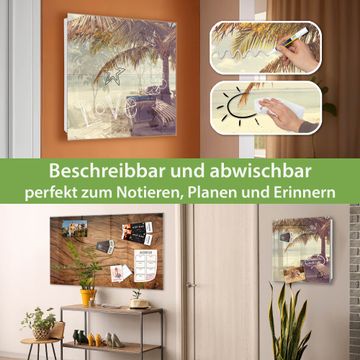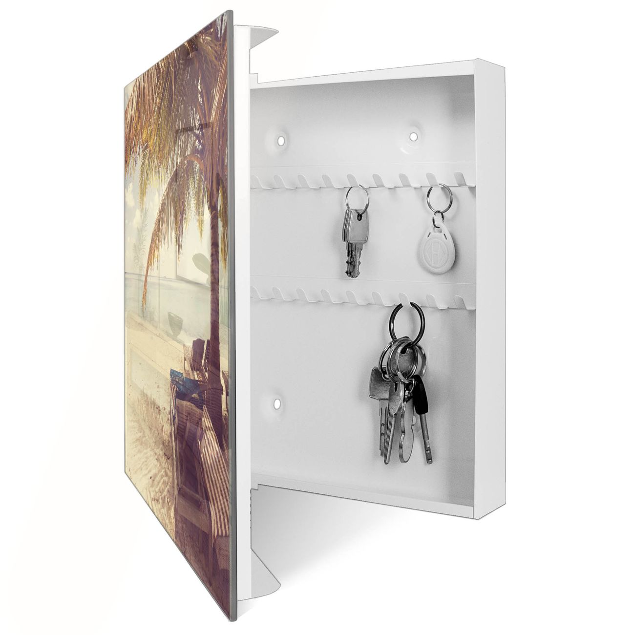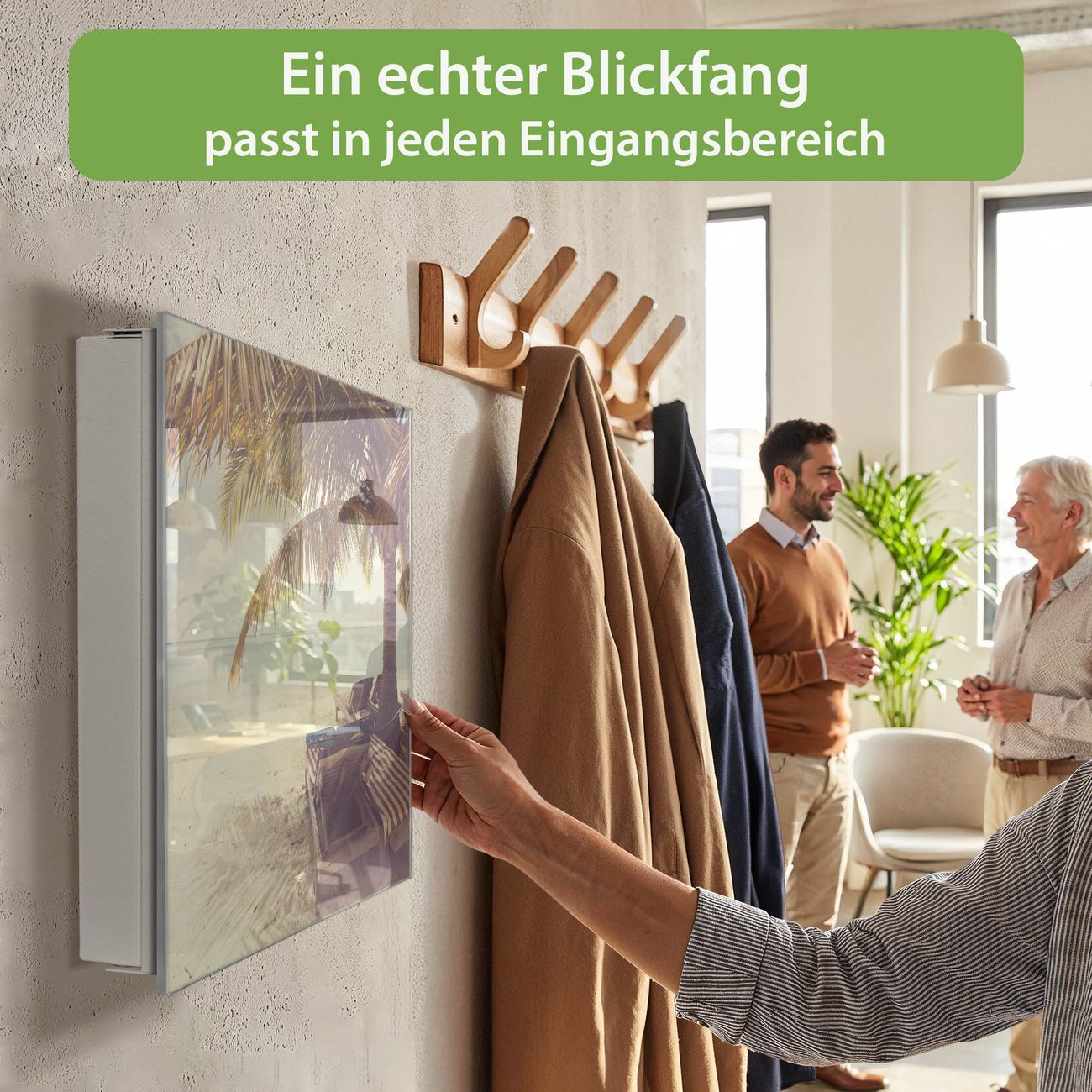 Bringe Ordnung und Eleganz in deinen Eingangsbereich mit dem banjado Schlüsselkasten Motiv Motiv Südseestrand. Die moderne Schlüsselbox kombiniert funktionales Design mit hochwertiger Verarbeitung und wird so zu einem echten Hingucker in Flur, Büro oder Ferienwohnung. ✅ Stilvolle Schlüsselaufbewahrung mit Glasfront im Motiv Motiv Südseestrand Der Design-Schlüsselkasten Motiv Motiv Südseestrand bietet Platz für bis zu 50 Schlüssel, die auf 5 stabilen Reihen mit je 10 Haken übersichtlich verstaut werden. Mit seinen kompakten Maßen von 30 x 30 x 5 cm passt die Schlüsselbox perfekt auch in kleinere Räume. Der weiß lackierte Stahlkorpus mit rechts angeschlagenem Türscharnier harmoniert mit der Glasfront und fügt sich nahtlos in jedes Wohnambiente ein. Ob als Schlüsselorganizer für Zuhause oder als praktische Lösung für Büros, Praxen und Gewerbe, der banjado Schlüsselkasten sorgt für Ordnung und Übersicht. Dank der magnetischen, mit Kreidestiften beschreibbaren Glasfront kannst du Notizen anheften oder Termine direkt auf der Oberfläche festhalten. Die Schlüsselbox Motiv Motiv Südseestrand zur Wandmontage wird inklusive Befestigungsmaterial geliefert und ist schnell angebracht. So hast du deine Schlüssel jederzeit griffbereit und zugleich stilvoll verstaut. Mit diesem banjado Schlüsselkasten Motiv Motiv Südseestrand kombinierst du praktische Aufbewahrung mit stilvollem Wohndesign. Ob privat oder geschäftlich, die Schlüsselbox sorgt für mehr Ordnung, Übersicht und ein wohnliches Ambiente.Vorteile im Überblick