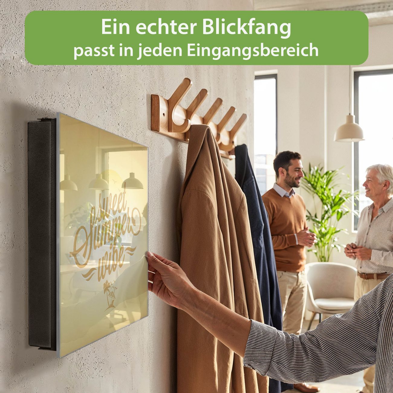 Bringe Ordnung und Eleganz in deinen Eingangsbereich mit dem banjado Schlüsselkasten Motiv Motiv Summer Wibe. Die moderne Schlüsselbox kombiniert funktionales Design mit hochwertiger Verarbeitung und wird so zu einem echten Hingucker in Flur, Büro oder Ferienwohnung. ✅ Stilvolle Schlüsselaufbewahrung mit Glasfront im Motiv Motiv Summer Wibe Der Design-Schlüsselkasten Motiv Motiv Summer Wibe bietet Platz für bis zu 50 Schlüssel, die auf 5 stabilen Reihen mit je 10 Haken übersichtlich verstaut werden. Mit seinen kompakten Maßen von 30 x 30 x 5 cm passt die Schlüsselbox perfekt auch in kleinere Räume. Der schwarz lackierte Stahlkorpus mit rechts angeschlagenem Türscharnier harmoniert mit der Glasfront und fügt sich nahtlos in jedes Wohnambiente ein. Ob als Schlüsselorganizer für Zuhause oder als praktische Lösung für Büros, Praxen und Gewerbe, der banjado Schlüsselkasten sorgt für Ordnung und Übersicht. Dank der magnetischen, mit Kreidestiften beschreibbaren Glasfront kannst du Notizen anheften oder Termine direkt auf der Oberfläche festhalten. Die Schlüsselbox Motiv Motiv Summer Wibe zur Wandmontage wird inklusive Befestigungsmaterial geliefert und ist schnell angebracht. So hast du deine Schlüssel jederzeit griffbereit und zugleich stilvoll verstaut. Mit diesem banjado Schlüsselkasten Motiv Motiv Summer Wibe kombinierst du praktische Aufbewahrung mit stilvollem Wohndesign. Ob privat oder geschäftlich, die Schlüsselbox sorgt für mehr Ordnung, Übersicht und ein wohnliches Ambiente.Vorteile im Überblick