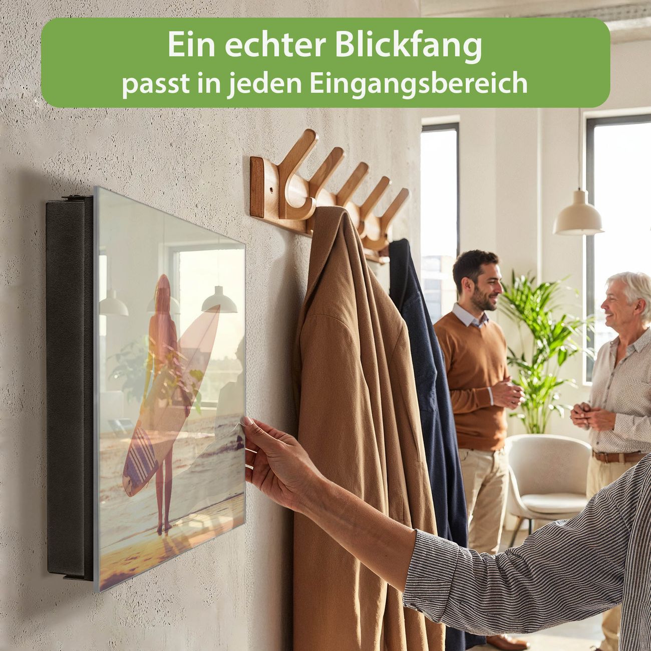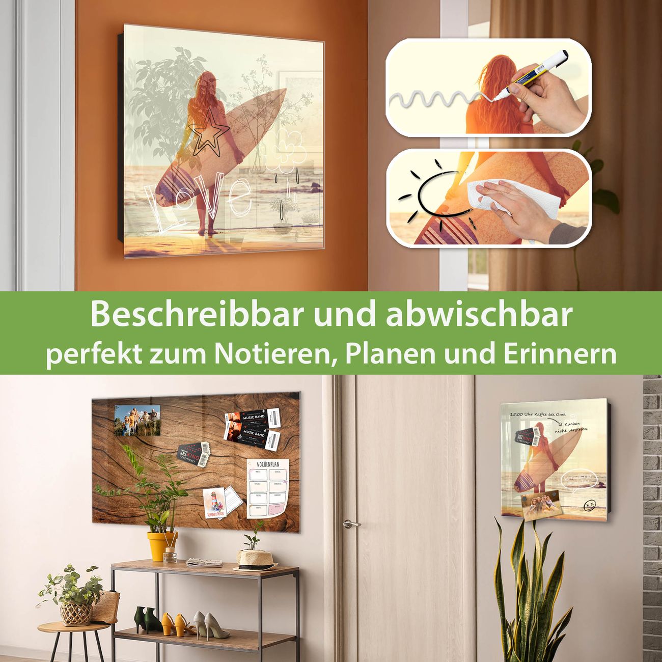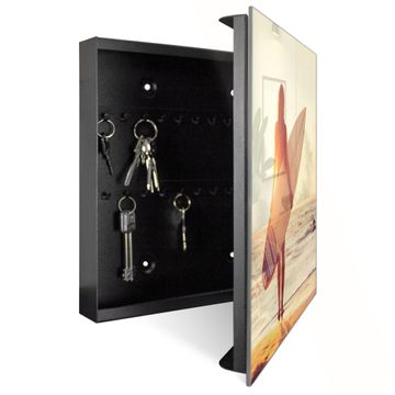 Bringe Ordnung und Eleganz in deinen Eingangsbereich mit dem banjado Schlüsselkasten Motiv Motiv Surfer Girl. Die moderne Schlüsselbox kombiniert funktionales Design mit hochwertiger Verarbeitung und wird so zu einem echten Hingucker in Flur, Büro oder Ferienwohnung. ✅ Stilvolle Schlüsselaufbewahrung mit Glasfront im Motiv Motiv Surfer Girl Der Design-Schlüsselkasten Motiv Motiv Surfer Girl bietet Platz für bis zu 50 Schlüssel, die auf 5 stabilen Reihen mit je 10 Haken übersichtlich verstaut werden. Mit seinen kompakten Maßen von 30 x 30 x 5 cm passt die Schlüsselbox perfekt auch in kleinere Räume. Der schwarz lackierte Stahlkorpus mit rechts angeschlagenem Türscharnier harmoniert mit der Glasfront und fügt sich nahtlos in jedes Wohnambiente ein. Ob als Schlüsselorganizer für Zuhause oder als praktische Lösung für Büros, Praxen und Gewerbe, der banjado Schlüsselkasten sorgt für Ordnung und Übersicht. Dank der magnetischen, mit Kreidestiften beschreibbaren Glasfront kannst du Notizen anheften oder Termine direkt auf der Oberfläche festhalten. Die Schlüsselbox Motiv Motiv Surfer Girl zur Wandmontage wird inklusive Befestigungsmaterial geliefert und ist schnell angebracht. So hast du deine Schlüssel jederzeit griffbereit und zugleich stilvoll verstaut. Mit diesem banjado Schlüsselkasten Motiv Motiv Surfer Girl kombinierst du praktische Aufbewahrung mit stilvollem Wohndesign. Ob privat oder geschäftlich, die Schlüsselbox sorgt für mehr Ordnung, Übersicht und ein wohnliches Ambiente.Vorteile im Überblick