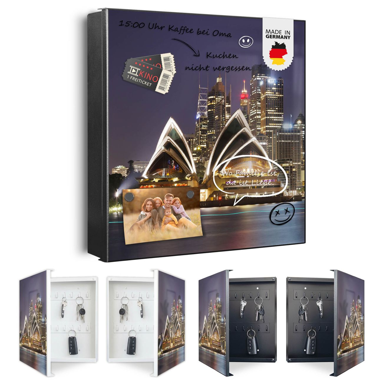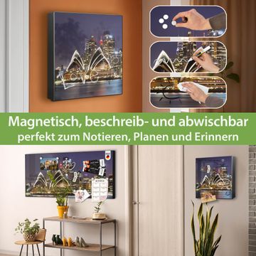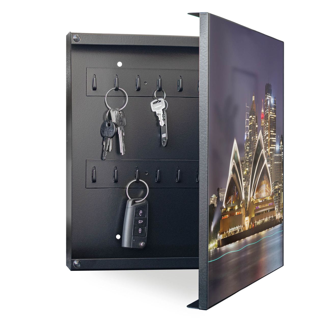 Bringe Ordnung und Eleganz in deinen Eingangsbereich mit dem banjado Schlüsselkasten Motiv Motiv Sydney. Die moderne Schlüsselbox kombiniert funktionales Design mit hochwertiger Verarbeitung und wird so zu einem echten Hingucker in Flur, Büro oder Ferienwohnung. ✅ Stilvolle Schlüsselaufbewahrung mit Motiv Motiv Sydney Der Design-Schlüsselkasten Motiv Motiv Sydney bietet Platz für bis zu 32 Schlüssel, die auf 4 stabilen Reihen mit je 8 Haken übersichtlich verstaut werden. Mit seinen kompakten Maßen von 30 x 30 x 5 cm passt die Schlüsselbox perfekt auch in kleinere Räume. Der schwarz lackierte Stahlkorpus mit rechts angeschlagenem Türscharnier harmoniert mit gedruckten Folie auf der Front und fügt sich nahtlos in jedes Wohnambiente ein. Ob als Schlüsselorganizer für Zuhause oder als praktische Lösung für Büros, Praxen und Gewerbe, der banjado Schlüsselkasten sorgt für Ordnung und Übersicht. Dank der magnetischen, mit Kreidestiften beschreibbaren Folie auf der Front kannst du Notizen anheften oder Termine direkt auf der Oberfläche festhalten. Die Schlüsselbox Motiv Motiv Sydney zur Wandmontage wird inklusive Befestigungsmaterial geliefert und ist schnell angebracht. So hast du deine Schlüssel jederzeit griffbereit und zugleich stilvoll verstaut. Mit diesem banjado Schlüsselkasten Motiv Motiv Sydney kombinierst du praktische Aufbewahrung mit stilvollem Wohndesign. Ob privat oder geschäftlich, die Schlüsselbox sorgt für mehr Ordnung, Übersicht und ein wohnliches Ambiente.Vorteile im Überblick