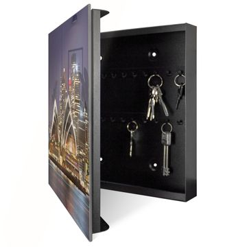 Bringe Ordnung und Eleganz in deinen Eingangsbereich mit dem banjado Schlüsselkasten Motiv Motiv Sydney. Die moderne Schlüsselbox kombiniert funktionales Design mit hochwertiger Verarbeitung und wird so zu einem echten Hingucker in Flur, Büro oder Ferienwohnung. ✅ Stilvolle Schlüsselaufbewahrung mit Glasfront im Motiv Motiv Sydney Der Design-Schlüsselkasten Motiv Motiv Sydney bietet Platz für bis zu 50 Schlüssel, die auf 5 stabilen Reihen mit je 10 Haken übersichtlich verstaut werden. Mit seinen kompakten Maßen von 30 x 30 x 5 cm passt die Schlüsselbox perfekt auch in kleinere Räume. Der schwarz lackierte Stahlkorpus mit rechts angeschlagenem Türscharnier harmoniert mit der Glasfront und fügt sich nahtlos in jedes Wohnambiente ein. Ob als Schlüsselorganizer für Zuhause oder als praktische Lösung für Büros, Praxen und Gewerbe, der banjado Schlüsselkasten sorgt für Ordnung und Übersicht. Dank der magnetischen, mit Kreidestiften beschreibbaren Glasfront kannst du Notizen anheften oder Termine direkt auf der Oberfläche festhalten. Die Schlüsselbox Motiv Motiv Sydney zur Wandmontage wird inklusive Befestigungsmaterial geliefert und ist schnell angebracht. So hast du deine Schlüssel jederzeit griffbereit und zugleich stilvoll verstaut. Mit diesem banjado Schlüsselkasten Motiv Motiv Sydney kombinierst du praktische Aufbewahrung mit stilvollem Wohndesign. Ob privat oder geschäftlich, die Schlüsselbox sorgt für mehr Ordnung, Übersicht und ein wohnliches Ambiente.Vorteile im Überblick