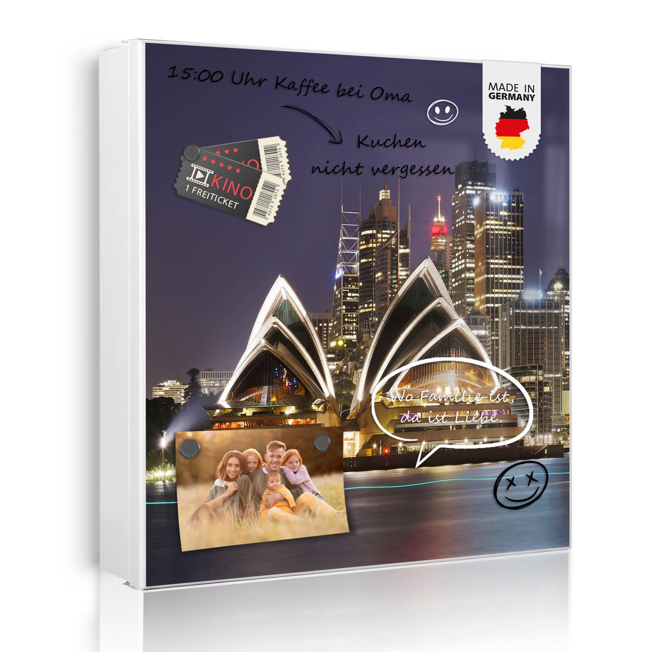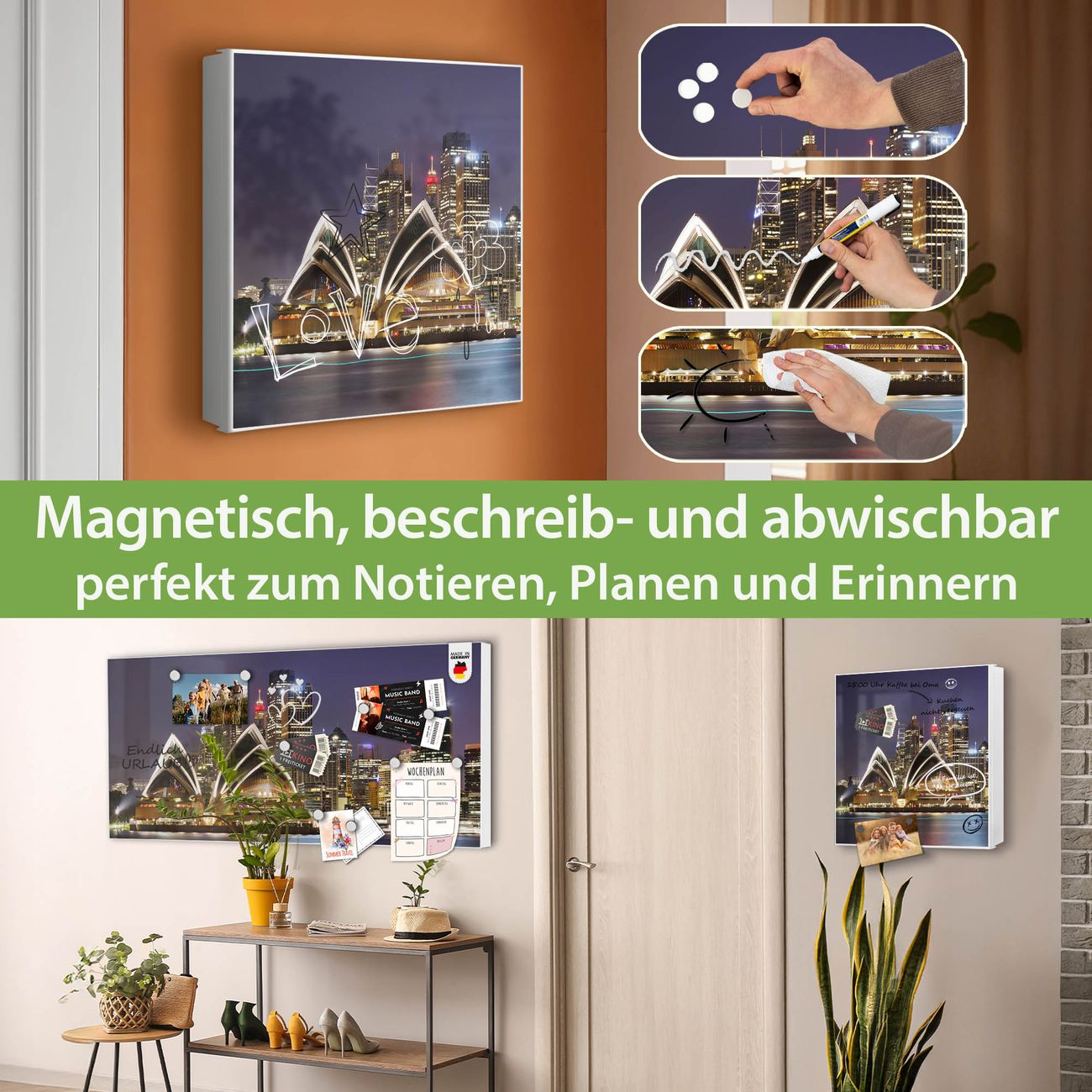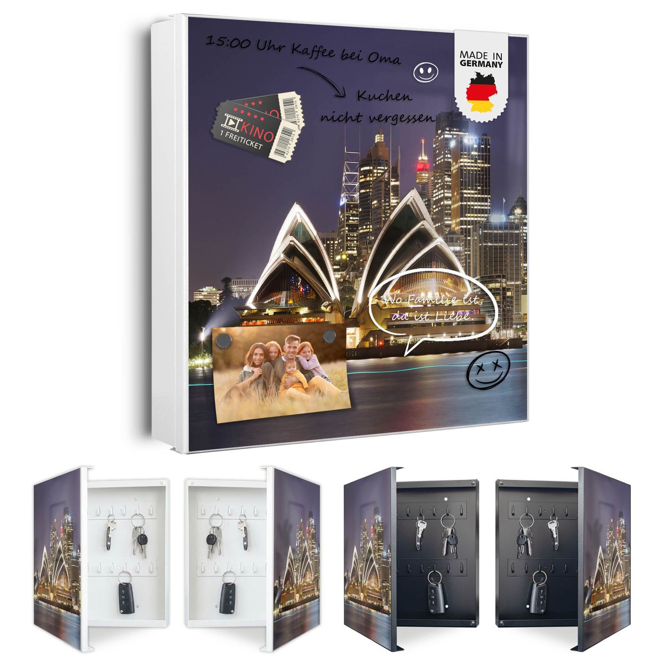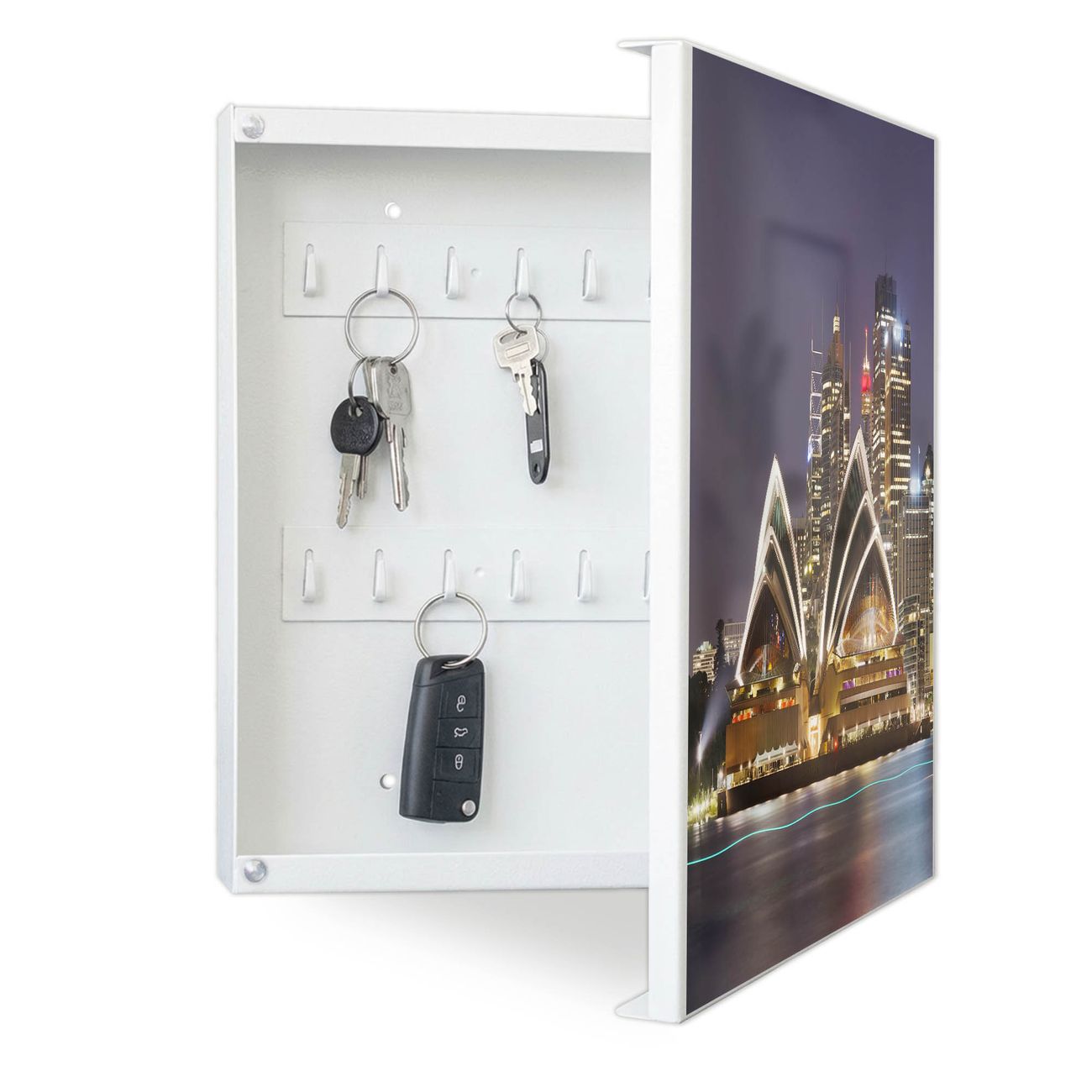 Bringe Ordnung und Eleganz in deinen Eingangsbereich mit dem banjado Schlüsselkasten Motiv Motiv Sydney. Die moderne Schlüsselbox kombiniert funktionales Design mit hochwertiger Verarbeitung und wird so zu einem echten Hingucker in Flur, Büro oder Ferienwohnung. ✅ Stilvolle Schlüsselaufbewahrung mit Motiv Motiv Sydney Der Design-Schlüsselkasten Motiv Motiv Sydney bietet Platz für bis zu 32 Schlüssel, die auf 4 stabilen Reihen mit je 8 Haken übersichtlich verstaut werden. Mit seinen kompakten Maßen von 30 x 30 x 5 cm passt die Schlüsselbox perfekt auch in kleinere Räume. Der weiß lackierte Stahlkorpus mit rechts angeschlagenem Türscharnier harmoniert mit gedruckten Folie auf der Front und fügt sich nahtlos in jedes Wohnambiente ein. Ob als Schlüsselorganizer für Zuhause oder als praktische Lösung für Büros, Praxen und Gewerbe, der banjado Schlüsselkasten sorgt für Ordnung und Übersicht. Dank der magnetischen, mit Kreidestiften beschreibbaren Folie auf der Front kannst du Notizen anheften oder Termine direkt auf der Oberfläche festhalten. Die Schlüsselbox Motiv Motiv Sydney zur Wandmontage wird inklusive Befestigungsmaterial geliefert und ist schnell angebracht. So hast du deine Schlüssel jederzeit griffbereit und zugleich stilvoll verstaut. Mit diesem banjado Schlüsselkasten Motiv Motiv Sydney kombinierst du praktische Aufbewahrung mit stilvollem Wohndesign. Ob privat oder geschäftlich, die Schlüsselbox sorgt für mehr Ordnung, Übersicht und ein wohnliches Ambiente.Vorteile im Überblick