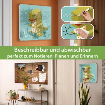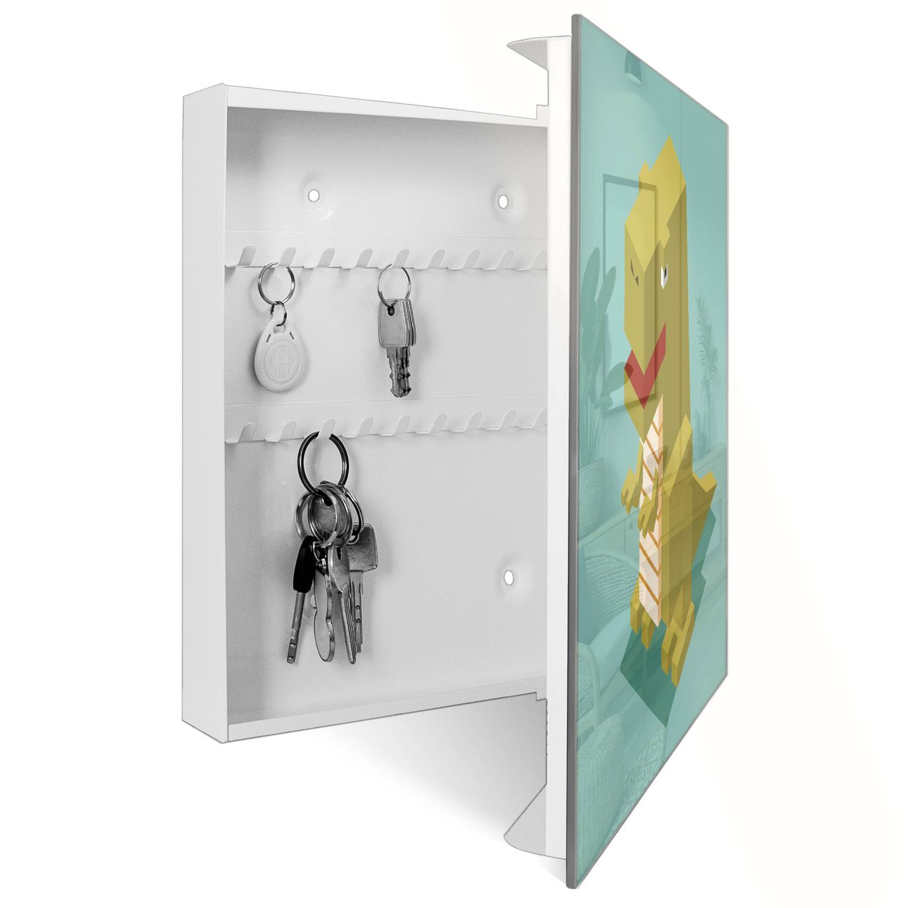 Bringe Ordnung und Eleganz in deinen Eingangsbereich mit dem banjado Schlüsselkasten Motiv Motiv T-Rex Block. Die moderne Schlüsselbox kombiniert funktionales Design mit hochwertiger Verarbeitung und wird so zu einem echten Hingucker in Flur, Büro oder Ferienwohnung. ✅ Stilvolle Schlüsselaufbewahrung mit Glasfront im Motiv Motiv T-Rex Block Der Design-Schlüsselkasten Motiv Motiv T-Rex Block bietet Platz für bis zu 50 Schlüssel, die auf 5 stabilen Reihen mit je 10 Haken übersichtlich verstaut werden. Mit seinen kompakten Maßen von 30 x 30 x 5 cm passt die Schlüsselbox perfekt auch in kleinere Räume. Der weiß lackierte Stahlkorpus mit rechts angeschlagenem Türscharnier harmoniert mit der Glasfront und fügt sich nahtlos in jedes Wohnambiente ein. Ob als Schlüsselorganizer für Zuhause oder als praktische Lösung für Büros, Praxen und Gewerbe, der banjado Schlüsselkasten sorgt für Ordnung und Übersicht. Dank der magnetischen, mit Kreidestiften beschreibbaren Glasfront kannst du Notizen anheften oder Termine direkt auf der Oberfläche festhalten. Die Schlüsselbox Motiv Motiv T-Rex Block zur Wandmontage wird inklusive Befestigungsmaterial geliefert und ist schnell angebracht. So hast du deine Schlüssel jederzeit griffbereit und zugleich stilvoll verstaut. Mit diesem banjado Schlüsselkasten Motiv Motiv T-Rex Block kombinierst du praktische Aufbewahrung mit stilvollem Wohndesign. Ob privat oder geschäftlich, die Schlüsselbox sorgt für mehr Ordnung, Übersicht und ein wohnliches Ambiente.Vorteile im Überblick
