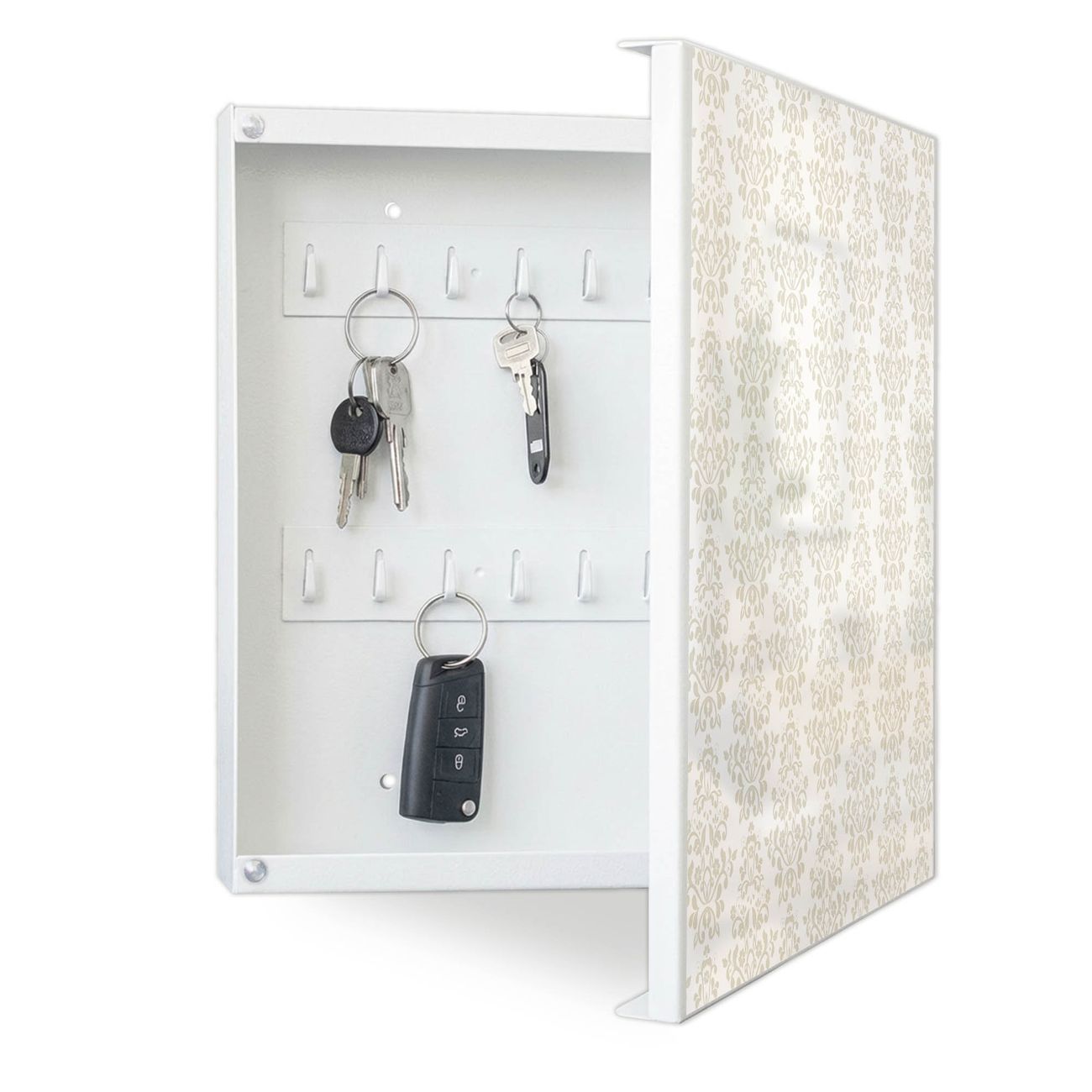 Bringe Ordnung und Eleganz in deinen Eingangsbereich mit dem banjado Schlüsselkasten Motiv Motiv Tapete Weiß. Die moderne Schlüsselbox kombiniert funktionales Design mit hochwertiger Verarbeitung und wird so zu einem echten Hingucker in Flur, Büro oder Ferienwohnung. ✅ Stilvolle Schlüsselaufbewahrung mit Motiv Motiv Tapete Weiß Der Design-Schlüsselkasten Motiv Motiv Tapete Weiß bietet Platz für bis zu 32 Schlüssel, die auf 4 stabilen Reihen mit je 8 Haken übersichtlich verstaut werden. Mit seinen kompakten Maßen von 30 x 30 x 5 cm passt die Schlüsselbox perfekt auch in kleinere Räume. Der weiß lackierte Stahlkorpus mit rechts angeschlagenem Türscharnier harmoniert mit gedruckten Folie auf der Front und fügt sich nahtlos in jedes Wohnambiente ein. Ob als Schlüsselorganizer für Zuhause oder als praktische Lösung für Büros, Praxen und Gewerbe, der banjado Schlüsselkasten sorgt für Ordnung und Übersicht. Dank der magnetischen, mit Kreidestiften beschreibbaren Folie auf der Front kannst du Notizen anheften oder Termine direkt auf der Oberfläche festhalten. Die Schlüsselbox Motiv Motiv Tapete Weiß zur Wandmontage wird inklusive Befestigungsmaterial geliefert und ist schnell angebracht. So hast du deine Schlüssel jederzeit griffbereit und zugleich stilvoll verstaut. Mit diesem banjado Schlüsselkasten Motiv Motiv Tapete Weiß kombinierst du praktische Aufbewahrung mit stilvollem Wohndesign. Ob privat oder geschäftlich, die Schlüsselbox sorgt für mehr Ordnung, Übersicht und ein wohnliches Ambiente.Vorteile im Überblick