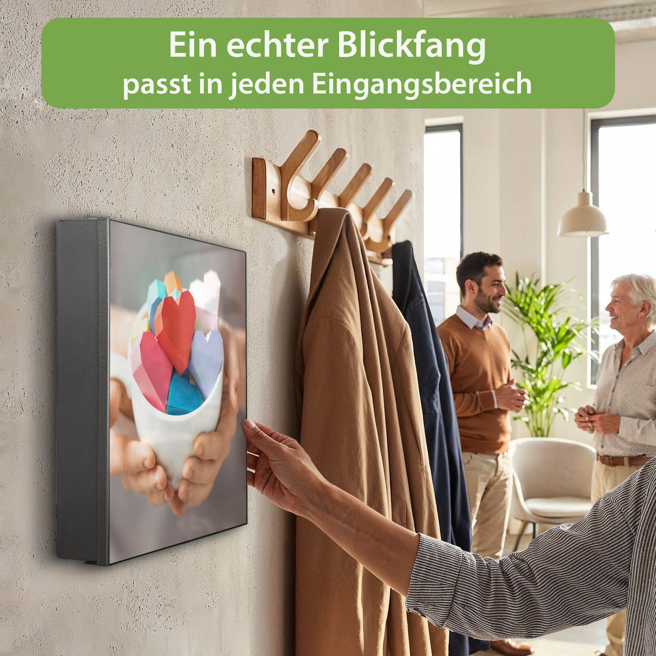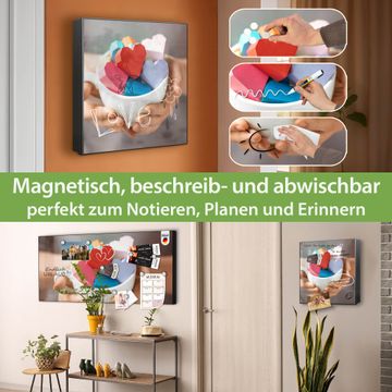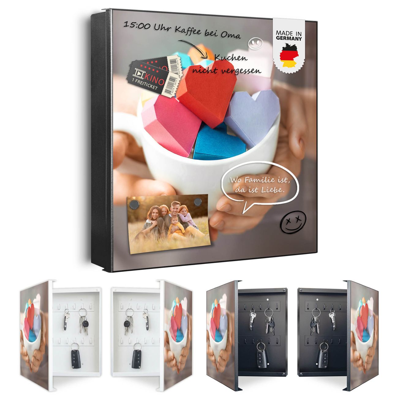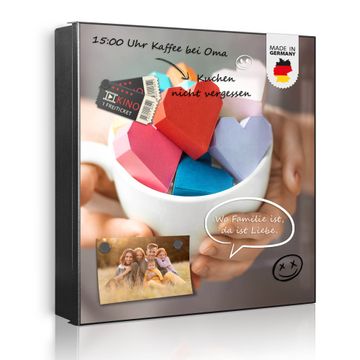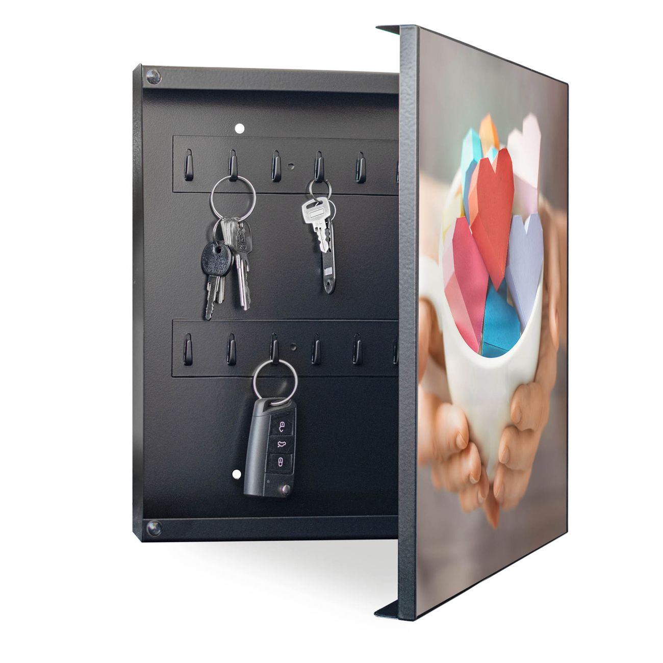 Bringe Ordnung und Eleganz in deinen Eingangsbereich mit dem banjado Schlüsselkasten Motiv Motiv Tasse voller Herzen. Die moderne Schlüsselbox kombiniert funktionales Design mit hochwertiger Verarbeitung und wird so zu einem echten Hingucker in Flur, Büro oder Ferienwohnung. ✅ Stilvolle Schlüsselaufbewahrung mit Motiv Motiv Tasse voller Herzen Der Design-Schlüsselkasten Motiv Motiv Tasse voller Herzen bietet Platz für bis zu 32 Schlüssel, die auf 4 stabilen Reihen mit je 8 Haken übersichtlich verstaut werden. Mit seinen kompakten Maßen von 30 x 30 x 5 cm passt die Schlüsselbox perfekt auch in kleinere Räume. Der schwarz lackierte Stahlkorpus mit rechts angeschlagenem Türscharnier harmoniert mit gedruckten Folie auf der Front und fügt sich nahtlos in jedes Wohnambiente ein. Ob als Schlüsselorganizer für Zuhause oder als praktische Lösung für Büros, Praxen und Gewerbe, der banjado Schlüsselkasten sorgt für Ordnung und Übersicht. Dank der magnetischen, mit Kreidestiften beschreibbaren Folie auf der Front kannst du Notizen anheften oder Termine direkt auf der Oberfläche festhalten. Die Schlüsselbox Motiv Motiv Tasse voller Herzen zur Wandmontage wird inklusive Befestigungsmaterial geliefert und ist schnell angebracht. So hast du deine Schlüssel jederzeit griffbereit und zugleich stilvoll verstaut. Mit diesem banjado Schlüsselkasten Motiv Motiv Tasse voller Herzen kombinierst du praktische Aufbewahrung mit stilvollem Wohndesign. Ob privat oder geschäftlich, die Schlüsselbox sorgt für mehr Ordnung, Übersicht und ein wohnliches Ambiente.Vorteile im Überblick