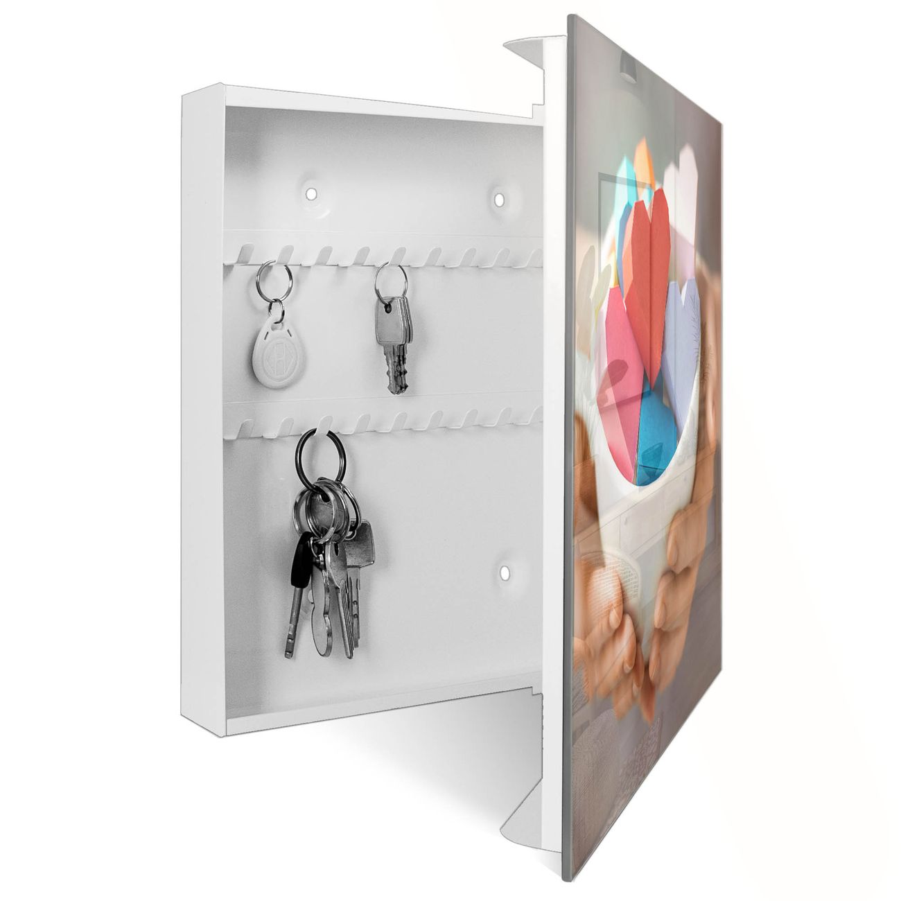 Bringe Ordnung und Eleganz in deinen Eingangsbereich mit dem banjado Schlüsselkasten Motiv Motiv Tasse voller Herzen. Die moderne Schlüsselbox kombiniert funktionales Design mit hochwertiger Verarbeitung und wird so zu einem echten Hingucker in Flur, Büro oder Ferienwohnung. ✅ Stilvolle Schlüsselaufbewahrung mit Glasfront im Motiv Motiv Tasse voller Herzen Der Design-Schlüsselkasten Motiv Motiv Tasse voller Herzen bietet Platz für bis zu 50 Schlüssel, die auf 5 stabilen Reihen mit je 10 Haken übersichtlich verstaut werden. Mit seinen kompakten Maßen von 30 x 30 x 5 cm passt die Schlüsselbox perfekt auch in kleinere Räume. Der weiß lackierte Stahlkorpus mit rechts angeschlagenem Türscharnier harmoniert mit der Glasfront und fügt sich nahtlos in jedes Wohnambiente ein. Ob als Schlüsselorganizer für Zuhause oder als praktische Lösung für Büros, Praxen und Gewerbe, der banjado Schlüsselkasten sorgt für Ordnung und Übersicht. Dank der magnetischen, mit Kreidestiften beschreibbaren Glasfront kannst du Notizen anheften oder Termine direkt auf der Oberfläche festhalten. Die Schlüsselbox Motiv Motiv Tasse voller Herzen zur Wandmontage wird inklusive Befestigungsmaterial geliefert und ist schnell angebracht. So hast du deine Schlüssel jederzeit griffbereit und zugleich stilvoll verstaut. Mit diesem banjado Schlüsselkasten Motiv Motiv Tasse voller Herzen kombinierst du praktische Aufbewahrung mit stilvollem Wohndesign. Ob privat oder geschäftlich, die Schlüsselbox sorgt für mehr Ordnung, Übersicht und ein wohnliches Ambiente.Vorteile im Überblick