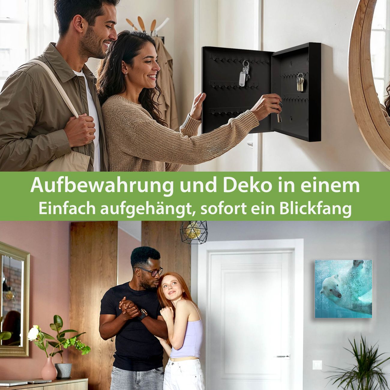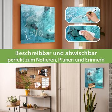 Bringe Ordnung und Eleganz in deinen Eingangsbereich mit dem banjado Schlüsselkasten Motiv Motiv Tauchender Eisbär. Die moderne Schlüsselbox kombiniert funktionales Design mit hochwertiger Verarbeitung und wird so zu einem echten Hingucker in Flur, Büro oder Ferienwohnung. ✅ Stilvolle Schlüsselaufbewahrung mit Glasfront im Motiv Motiv Tauchender Eisbär Der Design-Schlüsselkasten Motiv Motiv Tauchender Eisbär bietet Platz für bis zu 50 Schlüssel, die auf 5 stabilen Reihen mit je 10 Haken übersichtlich verstaut werden. Mit seinen kompakten Maßen von 30 x 30 x 5 cm passt die Schlüsselbox perfekt auch in kleinere Räume. Der schwarz lackierte Stahlkorpus mit rechts angeschlagenem Türscharnier harmoniert mit der Glasfront und fügt sich nahtlos in jedes Wohnambiente ein. Ob als Schlüsselorganizer für Zuhause oder als praktische Lösung für Büros, Praxen und Gewerbe, der banjado Schlüsselkasten sorgt für Ordnung und Übersicht. Dank der magnetischen, mit Kreidestiften beschreibbaren Glasfront kannst du Notizen anheften oder Termine direkt auf der Oberfläche festhalten. Die Schlüsselbox Motiv Motiv Tauchender Eisbär zur Wandmontage wird inklusive Befestigungsmaterial geliefert und ist schnell angebracht. So hast du deine Schlüssel jederzeit griffbereit und zugleich stilvoll verstaut. Mit diesem banjado Schlüsselkasten Motiv Motiv Tauchender Eisbär kombinierst du praktische Aufbewahrung mit stilvollem Wohndesign. Ob privat oder geschäftlich, die Schlüsselbox sorgt für mehr Ordnung, Übersicht und ein wohnliches Ambiente.Vorteile im Überblick