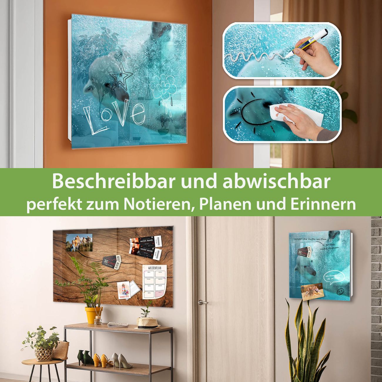 ✅ Magnetisch und mit Kreidestift beschreibbar, gehärtetes Glas, links angeschlagene TürOrdnung und Design in einem