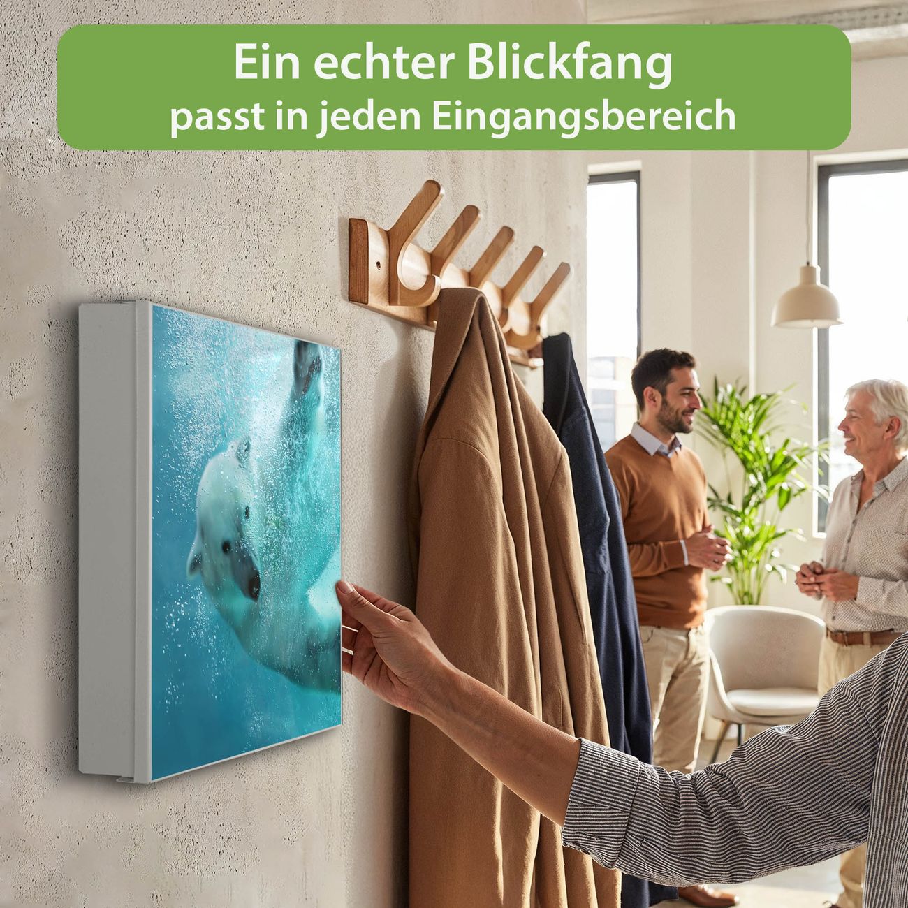 Bringe Ordnung und Eleganz in deinen Eingangsbereich mit dem banjado Schlüsselkasten Motiv Motiv Tauchender Eisbär. Die moderne Schlüsselbox kombiniert funktionales Design mit hochwertiger Verarbeitung und wird so zu einem echten Hingucker in Flur, Büro oder Ferienwohnung. ✅ Stilvolle Schlüsselaufbewahrung mit Motiv Motiv Tauchender Eisbär Der Design-Schlüsselkasten Motiv Motiv Tauchender Eisbär bietet Platz für bis zu 32 Schlüssel, die auf 4 stabilen Reihen mit je 8 Haken übersichtlich verstaut werden. Mit seinen kompakten Maßen von 30 x 30 x 5 cm passt die Schlüsselbox perfekt auch in kleinere Räume. Der weiß lackierte Stahlkorpus mit links angeschlagenem Türscharnier harmoniert mit gedruckten Folie auf der Front und fügt sich nahtlos in jedes Wohnambiente ein. Ob als Schlüsselorganizer für Zuhause oder als praktische Lösung für Büros, Praxen und Gewerbe, der banjado Schlüsselkasten sorgt für Ordnung und Übersicht. Dank der magnetischen, mit Kreidestiften beschreibbaren Folie auf der Front kannst du Notizen anheften oder Termine direkt auf der Oberfläche festhalten. Die Schlüsselbox Motiv Motiv Tauchender Eisbär zur Wandmontage wird inklusive Befestigungsmaterial geliefert und ist schnell angebracht. So hast du deine Schlüssel jederzeit griffbereit und zugleich stilvoll verstaut. Mit diesem banjado Schlüsselkasten Motiv Motiv Tauchender Eisbär kombinierst du praktische Aufbewahrung mit stilvollem Wohndesign. Ob privat oder geschäftlich, die Schlüsselbox sorgt für mehr Ordnung, Übersicht und ein wohnliches Ambiente.Vorteile im Überblick