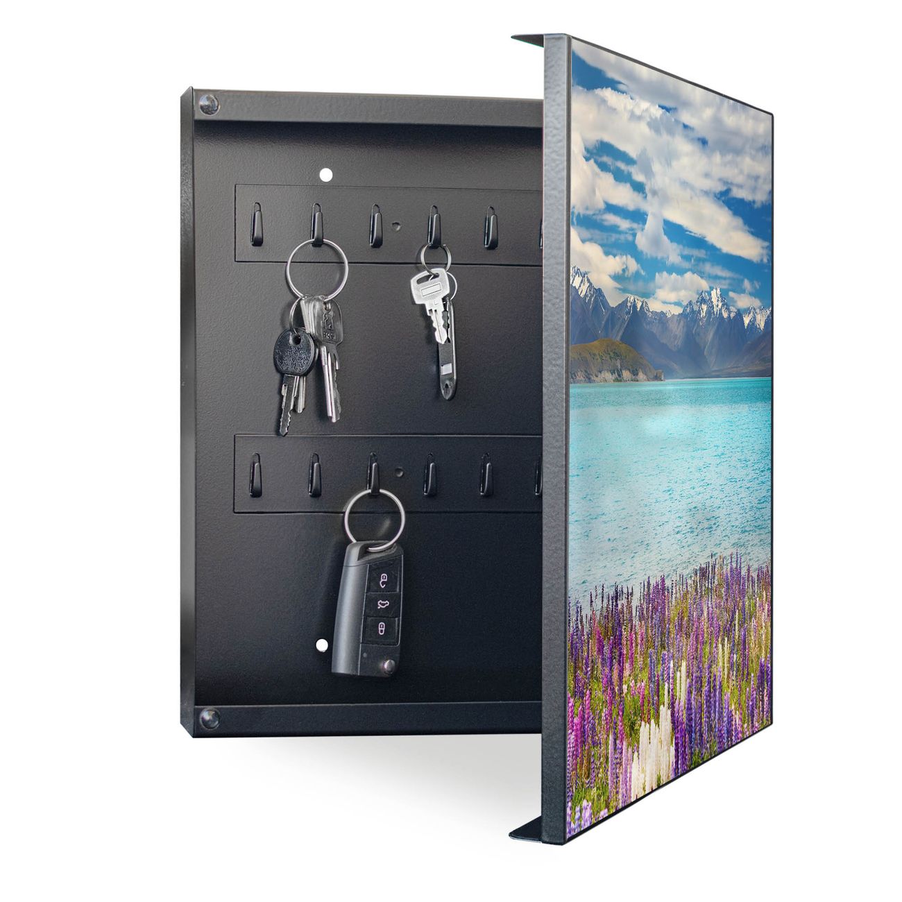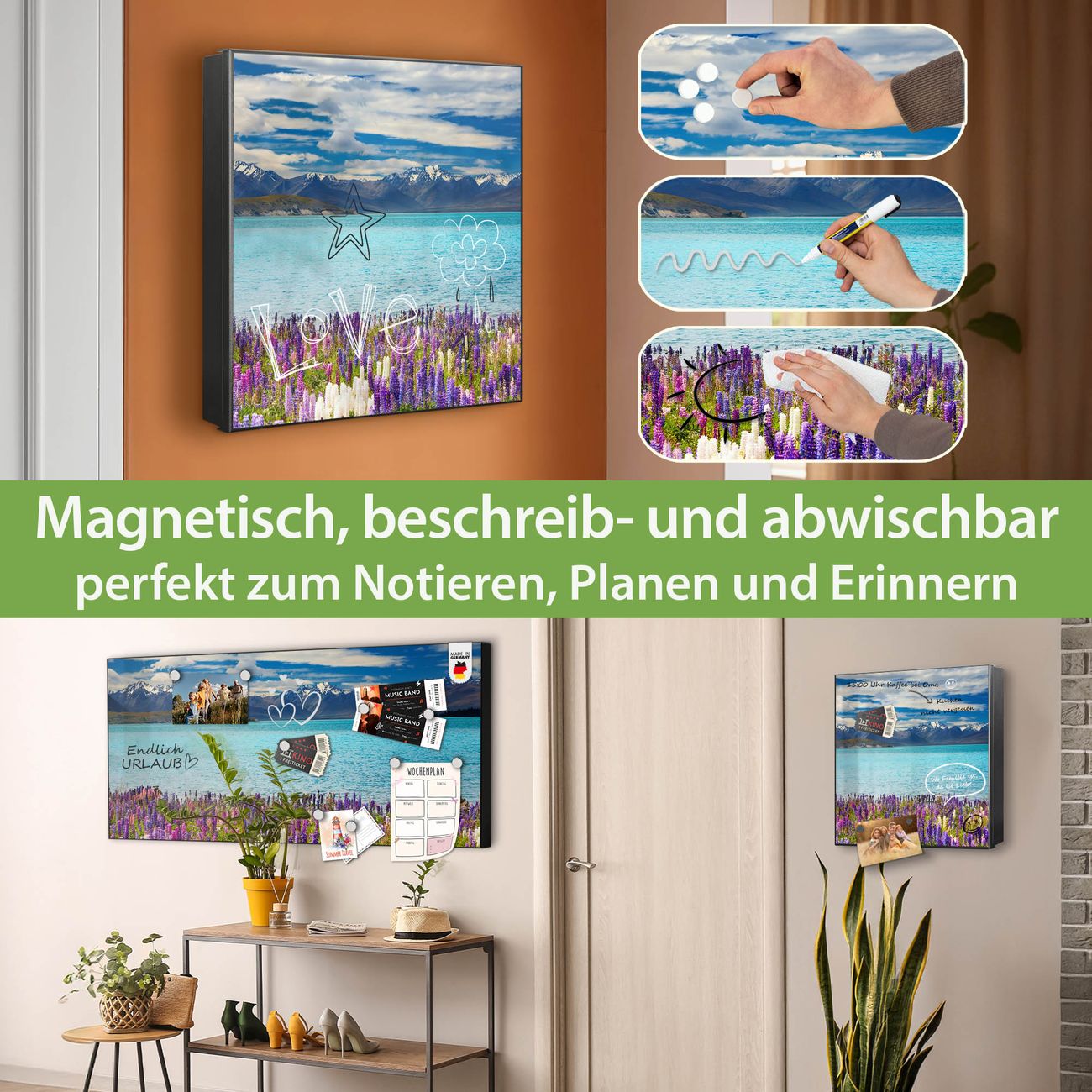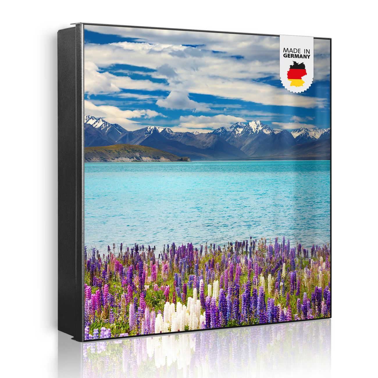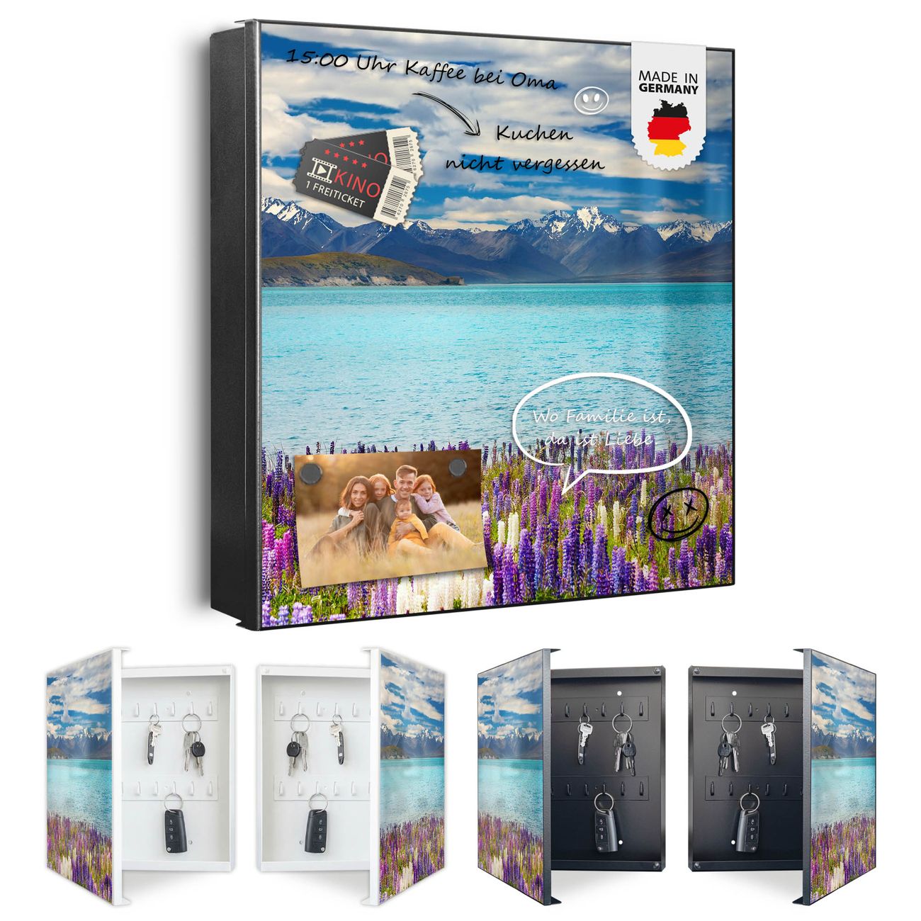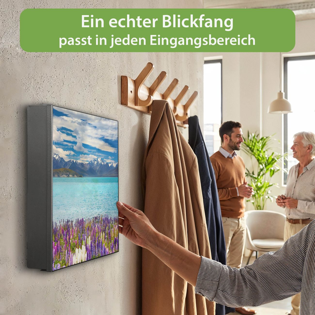 Bringe Ordnung und Eleganz in deinen Eingangsbereich mit dem banjado Schlüsselkasten Motiv Motiv Tekapo See. Die moderne Schlüsselbox kombiniert funktionales Design mit hochwertiger Verarbeitung und wird so zu einem echten Hingucker in Flur, Büro oder Ferienwohnung. ✅ Stilvolle Schlüsselaufbewahrung mit Motiv Motiv Tekapo See Der Design-Schlüsselkasten Motiv Motiv Tekapo See bietet Platz für bis zu 32 Schlüssel, die auf 4 stabilen Reihen mit je 8 Haken übersichtlich verstaut werden. Mit seinen kompakten Maßen von 30 x 30 x 5 cm passt die Schlüsselbox perfekt auch in kleinere Räume. Der schwarz lackierte Stahlkorpus mit rechts angeschlagenem Türscharnier harmoniert mit gedruckten Folie auf der Front und fügt sich nahtlos in jedes Wohnambiente ein. Ob als Schlüsselorganizer für Zuhause oder als praktische Lösung für Büros, Praxen und Gewerbe, der banjado Schlüsselkasten sorgt für Ordnung und Übersicht. Dank der magnetischen, mit Kreidestiften beschreibbaren Folie auf der Front kannst du Notizen anheften oder Termine direkt auf der Oberfläche festhalten. Die Schlüsselbox Motiv Motiv Tekapo See zur Wandmontage wird inklusive Befestigungsmaterial geliefert und ist schnell angebracht. So hast du deine Schlüssel jederzeit griffbereit und zugleich stilvoll verstaut. Mit diesem banjado Schlüsselkasten Motiv Motiv Tekapo See kombinierst du praktische Aufbewahrung mit stilvollem Wohndesign. Ob privat oder geschäftlich, die Schlüsselbox sorgt für mehr Ordnung, Übersicht und ein wohnliches Ambiente.Vorteile im Überblick