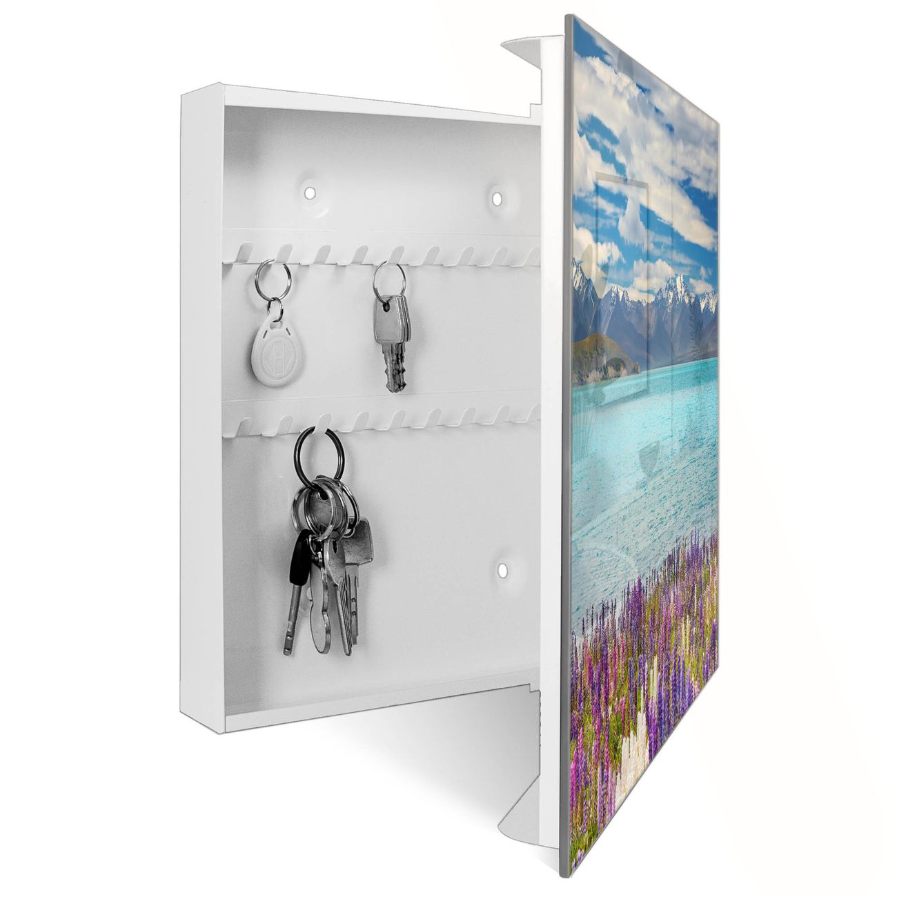 Bringe Ordnung und Eleganz in deinen Eingangsbereich mit dem banjado Schlüsselkasten Motiv Motiv Tekapo See. Die moderne Schlüsselbox kombiniert funktionales Design mit hochwertiger Verarbeitung und wird so zu einem echten Hingucker in Flur, Büro oder Ferienwohnung. ✅ Stilvolle Schlüsselaufbewahrung mit Glasfront im Motiv Motiv Tekapo See Der Design-Schlüsselkasten Motiv Motiv Tekapo See bietet Platz für bis zu 50 Schlüssel, die auf 5 stabilen Reihen mit je 10 Haken übersichtlich verstaut werden. Mit seinen kompakten Maßen von 30 x 30 x 5 cm passt die Schlüsselbox perfekt auch in kleinere Räume. Der weiß lackierte Stahlkorpus mit rechts angeschlagenem Türscharnier harmoniert mit der Glasfront und fügt sich nahtlos in jedes Wohnambiente ein. Ob als Schlüsselorganizer für Zuhause oder als praktische Lösung für Büros, Praxen und Gewerbe, der banjado Schlüsselkasten sorgt für Ordnung und Übersicht. Dank der magnetischen, mit Kreidestiften beschreibbaren Glasfront kannst du Notizen anheften oder Termine direkt auf der Oberfläche festhalten. Die Schlüsselbox Motiv Motiv Tekapo See zur Wandmontage wird inklusive Befestigungsmaterial geliefert und ist schnell angebracht. So hast du deine Schlüssel jederzeit griffbereit und zugleich stilvoll verstaut. Mit diesem banjado Schlüsselkasten Motiv Motiv Tekapo See kombinierst du praktische Aufbewahrung mit stilvollem Wohndesign. Ob privat oder geschäftlich, die Schlüsselbox sorgt für mehr Ordnung, Übersicht und ein wohnliches Ambiente.Vorteile im Überblick